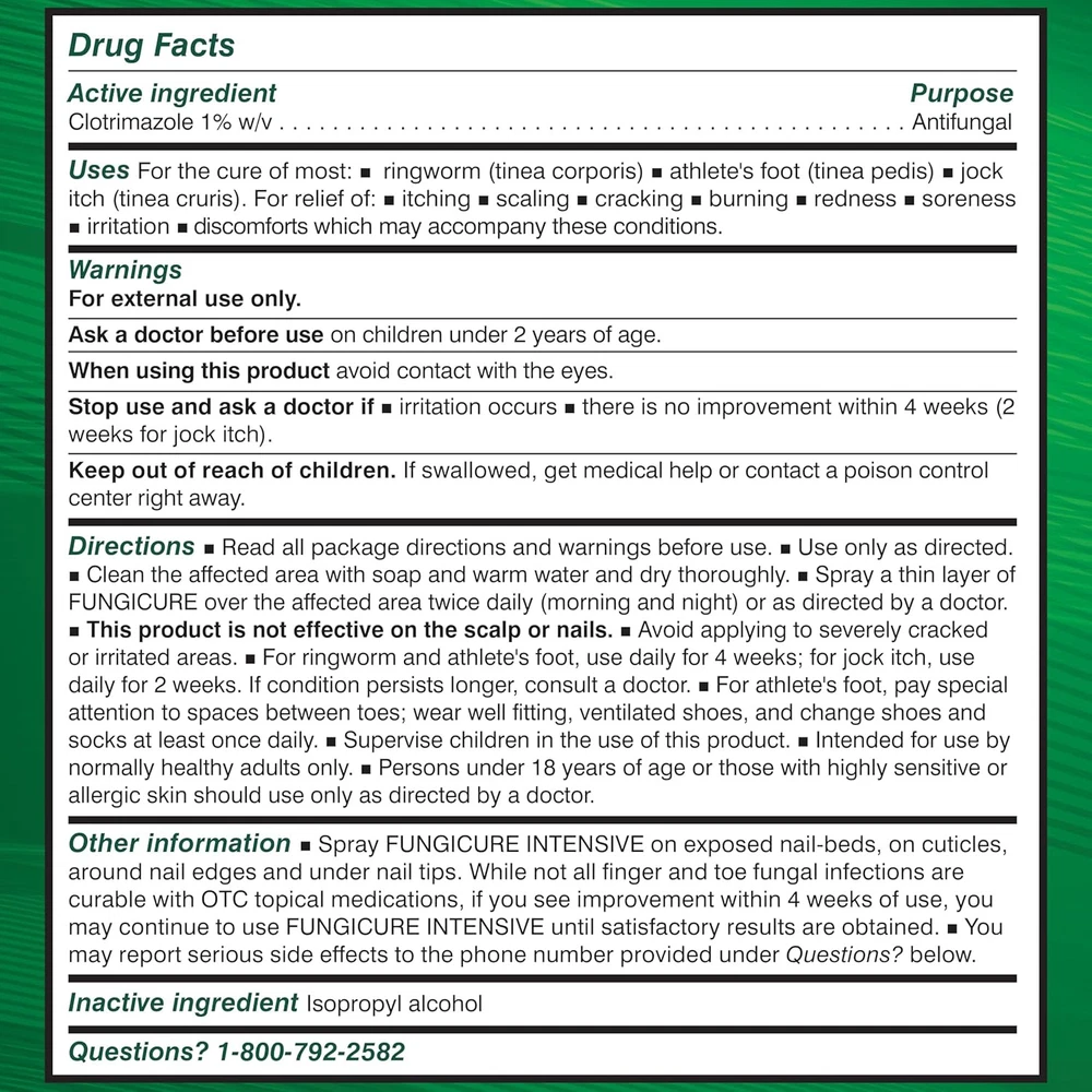 FUNGICURE Intensive Spray, Antifungal Treatment, Kills 6 2 Fl Oz (Pack of 1) Product Details Is Discontinued By Manufacturer : No Product Dimensions : 5 x 1.94 x 1.81 inches; 2 ounces Item model number : 1005060 Manufacturer : Alva-Amco Pharmacal Cos., Inc Brand: FUNGICURE Item Weight: 2 Ounces Item dimensions L x W x H: 5 x 1.94 x 1.81 inches Active Ingredients: Clotramizole Number of Items: 1 Stop the fungus fast: FUNGICURE Intensive Anti-Fungal Treatment Liquid helps relieve the itching, burning, cracking, & discomfort of finger & toe fungus. Convenient spray eliminates exposed nail-bed fungus & allows for natural re-growth of healthy tissue Easy to use: Our Intensive Anti-Fungal Treatment Liquid helps halt the growth and reproduction of fungal cells on toes and fingers--including on the skin around nail edges & under nail tips to help treat & eliminate discomfort. Easy-use pump spray bottle Ditch the socks worn to conceal embarrassing finger & toe fungus. Help relieve the cracking, burning, itching & discomfort. FUNGICURE Intensive Anti-Fungal Spray delivers medication directly to infections for effective treatment Start treatment now! Fungal infections on your toes won't clear up overnight, and non-drug treatments can let the infection fester. Plus, promptly treating fungus between toes can help prevent spread of infection to the toenails Leading producer: Alva-Amco is a leading U.S. Producer of specialty non-prescription pharmaceuticals, dietary supplements, and skin care products. Alva-Amco has a history of product innovation, quality & consumer satisfaction in over the counter products INDICATIONS:Fungi Cure Intensive Anti Fungal Treatment Easy Pump Spray Fungicure works on exposed nail-bed surfaces where nails are missing, cracked open or otherwise breached, as well as on infected surfaces around, adjacent to and under nails wherever reachable with the convenient Fungicure Pump Spray applicator. The active ingredient in Fungicure is recognized by the FDA to be safe and effective when used as directed.
