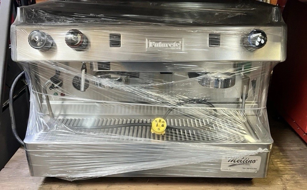 This is a Futurete espresso machine that is semi-automatic and designed for commercial use. It has a silver color and features a direct water connection source. The machine is made in Portugal and has a model number of Futurete. It also has a hot water faucet and a removable drip tray for easy cleaning. The voltage is 220 VTs 60Hz.