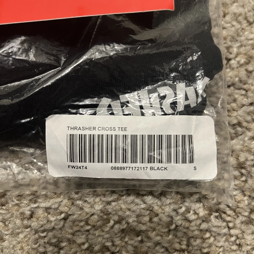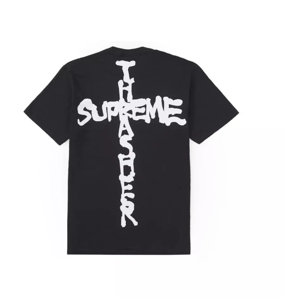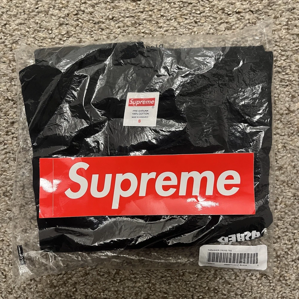 Introducing the FW24 Supreme x Thrasher Cross T-Shirt, a limited edition item featuring a solid pattern with short sleeves and a crew neckline. This black cotton t-shirt is perfect for any skater girl or boy who loves the Thrasher theme. The shirt is available in size small, and it comes in a pack of 1. This Supreme x Thrasher Cross T-Shirt is a must-have for any fan of the Thrasher brand. It is a regular fit and suitable for all seasons. The t-shirt features the iconic Thrasher logo and is part of the Supreme x Thrasher product line. It is perfect for any unisex adult. The shirt is made in the United States and is a unique item that is perfect for any collector.