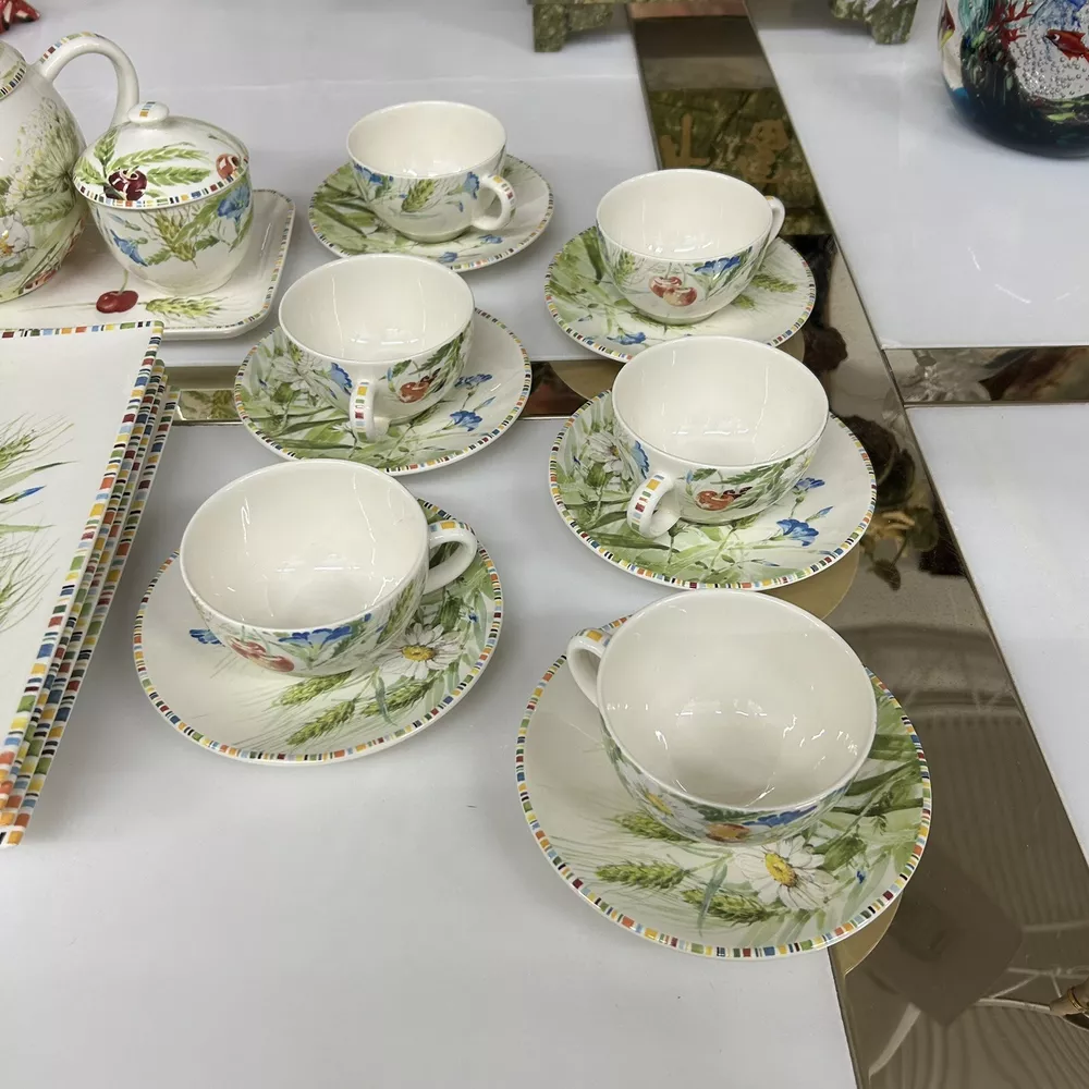 This beautiful Faïencerie de Gien Cherry Full Breakfast Set in the GIECHER pattern is the perfect addition to any collector's kitchen. Made in France using traditional pottery techniques, this vintage set includes a round plate, cup, and plate set. The multicolor design features a charming cherry motif that adds a touch of whimsy to any table setting. Crafted from a combination of porcelain and ceramic, this set is both durable and functional. Ideal for breakfast or any special occasion, this Gien brand set is sure to impress. In perfect condition no damage