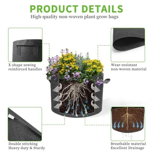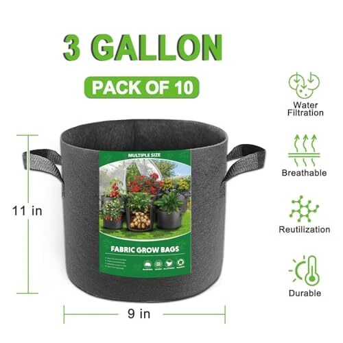 Return Policy Fast Delivery Trusted seller Fabric Grow Bags,3 Gallon-10 Pack Vegetable/Flower/Plant Growing pots Indoor and Outdoor Flower Pots,Aeration Plant Container Felt Grow Pots with Handles Non-Woven Product Description 【3 Gallon Grow Bags】:Ideal for growing tomatoes and strawberries, bell peppers and more, and the price of a pack of 10 is a better deal than any other planter. Planting bags make a practical gift for gardening enthusiasts. 【Highly Practical】:Grow bags provide excellent airflow and drainage. Increased airflow and faster drying times improve oxygenation to the roots of your plants, allowing them to breathe freely and grow healthier! In addition you can water your plants through the side of the fabric. 【Portable Garden Solutions】: The reinforced handles are X-stitched to hold more weight and ensure that you can support a bag full of soil. You can easily move them in and out of sun and shade to accommodate changing sun or weather conditions. 【Reasons for choice】:Planting bags as compared to plastic pots not only provide ample space for root spreading and t is no root rot from standing water, these are highly recommended to grow your vegetable garden in an economical way. 【Reusable】: Non-woven garden fabric planting bags are made of thickened non-woven material, durable, abrasion-resistant, washable and worth using all year round. Sturdy structure, can be reused for many years. Shipping Returns Payment Shipping Shipping is FREE to all addresses other than APO/PO boxes in the lower 48 states. All our stock ships from US-based warehouses. Shipped via USPS or UPS (depending on location and package weight) Unless stated otherwise, all orders will ship within 24-72 hours of your payment being processed. Check our feedback to see the great reviews of FAST shipping we offer. Returns Seller does not accept returns Payment We currently accept payment via eBay managed payments only. Once payment is cleared, we will dispatch your shipment within 1-3 business days. Please refer to the "Shipping" tab for more information regarding shipping speed to your destination.