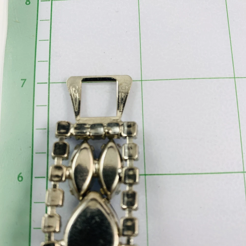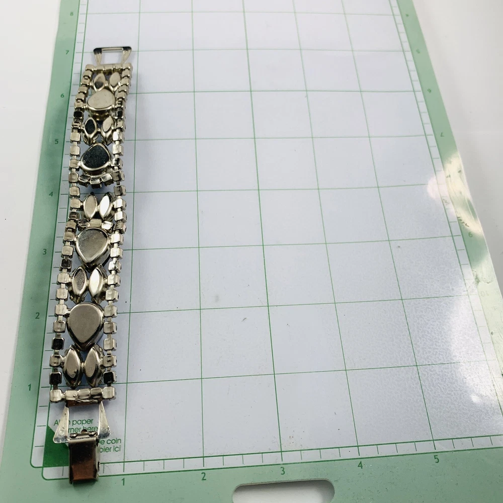 Brand: Estate Theme: Beauty, Fashion & Costumes Metal Purity: Unknown Closure: Fold Over Signed: No Type: Bracelet Vintage: Yes Item Length: 7 in Setting Style: Prong Department: Women Jewelry Department: Fashion Style: Tennis Country/Region of Manufacture: Unknown Metal: Silver Tone Material: Rhinestone Seller Notes: “See the description area and photos for full condition details. Pre-Owned Estate Jewelry.” Base Metal: Unknown Country of Origin: Unknown Occasion: Wedding, Valentine's Day, Mother's Day, Graduation, Engagement, Confirmation/Communion, Christmas, Birthday, Anniversary, Everyday Wear, All Ocassion
