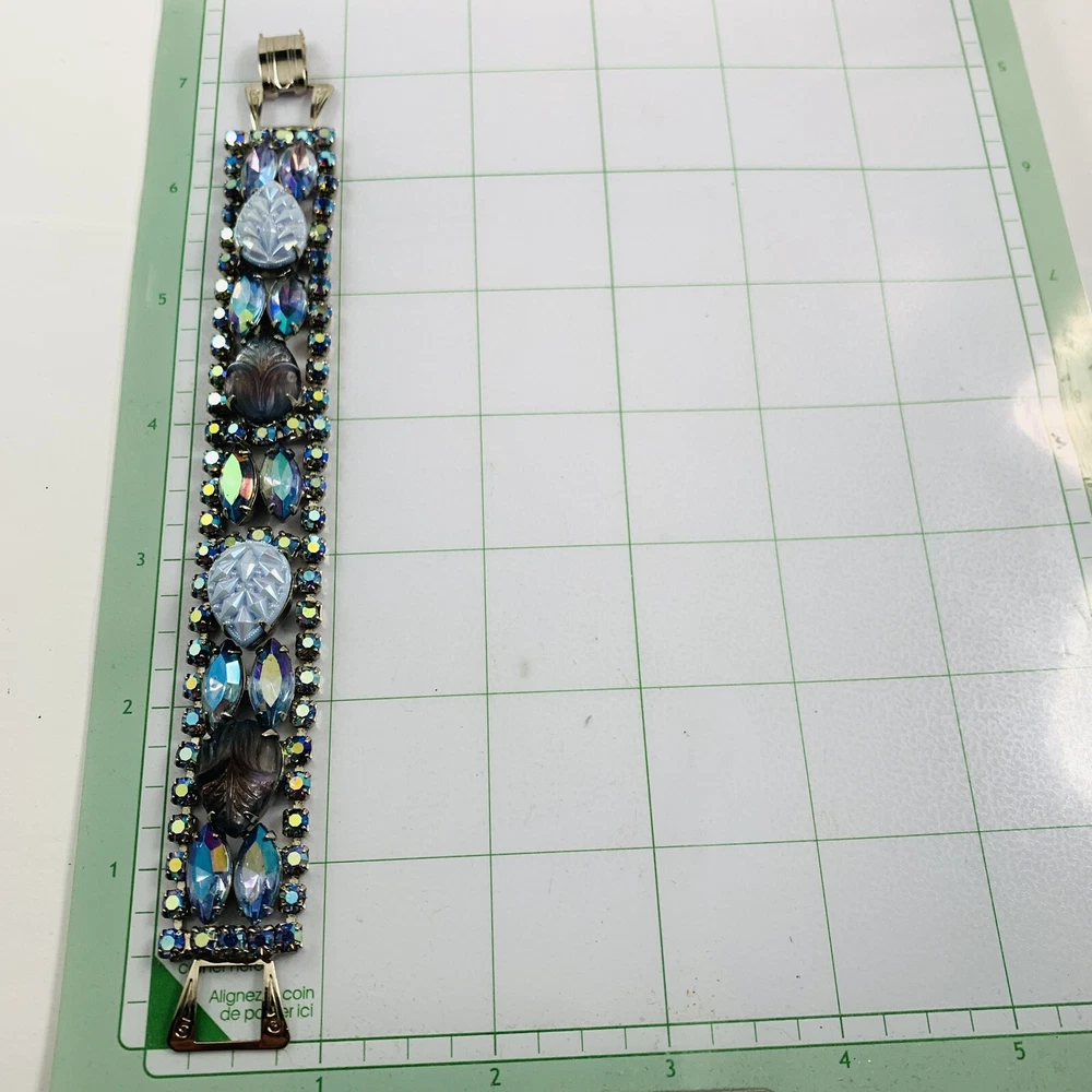 Fabulous Vintage Aurora Borealis AB Rhinestone Silver Tone Bracelet 7" Long. Pre-Owned Estate Jewelry in Very Good Condition. Ready to wear, give as gift or add to a collection. Our Vintage items are mostly from estate sales and vary in age from 100+ years old to more modern pieces. Please use your judgement. Items are photographed on a measuring matte with one-inch squares to give you an idea of size. Any photography props / holders you see are not included.