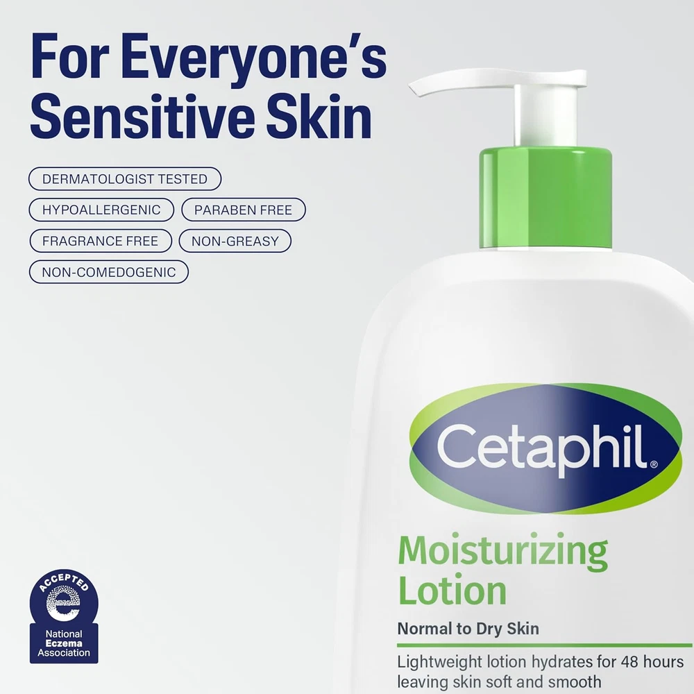 Face & Body Moisturizer, Hydrating Moisturizing Lotion for All Skin Types Product Details CETAPHIL FACE & BODY MOISTURIZING LOTION FOR ALL SKIN TYPES: Lightweight, fast absorbing, non-greasy body lotion that's ideal for use on the entire body INSTANTLY SOOTHES AND PROVIDES 48 HOUR HYDRATION: Immediately boosts skin hydration and continues to strengthen skin moisture barrier throughout the day IDEAL FOR USE ON THE ENTIRE BODY: Non-greasy, formula absorbs quickly and is excellent for hands, feet, elbows and knees DERMATOLOGIST BACKED INGREDIENT BLEND: With hydrating glycerin and skin essential vitamins B5 (panthenol) and B3 (niacinamide) DEVELOPED FOR EVEN THE MOST SENSITIVE SKIN: The hypoallergenic, non-comedogenic formula is free of parabens and fragrance DEFENDS AGAINST 5 SIGNS OF SKIN SENSITIVITY: Dryness, irritation, roughness, tightness and a weakened skin barrier Find skin care that works for you with CETAPHIL Moisturizing Lotion, a lightweight and fast absorbing moisturizer designed to comfort and hydrate all skin types. The unique formulation of skin essential vitamin E and 6 moisturizing ingredients provides instant lightweight hydration that leaves skin soft and smooth. And now formulated with a new blend of key ingredients: hydrating glycerin, panthenol (vitamin B5) to hydrate, soothe and preserve the skin barrier, and niacinamide (vitamin B3) to help smooth skin texture and retain skin moisture barrier. Water binding agents deeply replenish the skins moisture and prevent moisture loss, providing long lasting 48 hour hydration that completely restores the skins moisture barrier in one week, helping to defend against 5 signs of skin sensitivity. Fragrance free, lanolin free, paraben free and sulfate free, this gentle lotion is clinically tested for even the most sensitive skin. Treat your skin right thanks to the gentle, non-comedogenic formula, providing instant, everyday moisturizing care that leaves skin immediately feeling soft, smooth and replenished. Item model number 0299.011141 Item dimensions L x W x H 3.54 x 1.18 x 7.87 inches Item Volume 20 Fluid Ounces Special Feature Non Comedo Product Dimensions 3.54 x 1.18 x 7.87 inches; 1.25 Pounds Country of Origin Canada Age Range (Description) Adult Scent Unscented Size 20 Fl Oz (Pack of 1) 1.18 inches x 3.54 inches x 7.87 inches. Weight: 1.25 lb Payment Details We accept all payments via Ebay using Credit Cards , PAYPAL , Apple Pay and many others Shipping Details We are always working hard to ensure your package arrives as soon as possible. Please understand that some factors like weather, high postal traffic, and the performance of shipping companies are outside of our control. Delivery & Return Policy Details We offer a 30-Day Return Policy on items in which you are not completely satisfied with. You have the option of a full-refund or an exchange of the item. No returns are available on items shipped outside of the USA.