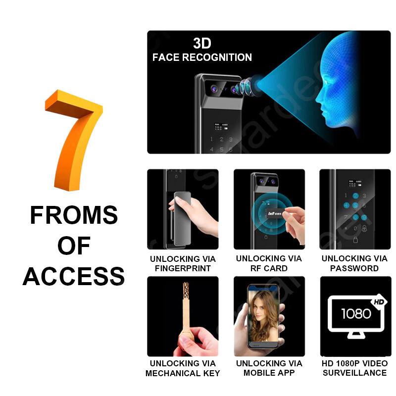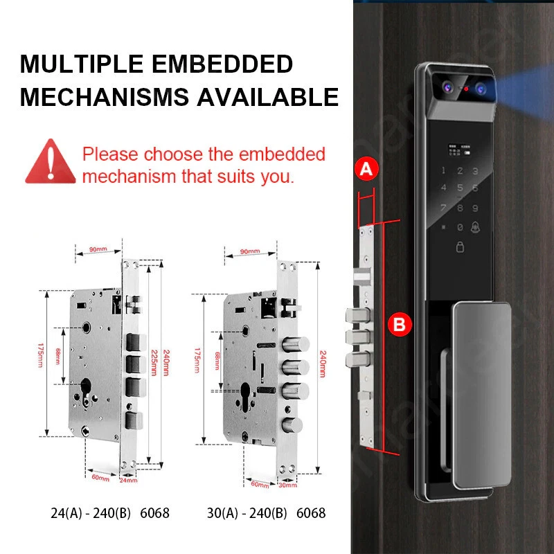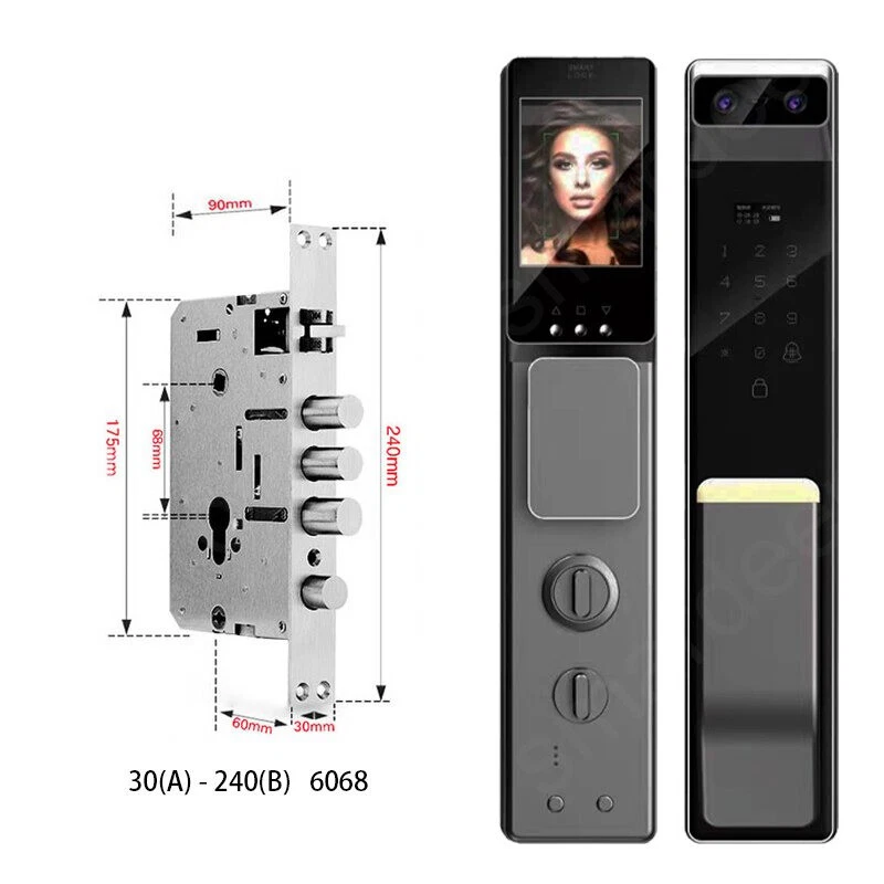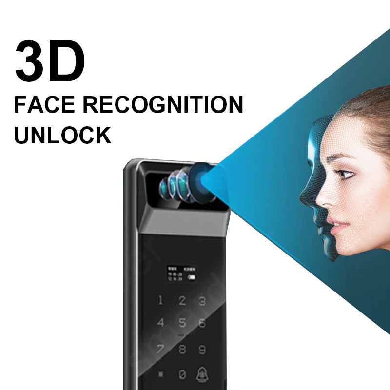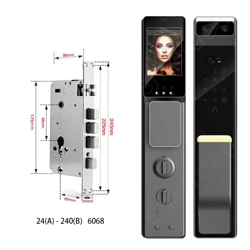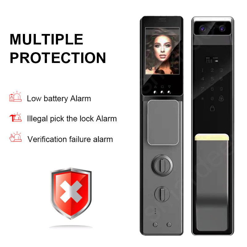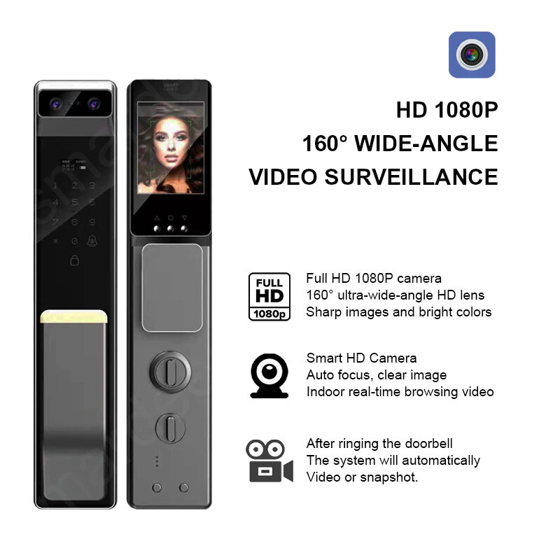 Face Recognition Smart Lock with HD Video Camera,Biometric Fingerprint Lock for Front door with Smart Doorbell,Password. Why do you need a smart lock? Will you forget to bring the key or lose it? When you are not at home, your friends do not visit, and you are worried about your home being stolen while you are away. All these smart locks will solve you. You can remotely authorize the unlocking password to unlock the lock through the Tuya APP, and record every unlocking record for you. Combined with other Tuya smart products, you will enjoy a smarter and safer life. Product Features - Support facial recognition, biometric fingerprint, password, IC card, mechanical key, mobile phone multiple unlocking methods - Fully automatic unlocking and locking, easy to use - 5000mAh rechargeable lithium battery. A full charge can work for 5 months - Built-in HD 1080P smart cat's eye surveillance camera - Built-in smart doorbell, take pictures and videos automatically when the doorbell is pressed - Compatible with left and right door opening directions Product Parameter - Unlocking method: Facial recognition, biometric fingerprint, password, IC card,key,App - Fingerprint capacity: 100 - Password capacity: 100 - IC Card capacity: 100 - Face capacity: 100 - Alarm type: Low battery alarm/pry door alarm - Emergency power supply: Micro USB - Power supply: 7.4v-5000mA lithium battery - Working temperature: -20 to +50°C - Working humidity: 40% to 85% (No condensation) - Packing size: 350*78*185mm Smart Home Integration:Compatible with Tuya smart products for a seamless smart home experience. High-Tech Security Features:Equipped with a built-in HD camera, smart doorbell, and anti-theft lock body for enhanced security. Extended Battery Life:Boasts a 5000mAh lithium battery for 5 months of operation without frequent recharging. Electronic Keyless Door Lock|Smart Lock That Goes Over Deadbolt|Multiple Unlocking Methods:Offers versatile access with facial recognition, biometric fingerprint, password, IC card, key, and App. Versatile Door Compatibility:Suitable for various door types including brass, stainless steel, and wood, with a fit door thickness of 40-120mm.