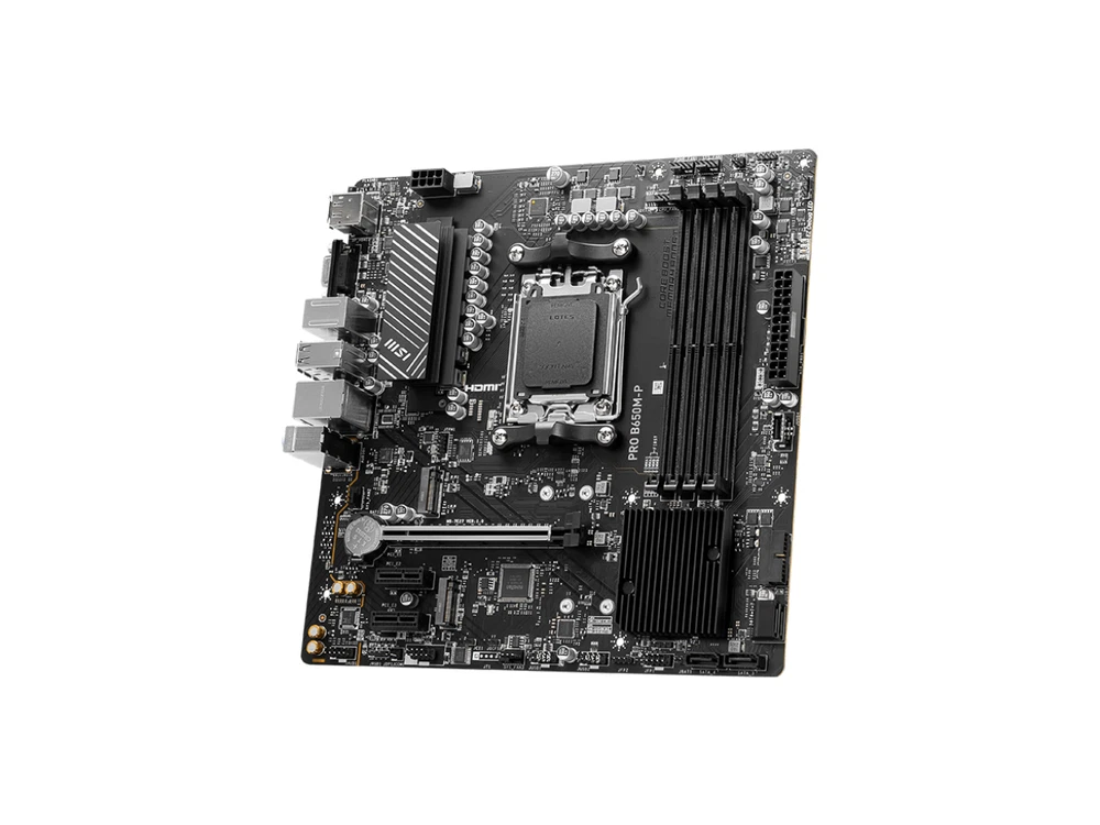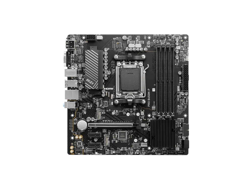 MSI factory refurbished unit, 120 days MSI direct warranty, comes with SATA cable, I/O shield only. Model Brand MSI Model PRO B650M-P Supported CPU CPU Socket Type AM5 CPU Type Supports AMD Ryzen 7000 Series Desktop Processors Chipsets Chipset AMD B650 Memory Number of Memory Slots 4x288pin (DDR5) Memory Standard Memory Support DDR5 6000+(OC)/ 5800(OC)/ 5600(OC)/ 5400(OC)/ 5200(OC)/ 5000(OC)/ 4800(JEDEC) MHz Max. overclocking frequency: - 1DPC 1R Max speed up to 6000+ MHz - 1DPC 2R Max speed up to 6000+ MHz - 2DPC 1R Max speed up to 6000+ MHz - 2DPC 2R Max speed up to 6000+ MHz Maximum Memory Supported 192GB Channel Supported Dual Channel ECC Supported Non-ECC Buffer Supported Un-buffered Memory Feature Supports AMD EXPO Expansion Slots PCI Express 4.0 x16 1x PCI-E x16 slot PCI_E1 Gen PCIe 4.0 supports up to x16 (From CPU) PCI Express x1 2x PCI-E x1 slot PCI_E2 Gen PCIe 3.0 supports up to x1 (From Chipset) PCI_E3 Gen PCIe 3.0 supports up to x1 (From Chipset) Storage Devices SATA 6Gb/s 4 x SATA 6Gb/s M.2 2x M.2 M.2_1 Source (From CPU) supports up to PCIe 4.0 x4 , supports 2280/2260 devices M.2_2 Source (From Chipset) supports up to PCIe 4.0 x4 , supports 2280/2260 devices SATA RAID Supports RAID 0, RAID 1 and RAID 10 for SATA storage devices Supports RAID 0 and RAID 1 for M.2 NVMe storage devices Onboard Audio Audio Chipset Realtek ALC897 Codec 7.1-Channel High Definition Audio Audio Channels 7.1 Channels Onboard LAN LAN Chipset Realtek 8125BG 2.5G LAN Max LAN Speed 2.5Gbps Rear Panel Ports Back I/O Ports 1 x D-Sub / 1 x DisplayPort / 1 x Flash BIOS Button / 1 x HDMI / 1 x LAN (RJ45) / 1 x PS/2 Keyboard/Mouse Combo / 2 x USB 3.2 Gen 1 Type-A / 2 x USB 3.2 Gen 2 Type-A / 3 x Audio Jacks / 4 x USB 2.0/1.1 Internal I/O Connectors Onboard USB 4x USB 2.0 ports 2x USB 3.2 Gen1 Type A ports 1x USB 3.2 Gen2 Type C ports Other Connectors 1x Power Connector(ATX_PWR) 1x Power Connector(CPU_PWR) 1x CPU Fan 1x Pump Fan 3x System Fan 2x Front Panel (JFP) 1x Chassis Intrusion (JCI) 1x Front Audio (JAUD) 1x Com Port (JCOM) 2x Addressable V2 RGB LED connector (JARGB_V2) 2x RGB LED connector(JRGB) 1x TPM pin header(Support TPM 2.0) Physical Spec Form Factor Micro ATX Dimensions (W x L) 9.6" x 9.6" Windows 11 Compatibility Windows 11 Supported