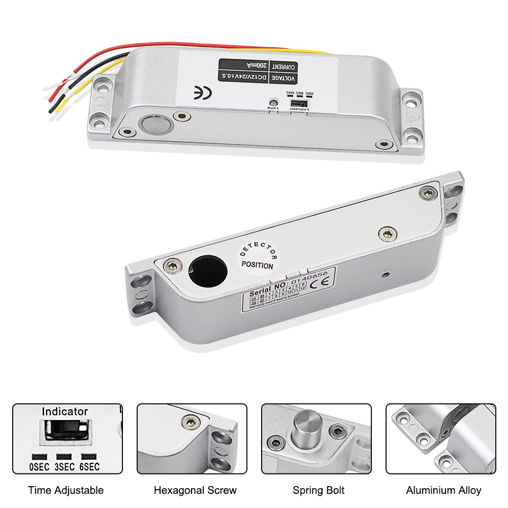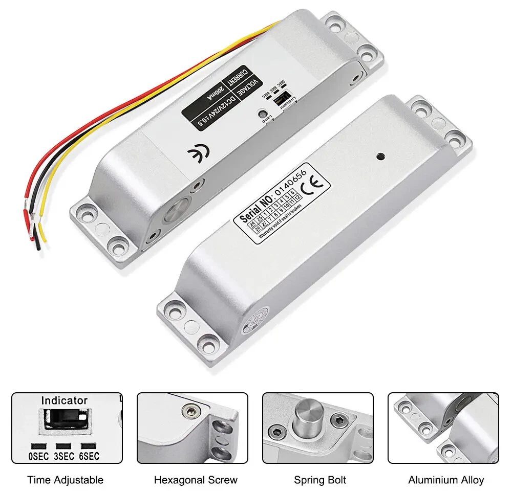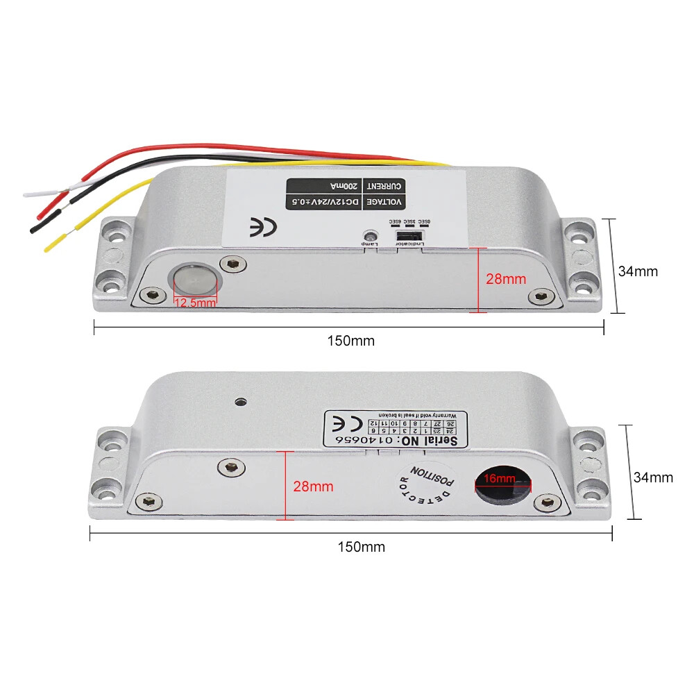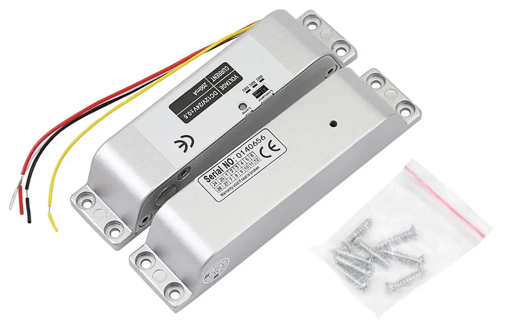 High Quality DC12V Fail Safe Electric Drop Bolt Lock for Door Access Control Security System This door lock is special in design with durable material. It can protect your home or business shops. Low operational and standby current. It's especially suitable for glass doors. Great choice for you. Product Features 1) 100% brand new and high quality. 2) Secure mode: The door will lock while supplied with power, and unlock without power. 3) Especially suitable for wooden and metal doors. 4) It is made from durable and high aluminium alloy material, durable for use. 5) Special circuit design, the door will unlock until the power is cut off. 6) With no external interference, making it more stable and safer. 7) Has 0, 3, 6 seconds time delay adjustable. Product Specifications Material: Aluminium Alloy Working Voltage: DC12V Lock Mode: Magnetic induction Dimension: 150*34*28 mm Lock Mode: Magnetic induction Secure Mode: NC model/ fail safe model ( Locked when power on, unlocked when power off ) Working Current: star-up: 1.2A, operating: 0.25A Unlocking and locking indicator The red light indicates unlocking and the green light indicates locking Delay adjustment: Delay Time can be preset to 0s / 3s / 6s Suitable for wooden door, metal door Package Including 1 x Electric drop bolt lock 1 x Pack of screws 1 x Installation Instructions Wiring Diagram Red Wire: +12VDC Black Wire: -GND Yellow wire: NC White Wire: COM If you want to test the lock, please connect the red cable to "+12v”, and black cable to “GND" of the 12VDC power supply. When you install completed access control system kit set, please connect red cable to "NC", black cable to "COM" of the power supply. Don’t need to connect the yellow and white cable. (Both of the access control keypad, power supply, door exit button are not included in the package, need to buy extra)