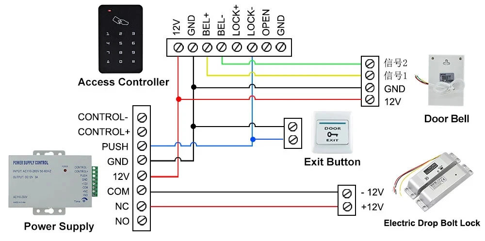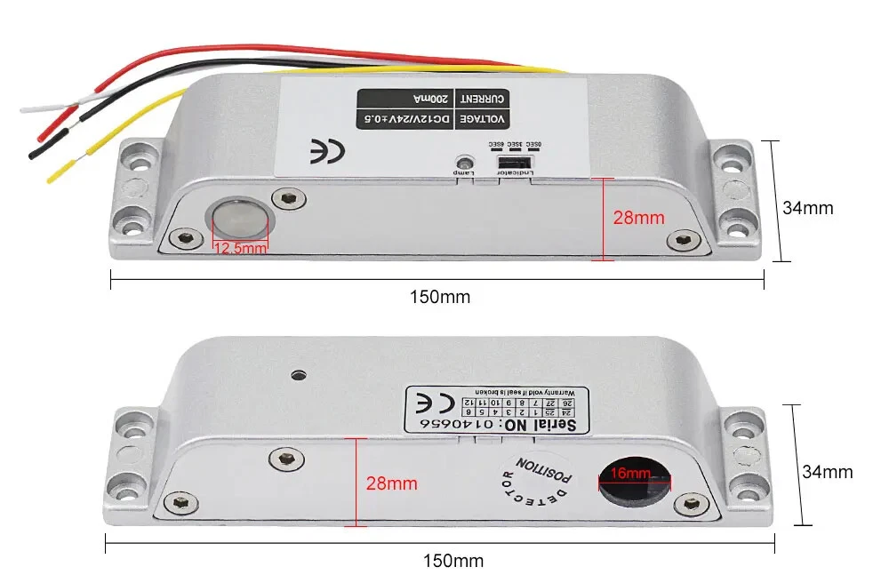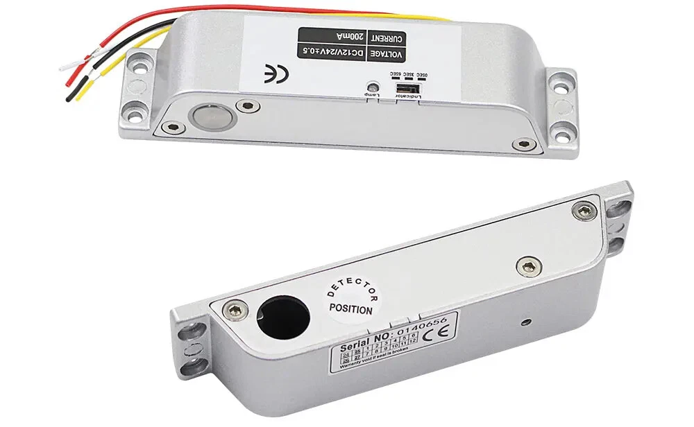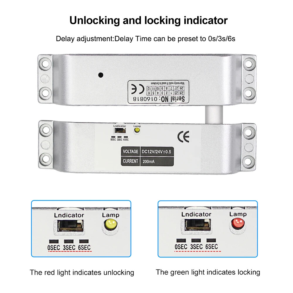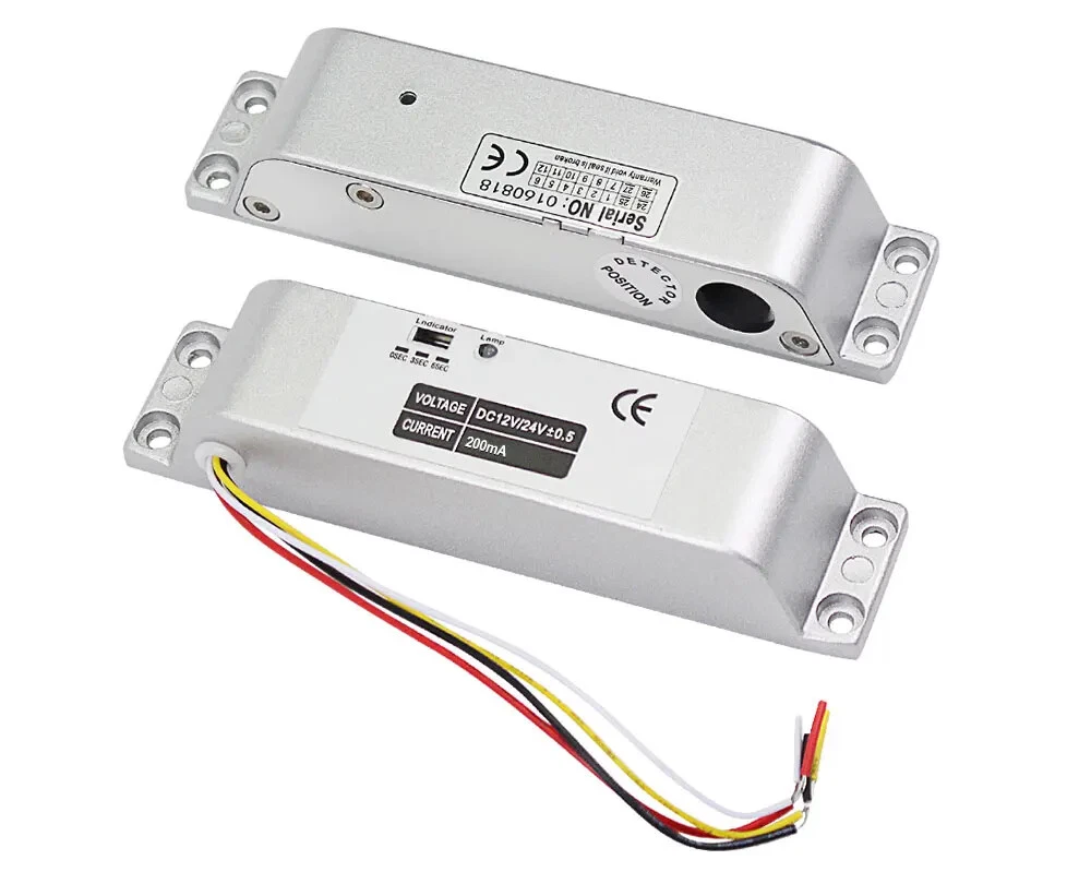 High Quality DC12V Fail Safe Electric Drop Bolt Lock for Door Access Control Security System This door lock is special in design with durable material. It can protect your home or business shops. Low operational and standby current. It's especially suitable for glass doors. Great choice for you. Product Features 1) 100% brand new and high quality. 2) Secure mode: The door will lock while supplied with power, and unlock without power. 3) Especially suitable for wooden and metal doors. 4) It is made from durable and high aluminium alloy material, durable for use. 5) Special circuit design, the door will unlock until the power is cut off. 6) With no external interference, making it more stable and safer. 7) Has 0, 3, 6 seconds time delay adjustable. Product Specifications Material: Aluminium Alloy Working Voltage: DC12V Lock Mode: Magnetic induction Dimension: 150*34*28 mm Lock Mode: Magnetic induction Secure Mode: NC model/ fail safe model ( Locked when power on, unlocked when power off ) Working Current: star-up: 1.2A, operating: 0.25A Unlocking and locking indicator The red light indicates unlocking and the green light indicates locking Delay adjustment: Delay Time can be preset to 0s / 3s / 6s Suitable for wooden door, metal door Package Including 1 x Electric drop bolt lock 1 x Pack of screws 1 x Installation Instructions Wiring Diagram Red Wire: +12VDC Black Wire: -GND Yellow wire: NC White Wire: COM If you want to test the lock, please connect the red cable to "+12v”, and black cable to “GND" of the 12VDC power supply. When you install completed access control system kit set, please connect red cable to "NC", black cable to "COM" of the power supply. Don’t need to connect the yellow and white cable. (Both of the access control keypad, power supply, door exit button are not included in the package, need to buy extra)