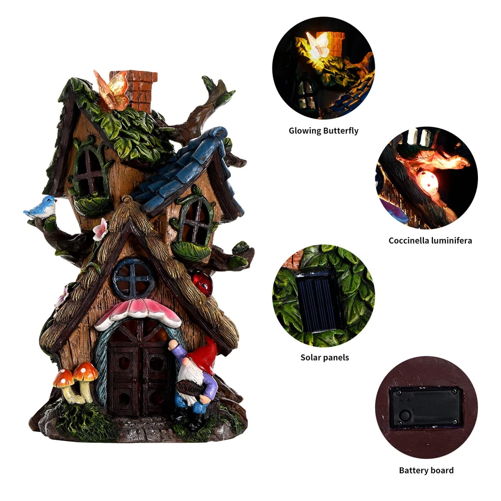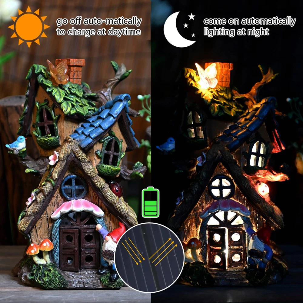 【EXCELLENT DESGIN】:Inspired by fairy tales,the mystic fairy house with garden gnome, bird and butterfly flying around, ladybug crawling on the branch, mushrooms growing at the wood door, the colorful roof is covered in tile and tree branches. is a great addition to your garden, yard, patio, lawn or indoor. Turn on the solar light at night, soft and warm light reveals from the tree house window, creating a whimsical miniature wonderland! PERFECT GIFTS:The fairy garden tree house is 11 Inch,act as a surprise gift for your family, friends and fairy lovers on Christmas,Thanksgiving, Halloween, Birthdays and Housewarming.They will be satisfied with vivid design and well made details. HIGH QUALITY:The fairy garden figurine with a funny gnome,made of sturdy resin and hand painted with UV resistant paint. Exceptional craftsmanship protect against rain, snow or scorching sun EASY TO USE:No wiring is required. Turn the figurine on and leave it in the “on” position during the daytime. The solar panel charge during the daylight and light up automatically at night. The LED lights charge within 5-8 hours and light up for 8-10 hours. Eco-friendly and save energy. BUY NO WORRIES: Any issues with the fairy house statue, please feel free contact us. We offer friendly customer service.