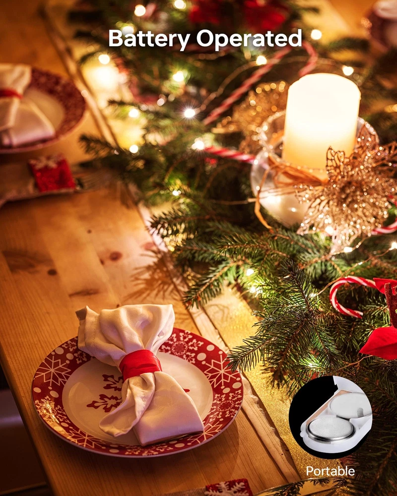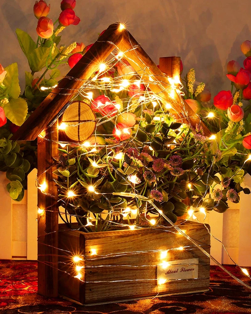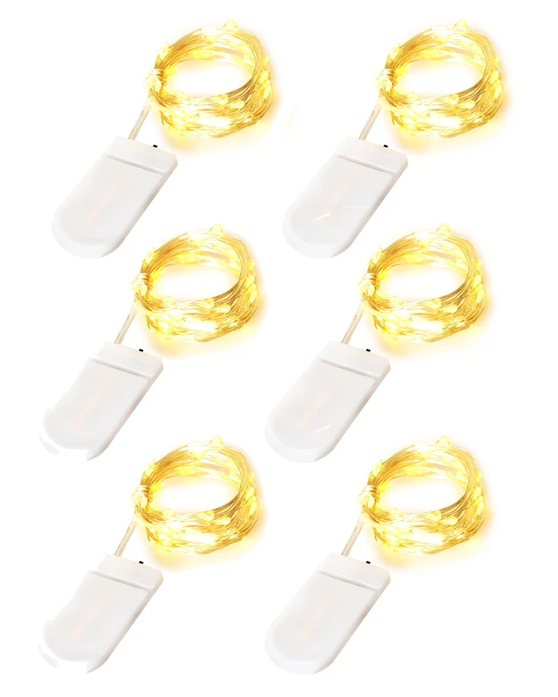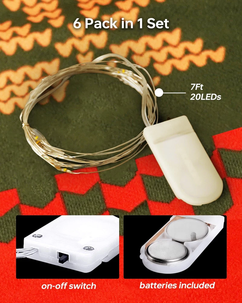 6pack warm white fairy lights Package Contains: 6 Set Fairy Lights. Per string lights is 7 Ft with 20 LED micro bulbs. The wire with LEDs: 6.5 Ft, lead cord without lights: 0.5 Ft, space between neighbouring LEDs: 4 Inch. Ideal length for table centerpieces and crafts ornaments Battery Operated: Preinstalled with 2 button batteries, the christmas lights can stay glowing over 24 H. It's easy to turn on or off the mini lights via the switch on the battery case. The battery operated lights is portable to taken to anywhere you want Easy to DIY: The mason jar lights adopts premium insulated silver wire that is flexible to bend and mold. Using 3V low voltage, the led fairy lights will not overheat after long time working and it's safe to touch without worry IP56 Waterproof: The waterproof rating of the starry lights is IP56, which is suitable for outdoor decoration, such as outside wedding, birthday, engagement, celebration party etc. Notes: The battery case is Not waterproof Adding Ambience: Steady on mode, no dazzling, fairy lights battery operated will offer bright and cozy illumination, adding festive atmosphere for Christmas, Thanksgiving, Halloween, Valentine's day etc, giving more joy for life