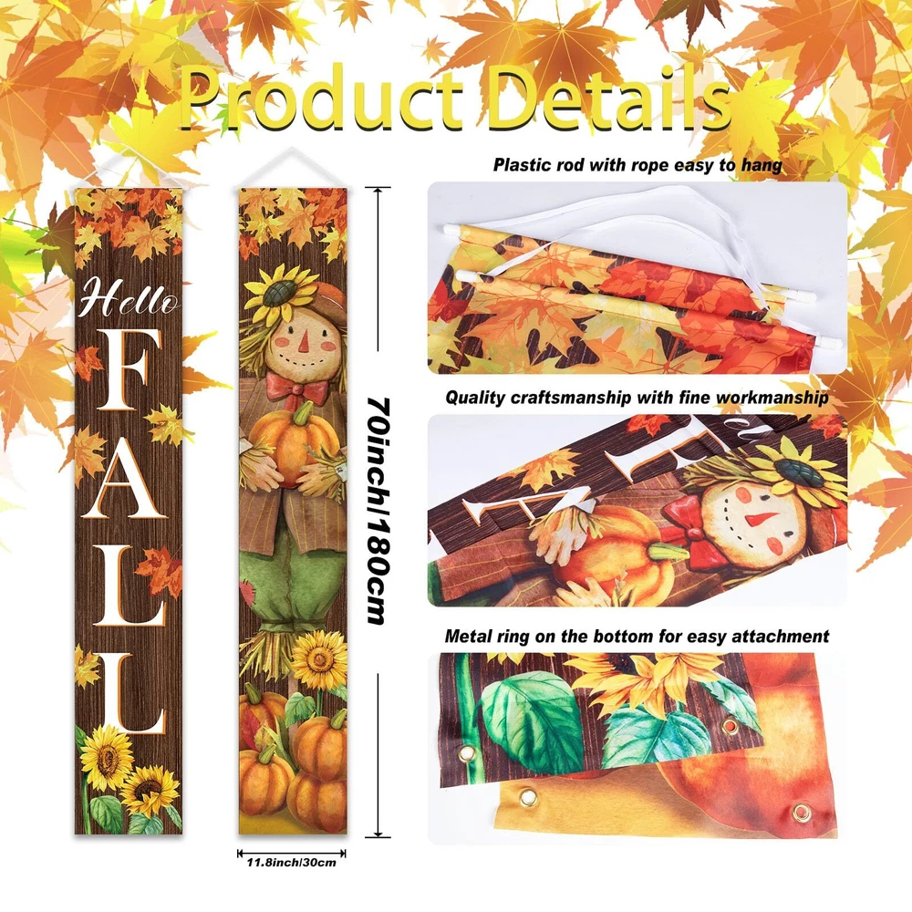 Fall Party Decor Pumpkin Scarecrow Porch Banner Our Fall porch banner has an innovative design that says Hello Fall and a fun scarecrow motif that shows the joy of the fall harvest, and the pumpkin and maple leaf accents bring the whole couplet to life. Product Specifications: Item: Hello Fall Proch Sign Material: Premium vinyl; Size: 71 x 12 inches (30 cm * 180 cm) (L x W); Color: Multi-color Packaging: 1 x Hello Fall Banner, 1 x Scarecrow Banner We want to create a fall-themed party environment for you, so we have crafted high-quality Hello Fall banners that can be used both outdoors and indoors. Features: Waterproof, scratch-resistant, seamless and colorfast This fall front door banner can be used to welcome your house guests or host a party, suitable for any deck, patio, tent, porch, window, wall or balcony, add a charming decorative effect to any backyard, lawn or garden. Notes: 1.If the banner has creases, please iron it gently. 2. It is recommended to add some weight at the bottom so that it won't fly around with the wind. 3. Due to manual measurement, the size may have some error. 4. Please understand that the color of the product may vary slightly due to different screen display settings for each person. FALL PORCH DECOR: Add a festive touch to your home with our fall porch decor! You will receive 2 pieces of fall scarecrow porch sign, measuring approximately 30 x 180 cm/12 x 71 inches; they are suitable for your door and other spaces that need seasonal ambiance EASY TO HANG: Our fall scarecrow outdoor porch banners come pre-assembled with poles and ropes, you can hang them anywhere, such as in front of doors, ceilings, windows, gardens, patios, porches, entrances and more RELIABLE MATERIAL: The fall pumpkins outdoor porch signs are made of high quality polyester material, lightweight, durable and colorfast; you can fold them up and store them for next time use SPREAD THE JOY OF THE HARVEST: The fall Thanksgiving banner features a fun scarecrow print and [hello fall]; our fall Thanksgiving porch decorations are perfect for decorating for fall gatherings and will be the highlight of all of your decorations WIDELY APPLIED: Hang our fall porch banner on fireplaces, front doors, windows, yards, walls and more to create a harmonious atmosphere and add a nice ambiance to family gatherings and Thanksgiving celebrations. Perfect for fall decorations inside or outside the home