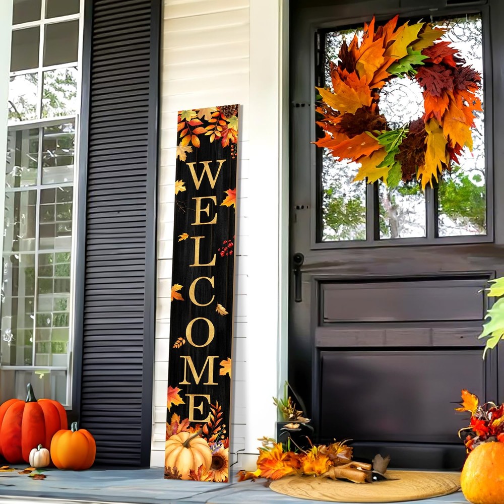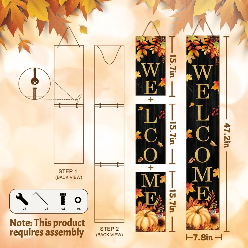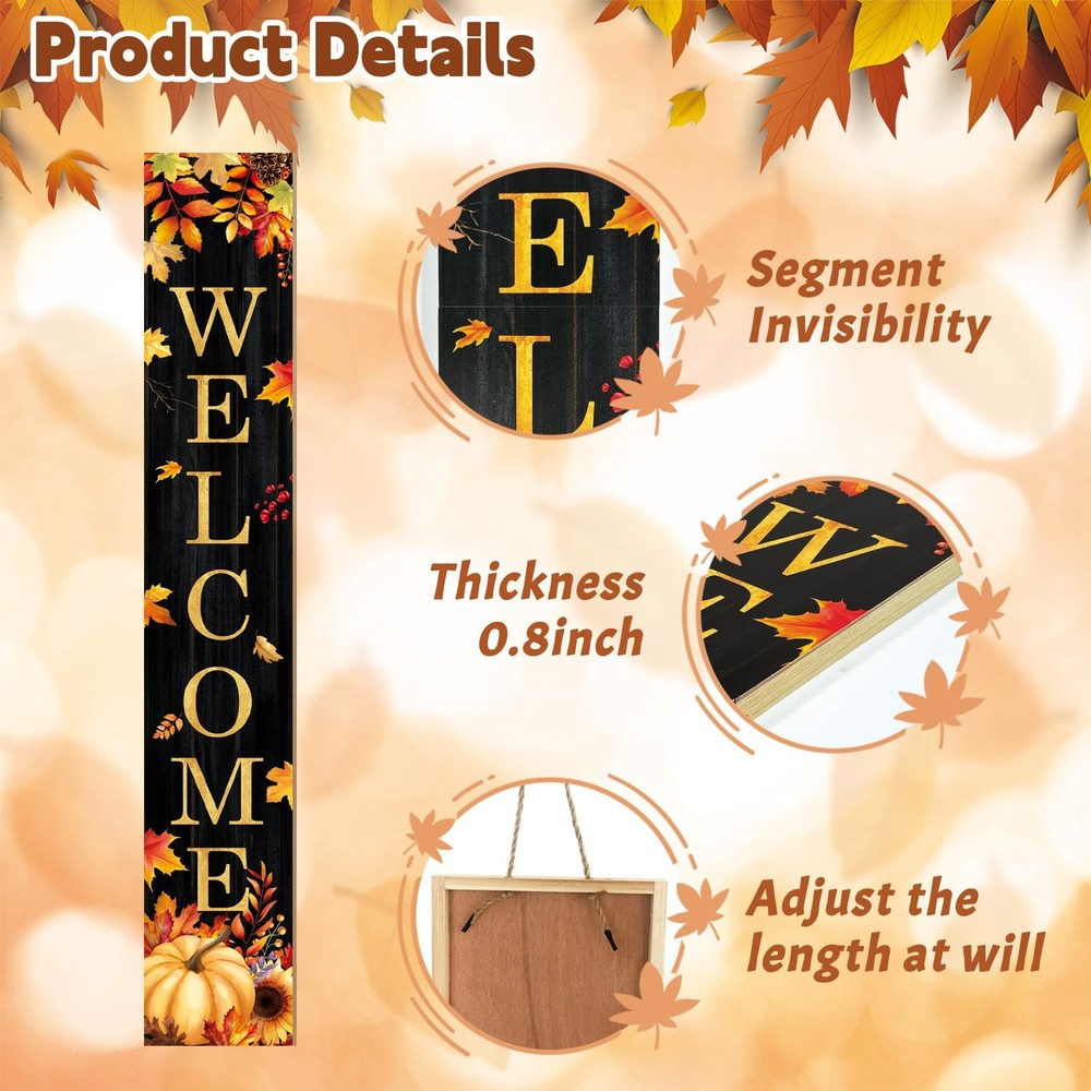 Fall Welcome Porch Sign, Maples Signs for Front Porch, Gold Pumpkin 【Fall Charm】 Welcome the warmth of the season with this wooden fall porch sign, designed to bring a cozy and festive feel to your home. Set against a deep black background that makes every detail stand out, the sign features the warm greeting “Welcome” in bold lettering—inviting all who pass by to enjoy the spirit of autumn. The design beautifully captures the essence of the harvest season, with golden maple leaves and rich fall foliage swirling across the surface. At the bottom, a bright pumpkin sits beside a blooming sunflower, accented with red berries and rustic pinecones, bringing together nature’s favorite fall touches in one welcoming display. 【Flexible Display】 Measuring a full 47.2" when assembled, this sign is made up of three separate wooden panels, each approximately 15.7" x 7.8" in size. The included hardware allows for easy vertical assembly, making it a bold and eye-catching addition to your front porch, hallway, or party scene. 【Made to Last】 The surface features autumn-themed graphics, including rich seasonal tones and delightful details like scattered leaves and fall pumpkins. The colors remain vivid and won’t fade easily, even with repeated seasonal use. Made from sturdy wood, this sign is built to last—perfect for bringing back cozy fall charm year after year. 【Easy Setup & Care】 Assembly is simple with the included screws and screwdriver. If the panels don’t align, just adjust the screws slightly and tighten again. Store indoors during bad weather to keep it in top shape. 【Great Gift Idea】 Whether displayed on your porch, in your hallway, or at a seasonal gathering, this fall-themed sign adds warmth and personality to any space. It also makes a thoughtful gift for friends or family who enjoy decorating for the autumn season. Halloween Porch Sign, Pumpkin Sign for Front Porch Scary Wooden Welcome Sign Yard, Vertical Wood Sign Standing for Patio Front Door Porch, Fall Pumpkin Welcome Holiday Home Party Wall Yard Home Decor Indoor Outdoor, 47x8 inch Shipping We offer FREE shipping on all orders! We ship within Three business days of payment, usually sooner. We use a selection of shipping services such as UPS, FedEx, USPS etc. We only ship to the lower 48 states, no APO/FPO addresses or PO Boxes allowed. Local pickups and combined shipping options are not provided at this time. Return You can return a product for up to 30 days from the date you purchased it. Any product you return must be in the same condition you received it and in the original packaging. Please keep the receipt. Payment We accept payment by any of the following methods: PayPal Please pay as soon as possible after winning an auction, as that will allow us to post your item to you sooner! Feedback Customer satisfaction is very important to us. If you have any problem with your order, please contact us and we will do our best to make you satisfied. Contact Us If you have any queries, please contact us via ebay. We usually respond within 24 hours on weekdays. Please visit our eBay store to check out other items for sale! Thank you for shopping at our store.
