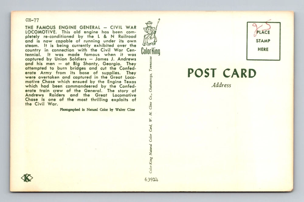 Famous Engine General Civil War Locomotive, Train, Vintage Souvenir Postcard