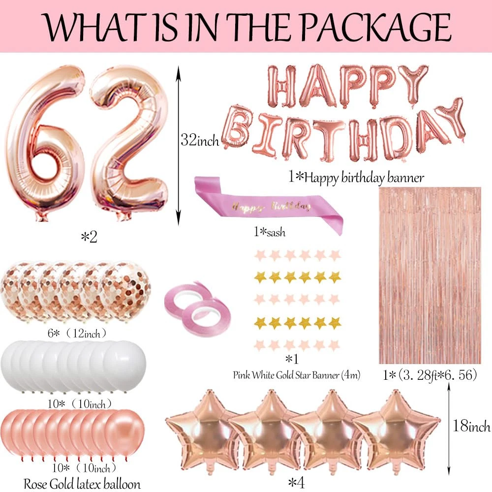 Package Include: 1.1 x "HAPPY BIRTHDAY" Banner foil balloons Rose gold--16inch 2.1 x "HAPPY BIRTHDAY" Sash Rose gold 3.4 x star shape Foil Balloons,rose gold--18" 4.2 * Number Foil Balloons,rose gold--32" 5.2 * Champagne bottle goblets Balloons--40" 6.10 * Latex Balloons.rose gold--10inch 7.6 * Latex Balloons,rose gold--12" 8.10 * Confetti Balloons, rose gold--inch" 9.1 * Tinsel Foil Fringe Curtains--40inch x 80inch 10.1 * star hanging paper banner(gold&pink)--length=4m 11.straws and ropes-1 【HAPPY 62ND BIRTHDAY】- Designed for your 62ND birthday party.The set contains everything you will need.And can be used to celebrate the 62ND birthday(Just swap the numbers). 【VALUE PACK】- As the picture appeared,the package includes:1 x "HAPPY BIRTHDAY" Banner ,star hanging banner(4m),happy birthday sash,number 6+2 foil balloons and star ballons(18inchx4pcs),26pcs latex and confetti balloons,Foil Fringe Curtains and more. 【HIGH QUALITY】- Made from high quality material. All balloons from this set are non-, safe,durable,Easy and fun to hang and assemble. 【USE TIPS】-No need to assemble, use a straw to blow the foil balloon,With self-sealing function, and then use a rope to hang them. You can also use glue to fix that on the wall. Many balloons can form the shape you want, easy to use. 【RISK-FREE 】- Each product has been carefully inspected and can be purchased with confidence. Once you have any questions, we will , so that you are 100% satisfied.