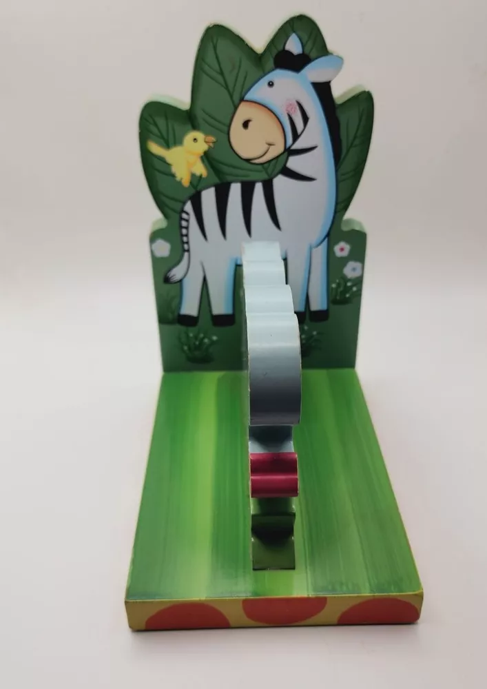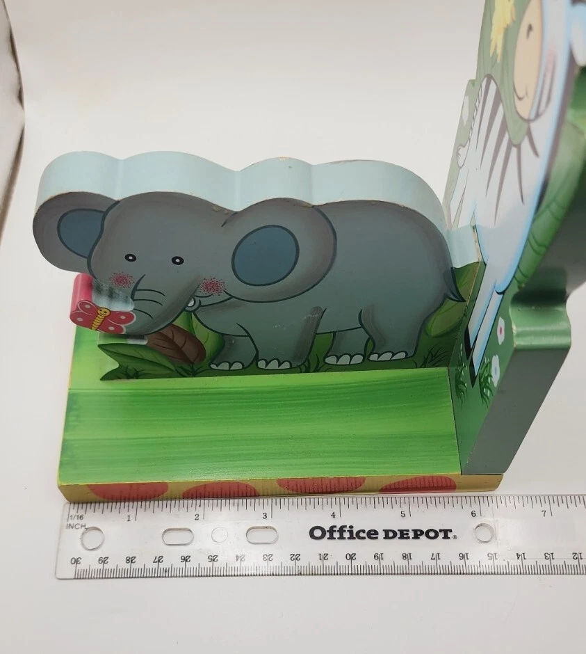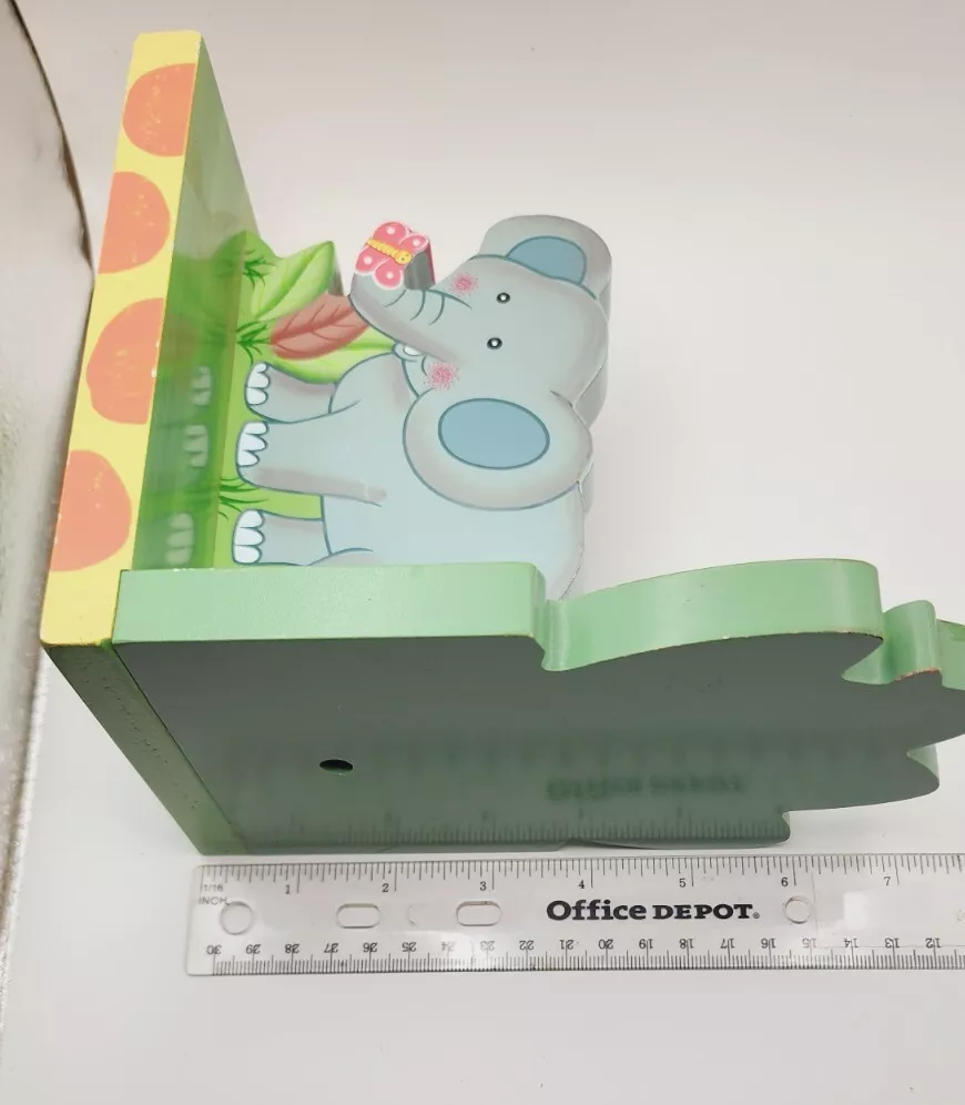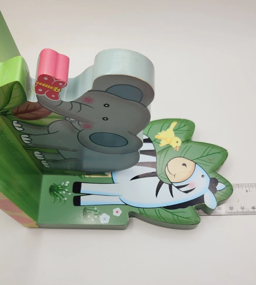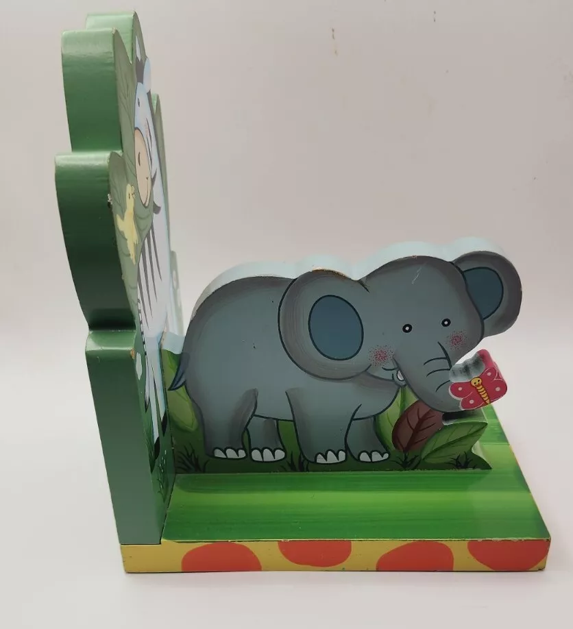 Add a touch of safari to your little one's playroom, nursery, or bedroom with this charming Fantasy Fields Sunny Safari Kids Single Bookend. Crafted from 100% MDF, this eco-friendly bookend features a colorful elephant design that is perfect for kids who love animals. Measuring 6.25 inches in length, 7.25 inches in height, and 4 inches in width, this bookend is suitable for standard-sized books and is free-standing, making it easy to display on a tabletop or shelf. This organic-certified bookend is part of the Sunny Safari Collection by Fantasy Fields, which includes other animal-themed pieces for a complete safari-inspired room décor. The flat-pack feature of this bookend makes it easy to assemble, and it is made in China. This bookend is perfect for kids who love animals and would be a great addition to any playroom, nursery, or kids' bedroom. Single bookend Excellent Pre-owned condition No visible flaws See pics for condition and measurements