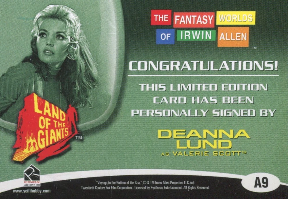 Description: Fantasy Worlds of Irwin Allen Land of the Giants Deanna Lund Autograph Card A9 Contents: Authentic autograph card A9 featuring Deanna Lund as Valerie Scott. Manufacturer: Rittenhouse Archives, 2004. Condition: Mint/near mint.