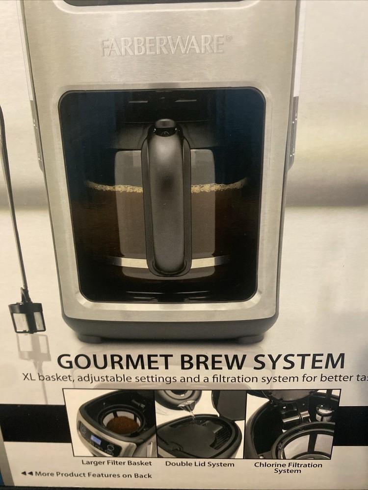 The Farberware 12 Cup Gourmet Brew System Digital Coffeemaker is a sleek silver coffee maker with a removable filter basket and programmable features. It has a digital control panel for easy use and an auto shut-off function for safety. This new open box appliance by Farberware is perfect for brewing delicious filter coffee with its convenient design and advanced settings. Excellent unused condition in open box