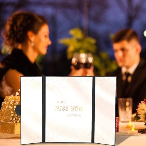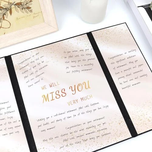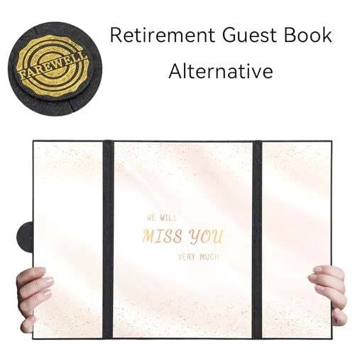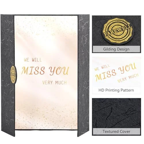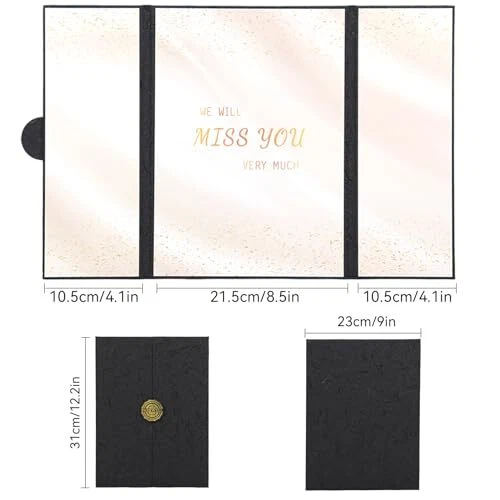 【Unique Design】The cover of rose gold embossed with texture has a gilded . The inside page of the signature certificate has three parts. The middle page is printed with the message "We Will Miss You". There are many blank spaces inside which you can sign, leave your most sincere wishes, collect the blessings of others. It will attract everyone's eyes. Tips: No pen. 【Farewell Creative Gift】Farewell guest book can be farewell gifts, goodbye cards, moving away party supplies, it can not only be used as decorations at retirement party or going away party, but also be use as souvenirs after the party finished. It's a great going away party supplies gift for your friends and coworkers. 【High-Quality Material】Our goodbye signature book is made of thick paper cardboard with a fun envelope look. The round rose gold buckle leather uses foil stamping printed logo pattern. The inside page is professionally designed with pearlescent frosted paper. Hard shell can keep this signature book for a long time and keep your good memories. 【Large Size】The folded size of the farewell decorations party is approximately 9 x 12 inches; The outspread dimension is approximately 18 x 12 inches, idal size for party decorations. 【Special Memories】On celebrating farewell party, create a -of-a-kind amd meaningful celebratory memory for your family friends colleagues that farewell gifts for coworkers can be stored away and cherished forever.