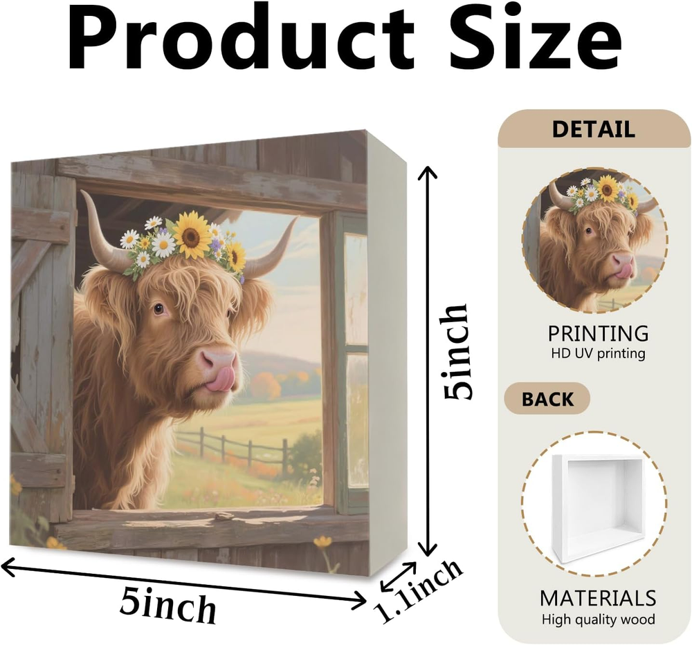 Fast Shipping On All Items 30 Days Money Guarantee Customer Support Excellent Service 100% Satisfaction Satisfaction Guaranteed Farmhouse Highland Cow Wooden Box Sign Desk Decor, Highland Cow Gifts, Rustic Sunflower Daisy Flower Heifer Wood Block Signs for Home Office Desk Table Shelf Decorations, 5x5 Inch Specification Item Weight 2.08 ounces Unit Count 1.0 Count Product Dimensions 5"L x 5"W 5.0 "w x 5.0 "w. Weight: 2.08 oz Item Description Decor for All Seasons: Works as an everyday accent while also fitting naturally into fall and winter holidays such as Halloween, Thanksgiving, and Christmas. Its understated style makes it easy to keep on display throughout the year. Compact and Easy to Place: At 5x5 inches, the sign fits neatly on desks, bookshelves, side tables, kitchen counters, or reception areas without taking up much space. Choice of Designs and Sayings: Offered in different themes, from cheerful to thoughtful, so you can select one that matches your personal taste, seasonal decor, or the atmosphere you’d like to create. Gift-Friendly Accent: A simple, ready-to-give item that works well as a seasonal present, office exchange gift, teacher appreciation, or a small gesture for neighbors and friends. It’s lightweight, easy to wrap, and always useful as decor. Ready to Display: Comes fully assembled with a freestanding base - just place it where you want an extra touch of personality. No tools or mounting required. This 5x5 inch wooden desk sign adds a simple but eye-catching detail to any room. Compact in size, it’s easy to place on flat surfaces and brings a welcoming touch to home, office, or classroom settings. Its clean style makes it suitable for year-round display, while also blending naturally into seasonal decor for gatherings, holidays, or casual refreshes. With different designs available, it can highlight a playful note, a seasonal theme, or a thoughtful reminder in shared spaces. About us We offer the best prices around on high quality products. Our E-store includes media such as books, movies, music and games while offering electronics, toys, sporting apparel, clothing, tools, general home, garden items and more. Shipping We are always working hard to ensure your package arrives as soon as possible. Please understand that some factors like weather, high postal traffic, and the performance of shipping companies are outside of our control. We offer free shipping to the lower 48 states and ship within 2-3 business days of payment, usually sooner. We do not accept P.O. Boxes. Please provide a physical address. For shipping outside of the continental USA, we only use eBay's Global Shipping Program.The item is shipped to KY and then sent to the rest of the world. International customers are responsible for all duties and taxes. Continue to check out to calculate costs for shipping the item to your country. Messages regarding eBay's Global Shipping Program MUST be directed at eBay EXCLUSIVELY. Returns We offer a 30-Day Return Policy on items in which you are not completely satisfied with. You have the option of a full-refund or an exchange of the item. No returns are available on items shipped outside of the USA Satisfaction We try over very best to make sure every customer is completely satisfied. If there's a problem, message us! We're happy to help. Payment Options Shop With Confidence
