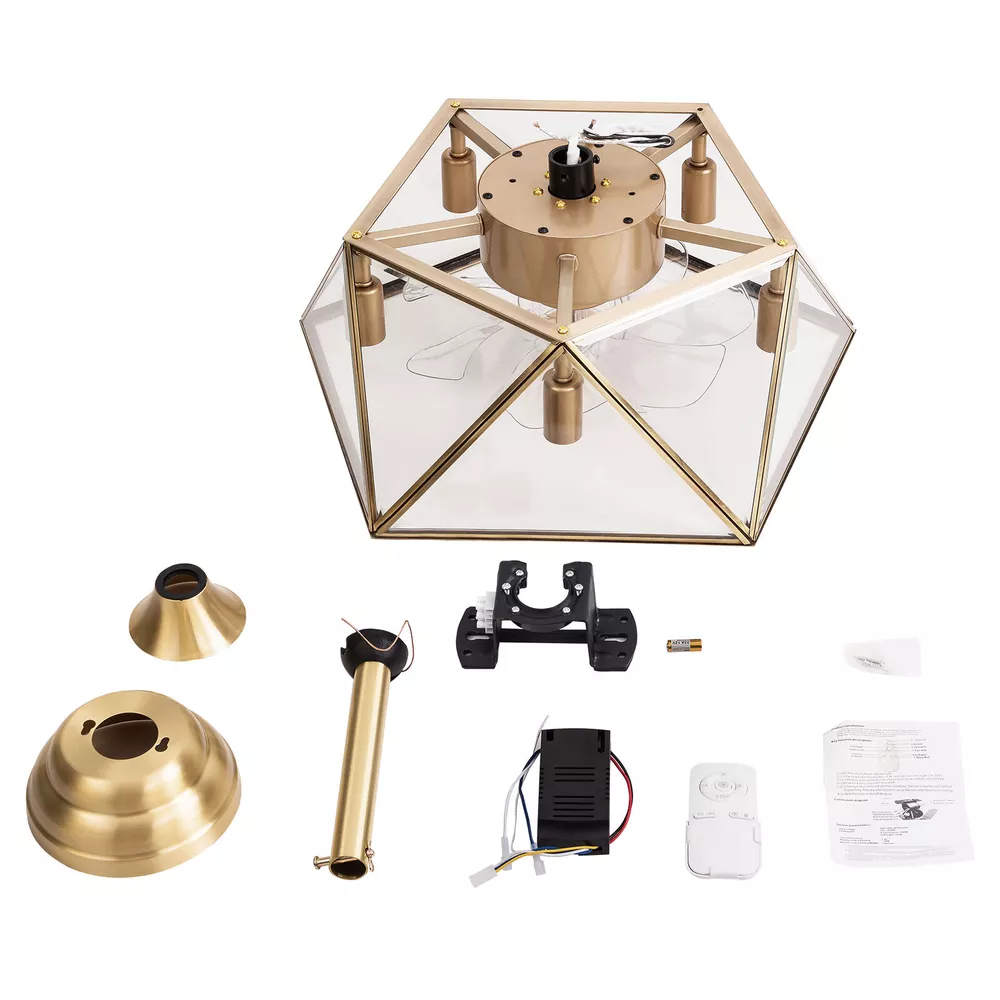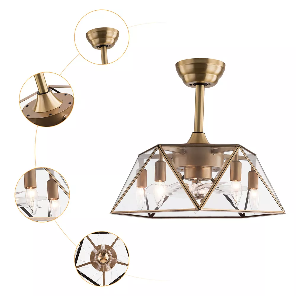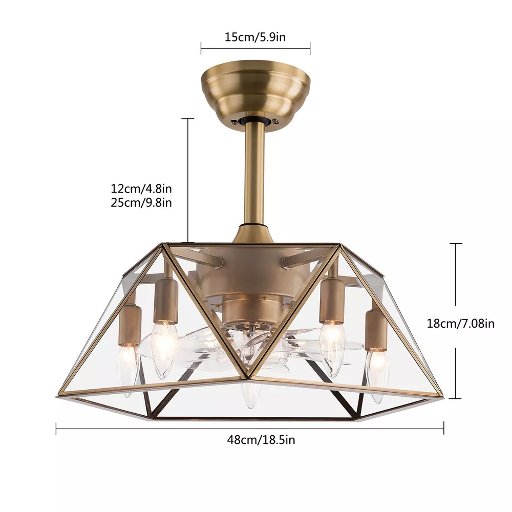 Description This 2-in-1 ceiling fan light allows you to feel the bright light and enjoy the coolness at the same time. It has six gears of wind speeds with a timing function to meet your daily usage needs. It can be integrated with different decoration styles and is ideal to create an excellent life and sleep environment to accompany you in all seasons. Key Features Stylish Exterior: The cylindrical lampshade, retro color scheme (Gold), and delicate lines make it very luxurious, and the water ripples on the tempered glass look like a flowing lake. It can be a good decorative piece to blend in with different decor styles and add color to your room. Great Durability: The lampshade is made of high-quality copper with a soldering process and tempered glass with high transparency, w Industrial Caged Ceiling Fan W/ Lights Farmhouse Ceiling Fan With Remote &Timing Description This 2-in-1 ceiling fan light allows you to feel the bright light and enjoy the coolness at the same time. It has six gears of wind speeds with a timing function to meet your daily usage needs. It can be integrated with different decoration styles and is ideal to create an excellent life and sleep environment to accompany you in all seasons. Key Features Stylish Exterior: The cylindrical lampshade, retro color scheme (Gold), and delicate lines make it very luxurious, and the water ripples on the tempered glass look like a flowing lake. It can be a good decorative piece to blend in with different decor styles and add color to your room. Great Durability : The lampshade is made of high-quality copper with a s oldering process and tempered glass with high transparency, which is heat-resistant , strong, durable, and not easy to deform. The fan blades are made of ABS, which has high strength, good toughness, and good formability, which can ensure a smooth surface and good gloss. High Safety: It is enclosed with 7 ABS blades hidden in the cage to avoid an accident caused by getting involved in the blades, so it's much safer than traditional fans to protect your family away from the fan blade's danger. 2-in-1 Function: The ceiling fan light has the function of fanning and lighting. It can not only illuminate you but also reduce heat, which can save you a lot of space. Adjustable Speed&Working Time: It has 6 gears of wind speed and you can choose low speed to enjoy the comfortable breeze or high speed to cool down quickly. Meanwhile, You can control its working hours in advance (1/2/4 hour), which can bring you great convenience. Easy to Clean : The smooth and flat shell, as well as the detachable fan blades, make this product easy to clean. You only need to clean it with a dry cloth, saving you lots of time and effort. Details Remote Control: It allows you to remotely control the timing, wind speed, etc, saving you lots of effort. Down Rods: This product is equipped with two down-rods with different lengths for different ceiling heights. Pure Copper Motor: It has stable performance, low-temperature rise, and low noise(About 40dB), providing a quiet working and sleeping environment. Meanwhile, there are a lot of heat dissipation holes on the motor shell, which can provide a good heat dissipation effect to ensure the stable operation and long service life of the motor. Application It is suitable for the living room, dining room, kitchen, study bedroom, small bedroom, conference room, and other places of 10-15㎡/107-161ft². Specifications Color: Gold Material: Copper, Tempered Glass, ABS Surface Treatment: Solder Process Style: Retro Motor Type: Pure Copper&Reversible Motor Number of Fan Blades: 7 Mounting Type: Ceiling Mount Rated Voltage: 85-265V Rated Power: 40W Power Source: DC Wind Speed Gears: 6 Timing: 1/2/4h Bulb Size: 5*E26/E27 (Not Included) Suitable Area: 10-15㎡/107-161ft² Electric Fan Design: Ceiling Fan Room Type: Bedroom, Living Room, Dining Room, Living Room, Kitchen Controller Type: Frequency Conversion Remote Control Efficiency: E Noise: About 40dB Base Diameter: 15cm/5.9inch Lampshade Size(L*H): 48*18cm/18.5*7.08inch Down-rod Length: 12cm/4.8inch, 25cm/9.8inch Package Included 1 * Ceiling Fan Light 1 *English Manual 1* Remote Control 1* 23A Battery All Accessories for Assembly Notes Please cut off the power supply when cleaning. The remote control is powered by a 23A battery (Included). Please note that the wall switch can only turn on the light or turn off the main power, and the ceiling fan can only be controlled by the remote control. This product does not include a light bulb. Please prepare five E26/E27 (Not Included) in advance. Please read the manual completely before installation and use, and pay particular attention to the safety instructions included. Please allow the slight color difference caused by the shooting light and 1-3cm error due to manual measurement, and make sure you do not mind before you order. Payment Delivery details Terms of sales About us Contact us Payment We accept ebay payment 。 Fees such as import duties, taxes are not included in the item price or shipping costs. These charges are the buyer's responsibility. Delivery details Shipping: 2-9 working days to: USA Terms of sales We maintain high standards of excellence and strive for hundred percent customer satisfaction. Feedback is very important to us. We hope that you contact us immediately before you give neutral or negative feedback, so that we can address your concerns. It is impossible to address issues if we do not know about them! About us Your satis faction is our ultimate goal. We work hard to earn your trust and future business. Our certified technicians have tested each item before shipping. The unit comes with 1 year limited warranty on all manufacturing defects. a) If you receive a defective item, you may return it or ask for a discount. Please contact us within 14 days after you receive the package. b) What you returned must be intact and in its original packaging as re? u. Customer is responsible for shipping co