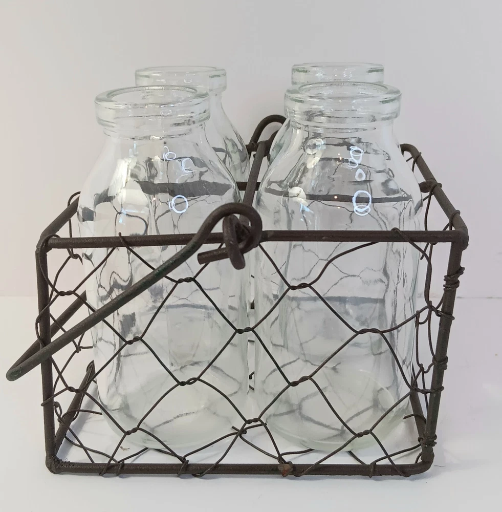 Farmhouse Metal Basket With Four Small Creamer Bottles Flower Vases Propagation Baset is approximately 5" Bottles are approximately 4" tall All Bottles and basket weigh approximately 1 lb Good condition. No chips or cracks. Bottles have a little cloudiness in the bottom and a little speck of debris in one bottle.