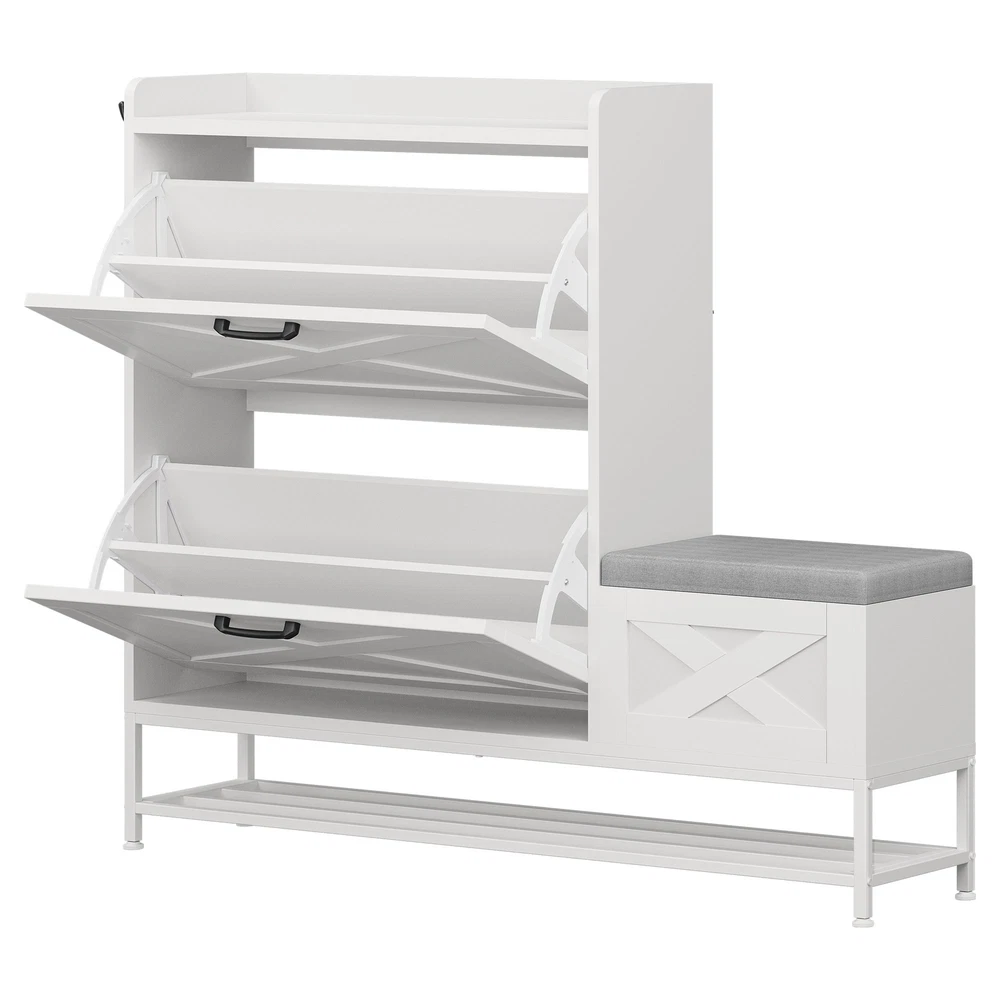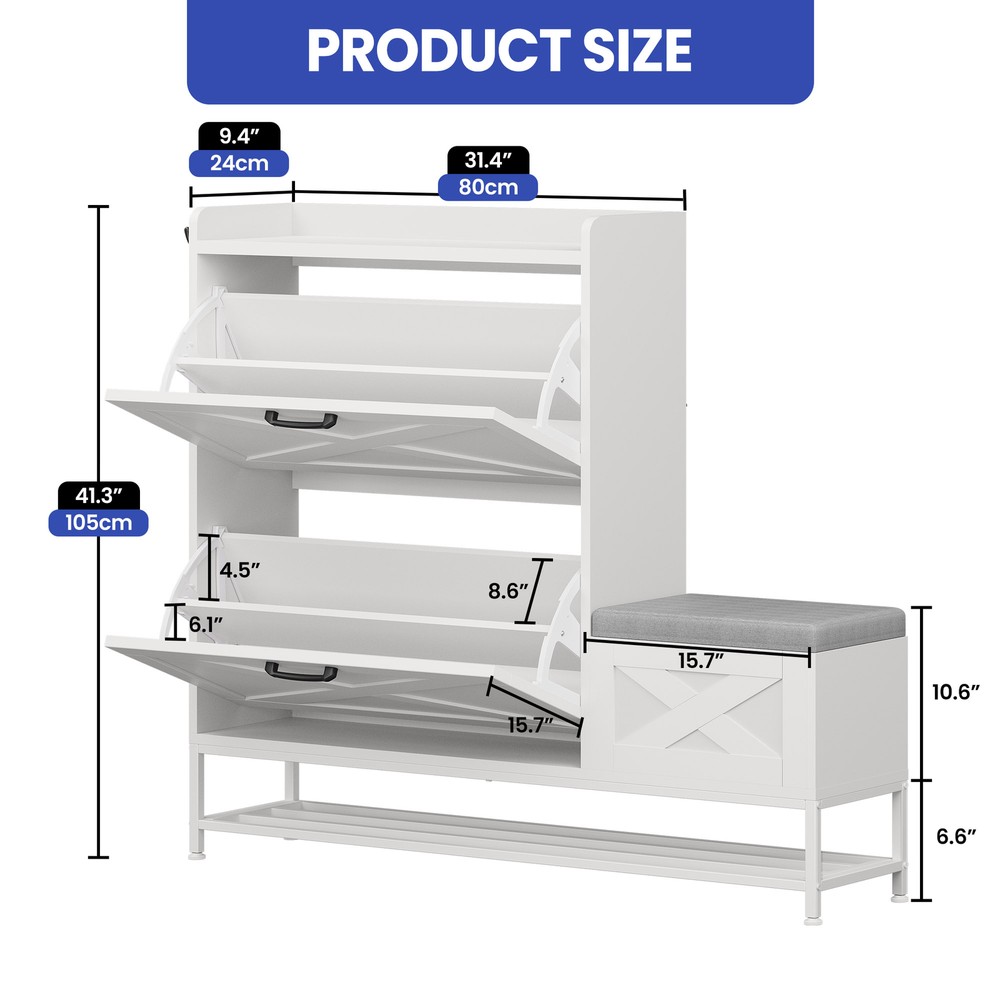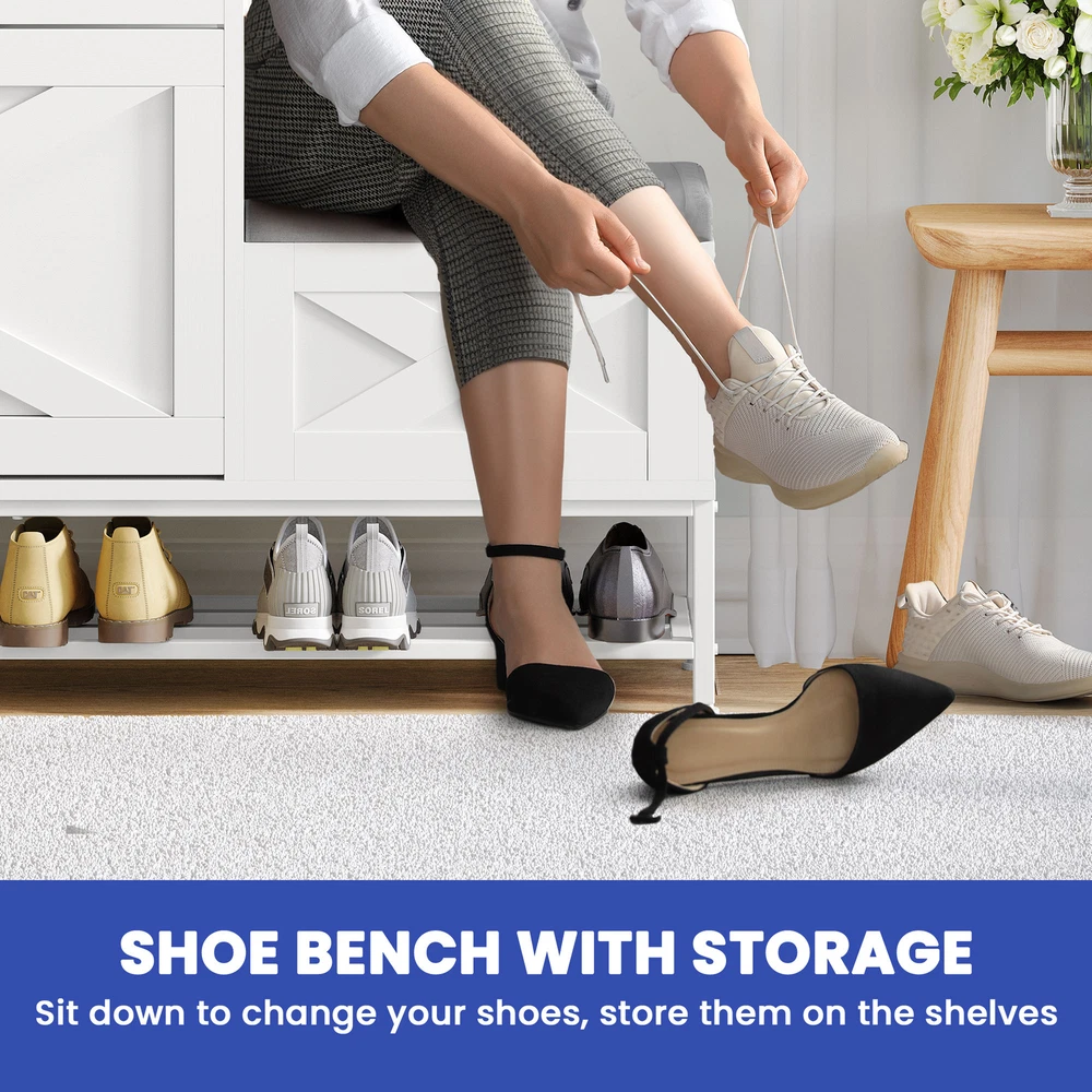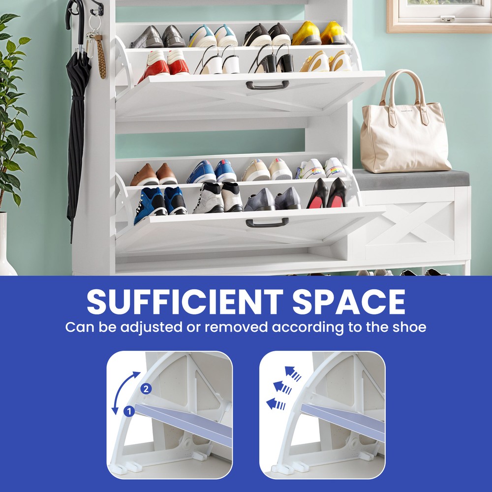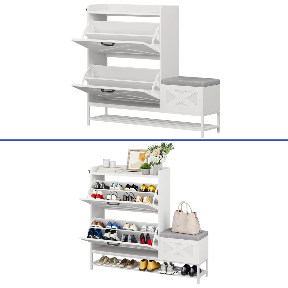 Farmhouse Shoe Cabinet 2 Flip Drawers 16 Pairs Entryway Storage Bench Side Hooks Product Description NOTE: Professional Installation would be Highly Recommended. Description: 1. Color: White 2. Material: Engineered Wood 3. Product Type: Shoe Storage Cabinet 4. Shape: Rectangle 5. Door: Flip 6. Mount: Free Standing 7. Room: Hallway, Entryway, Living Room, Bedroom 8. Special Features: Shoe Bench with Storage, Side Hook, 2 Flip Drawer, Bottom Storage, Top Open Shelves Features: Smart Drop-Down Shoe Cabinet for Effortless Organization: Say goodbye to messy entryways! This flip-open shoe storage cabinet features two hidden compartments with ergonomic handles, accommodating up to 16 pairs of various-sized shoes. Its space-saving design keeps your footwear neatly tucked away while ensuring quick and easy access. Multi-Functional Storage Bench for Ultimate Convenience: More than just a shoe cabinet, this versatile entryway bench offers a comfortable seat for changing shoes. The lift-up cushioned top reveals extra hidden storage, providing a perfect spot for accessories, bags, or household essentials. Keep your space tidy, clutter-free, and stylish all in one! Rustic Farmhouse Charm with Timeless Appeal: Enhance your home with a farmhouse-inspired shoe cabinet that blends elegance with functionality. Its rustic wood finish and classic design complement any decor, making it a chic statement piece for your entryway, hallway, living room, or porch. Slim & Space-Saving with Extra Storage: Perfect for narrow spaces, this slim-profile shoe cabinet seamlessly fits into tight areas. The open-bottom shelf provides extra room for slippers or frequently worn shoes, ensuring easy access and neat organization without taking up extra floor space. Stable, Secure & Built for Everyday Use: Designed with safety in mind, this sturdy shoe organizer includes an anti-tip device for added stability, preventing accidental tipping. Its durable construction ensures long-lasting reliability, making it a must-have for busy households. Dimensions: 1. Product Dimensions: 47.1"L x 9.4"W x 41.3"H 2. Shelves Dimensions: 8.6"L x 4.5"H 3. Bench Storage Dimensions: 15.7"W x 10.6"H 4. Top Shelf Dimensions: 31.4"L x 9.4"W 5. Shoe Capacity: 16 Pairs 6. Item Weight: 62 lb Package Included: 1 x Shoe Storage Cabinet 1 x Instructions Manual Shipping 1. Normally the item will be dipatched within 1 business day if payment is cleared before 12pm PST. 2. Please verify the correct shipping address in your PayPal account before making the payment. We only dispatch the item to the address that is sent to us at the time of checkout. 3. We don't ship to Hawaii, Alaska, Puerto Rico, APO/FPO/PO Boxes. 4. We don't provide local pick-up service. 5. Normally we will use USPS, UPS, FedEx & LTL to dispatch items. Payment 1. We accept PayPal and credit card. 2. We will ship to the confirmed Paypal shipping address that is provided with the payment only. Return 1. 30 days Money Back Guarantee. 2. Please contact our customer service to receive a RMA form first if want to return the item. 3. All returned items MUST in new condition with the original package. Contact If has any problem, please contact us by sending an ebay message. Our customer service will resolve the problem as soon as possible. On Feb 26, 2025 at 21:23:51 PST, seller added the following information: