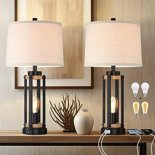 Menu 1. We require immediate payment. 2. We currently accept payment via eBay managed payments only. 3. Once payment is cleared, we will dispatch your shipment within 1-3 business days. Please refer to the "Shipping" tab for more information regarding shipping speed to your destination. Farmhouse Table Lamps for Living Room Set of 2, 26” Rustic Beside Lamps with USB Charging Ports and Night Light, Bedroom Nightstand Lamp Vintage Reading Lamps for End Table,Bulbs Included Product description Large Table Lamp with Rotary Switch:Our tall table lamp height is up to 26 inch which will fit your grand house well. large-diameter lampshades make the glow soft so it can protect our eyes. You will get two regular table lamps and two night lights which are controlled by a convenient 4-way rotary switch, you can easily switch between top light on, night light on, both lights on, or both off. Edison nightlight bulbs combine industrial and rustic styles, adding charm to your home. Nightstand Lamps with Dual USB Charging Ports: These bedside lamps offer not just light but also convenience. Each desk lamp base features two built-in USB fast charging ports, allowing you to charge phones and electronic devices hassle-free. Even when the tall table lamp is off, the charging ports continue to work, ensuring your devices stay powered up. Ideal for beside a sofa for cozy reading time or as a bedside lamp, eliminating the need for wall chargers and reducing clutter. Premium Material & Eye Protection,:The rustic table lamps feature a sturdy metal base with a polished finish for easy cleaning and durability. The natural linen lampshade softens glare, protecting your eyes from fatigue, while creating a comfortable and relaxing ambiance. The upper and below lighting design illuminates your space more extensively, delivering a delightful lighting experience. Farmhouse Table Lamps Set of 2: This pair of decorative table lamps feature distinctive profiles that elevate the look of your living space while casting ambient light. This versatile industrial table lamp with its matte black and elegant frame suits any space, whether it's a bedroom, office, foyer, or living room. Perfect for reading, working on your laptop, or looking at your phone's screen, this lamp complements your farmhouse decor while offering a gentle and inviting illumination. Free LED Bulbs with Table Lamp Set:This vintage nightlight lamp comes with 2pcs A19 bulbs and 2pcs ST58 bulbs,offering energy-saving convenience with a lifespan of 25000 hours.saving you the hassle of purchg additional compatible bulbs.If you wanna change bulbs for different styles,It supports 60W MAX E26 socket light bulbs (120V, 60Hz),compatible with LED, CFL, incandescent,and halogen bulbs.We suggest LED bulbs for low energy consumption and long-lifespan. PLEASE MESSAGE US IF YOU HAVE ANY OTHER QUESTIONS, AND MANY THANKS FOR READING ALL OF THIS. Copyright ©#. All Rights Reserved.