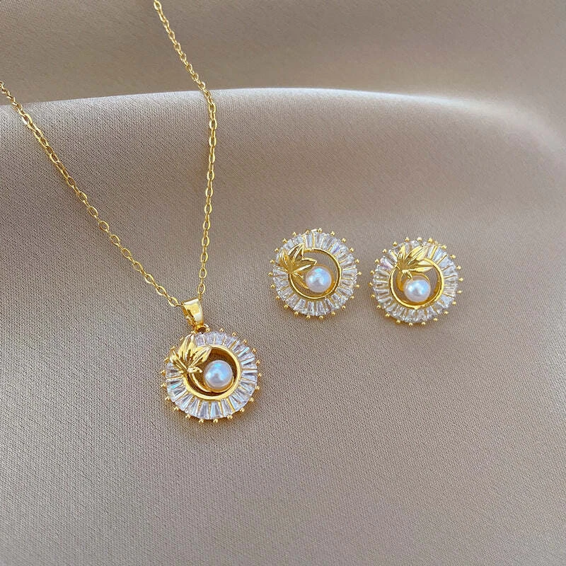 Overview: Unique design, stylish and beautiful. Good material, High quality. Product information: Treatment Process: Electroplating Color: D515 necklace [titanium steel chain Copper Pendant],D516 stud earrings [Silver Needle copper real gold plating]] Applicable population: Female Material: titanium steel Shape: Geometry Size: Packing list: Necklace*1/Earring*1Pair Product Image: