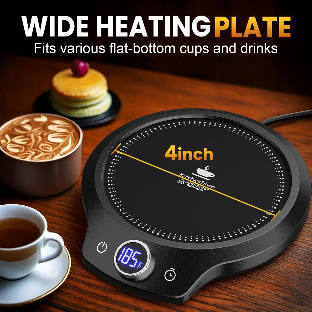 Coffee Mug Warmer: Enjoy Every Sip at the Perfect Temperature! Tired of your favorite beverages turning cold before you can finish them? Say goodbye to lukewarm drinks with our cutting-edge Cup Warmer, designed to keep your beverages at the optimal temperature from the first sip to the last drop. Key Features: Instant Heat Technology: Our Coffee Cup Warmer uses advanced heating elements to quickly warm up your cup's contents. No more waiting for your coffee, tea, or hot chocolate to become enjostainless steel thermos.yable – it's ready within moments! Customizable Temperature Settings: Experience the luxury of customizing your drink's warmth. With adjustable temperature settings, you can cater the warmth level to suit your personal preference. Sleek and Stylish Design: Enhance your workspace or home with the modern aesthetics of our Coffee Warmer. Its sleek design complements any environment, adding a touch of elegance to your surroundings. Universal Compatibility: Designed to accommodate cups of various sizes, our Coffee Warmer is perfect for mugs, heat-resistant glasses, and small bowls. It's your versatile companion for keeping all your favorite beverages warm. Safety First: Equipped with an intelligent auto-shutoff feature, you can enjoy peace of mind knowing your Mug Warmer turns off automatically when not in use. Focus on your tasks or conversations without worrying about forgetting to turn it off. Specification: Name: Coffee Warmer Voltage: 110V Frequency: 60Hz Power: 40W Cable Length: 1.5 m/59 in Weight: 0.5 lb is lightweight and portable Package: 1 x Coffee Mug Warmer 1 x User Manual 【Enjoy Ideal Temperature Anytime】Whether you're working or busy with chores, our coffee mug warmer keeps your drink just the right temperature (131°F, 145°F, 167°F, 185°F). No more cold coffee or tea - the mug warmer keeps warmth and comfort all day long 【All Day Perfect Drinks with Timer】No matter how busy you are, 12-hour timer of coffee mug warmer allows you to set it and forget it. The coffee warmer will automatically turn off to ensure safety, so you can always enjoy warmth with ease 【Smart Gravity Sensor Technology】Our coffee mug heater adopts advanced intelligent gravity sensor technology to automatically detect the placement status of the cup. When the cup is picked up, the mug warmer will automatically pause; when the cup is put back, the coffee mug warmer will immediately resume heating. This effectively prevents dry burning and prolongs the service life of the device 【Easy to Clean & Portable to Carry】Our coffee cup warmer is crafted from high-quality & easy-to-clean materials, featuring a smooth and refined surface that resists stains. Whether it's water marks or coffee stains left from daily use, simply wipe mug warmer plate gently with a damp cloth to quickly remove any dirt.The lightweight and portable design allows you to easily carry the coffee heater to the office, study, or any place you need 【Heating Plate for Most Cups】Equipped with a 4.5 inch large heating panel, this electric coffee cup warmer can easily accommodate a variety of cup types. Whether it's your everyday ceramic mug, or a portable stainless steel thermos.The heating panel of our coffee cup warmer is designed to ensure even heat distribution, so you never have to worry about uneven heating or incompatibility due to the shape or size of your cup 【Best Gift Choice】Whether gifted to family member or close friend, this coffee cup warmer for desk conveys warmth and care. It allows the recipient to enjoy their hot beverages while feeling your thoughtfulness at all times. Perfect for occasions like Thanksgiving, Christmas, New Year's, Valentine's Day, and more, the electric beverage coffee mug warmer is a practical and heartfelt gift choice 【Tips】Our coffee mug warmer automatically shuts down 5 minutes after the cup is removed. To avoid overload during use, we recommend disconnect the power cord when the mug warmer is not used for a long time. Do not touch the heating plate when the warmer is on,and allow the coffee warmer to cool before cleaning
