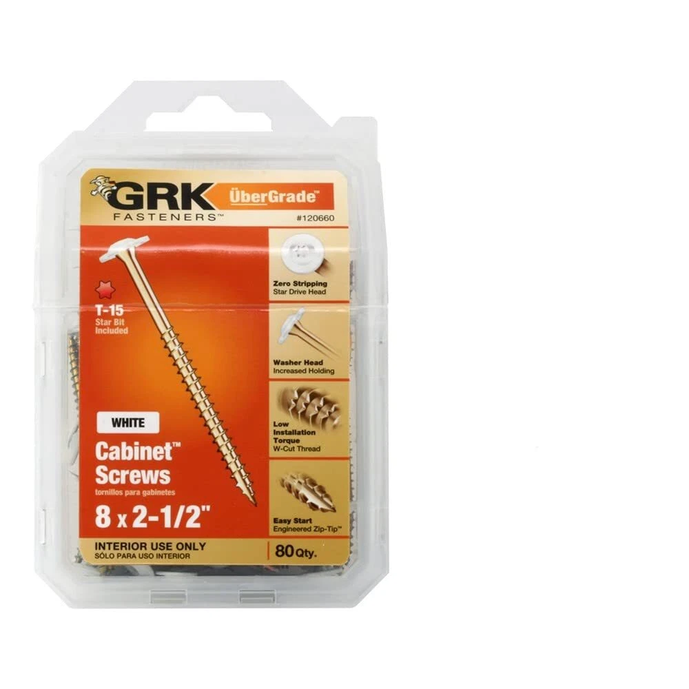 These #8 by 2-1/2-inch white cabinet screws are specifically designed for uses in cabinet construction and installation. The washer head design presses flush against any cabinet surface. These white Washer head, T15 bit size, self-tapping w-cut thread design Screws come in a pack of 80. Designed for use in cabinet construction and installation White color provides an ideal finish Quick and secure installation Washer head seats flush and increases holding power