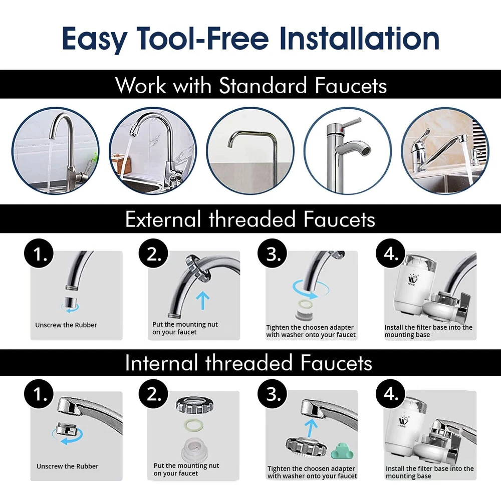 Faucet Tap Water Purifier promises cleanliness and purity in tap water at home. The faucet water filter adopts an advanced coconut shell-activated carbon block with a filtering precision of 0.1 microns. Our product reduces chlorine, fluorine, lead, unpleasant taste, sediment, turbidity, and other harmful pollutants in the tap water, but retains beneficial minerals. The Faucet Tap Water Purifier provides cleaner & safer water for daily use and takes care of you and your family. WBM Faucet Water Filter System Better-tasting water, one clicks installation. Advance Faucet Filtration System offers the great design, durability, and convenience you are looking for. Specification: • Height: 4.7 inches • Width: 5.90 inches • Depth: 2.24 inches • Weight: 1.05 lbs. What is in the Box One WBM tap faucet filtration system, Multifunctional connectors and one filter. REDUCES LEAD & FLUORIDE: water filtration system filters contaminants such as lead, fluoride, chlorine, benzene and asbestos, while retaining the natural minerals & characteristics – leaves you with clean fresh drinking water FIVE STAGE FILTRATION: Activated carbon filter reduces contaminants, eliminates taste and odor, post-filtration layer removes sand, rust, suspended solids and other little particles – provides a higher degree of protection and safety 3000L FILTRATION CAPACITY: Our water filter system can be used for 3 to 6 months depending on the local water quality. You do not have to worry about buying bottles of filtered water, save your money, reduce the use of plastic and enjoy clean water anytime for any purpose EASY TO INSTALL & USE: water purifier easily fixes to your standard faucet making tap water cleaner and great-tasting. Filtration system is easy to install; no tools are required COMPATIBLE WITH STANDARD FAUCETS: Sink water filter fits most faucets, does not fit irregular, hand-held, or pull-out faucets; ergonomic sleek design gives an elegant look