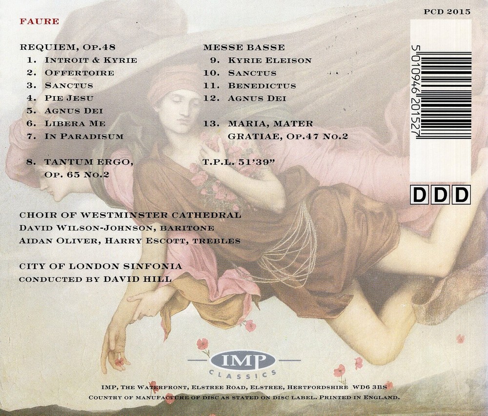 Title Fauré - Requiem Artists Choir of Westminster Cathedral David Wilson-Johnson, baritone Aidan Oliver, treble Harry Escott, treble City of London Sinfonia David Hill, conductor Label IMP Classics [PCD 2015] EAN/UPC 5010946201527 Track listing Gabriel Fauré Requiem , Op.18 Tantum ergo , Op.65 No.2 Messe Basse Maria, Mater gratiae , Op.47 No.2 See image(s) for detailed track listing. If you need any further details, please ask. Cases Most cases will show signs of shelf wear. Condition CD - In near mint condition. Booklet - In near mint condition. Back Insert - In near mint condition. Postage & Payment If you want me to post the CD without the plastic case, please let me know. I will post the CD along with the booklet and other paper parts in secure packaging. For all buyers who purchase more than one item at the same time please pay for them together or request the total amount payable. For buyers who purchase 2 or more items with postage charges, please request the total amount payable as there will often be a saving from the combined postage which might be further reduced if you do not need the plastic cases. Questions If you have any questions, please do not hesitate to ask. Returns I try to be fair and accurate in all my descriptions. Please read the listing details carefully before purchasing. If there is a problem, we can work together to resolve it. Negative feedback does not go away and should only be left as a last resort! I strive for positive feedback and will make every attempt possible to resolve the issue if we made a mistake. (It happens) Please do not assume a mistake is intentional. If you are not completely satisfied with your purchase, please advise me accordingly so that we can arrange for the item to be returned in its original condition within 30 days of receipt. Returned items should be in their original packaging with any enclosed documentation. Please note, goods will only be accepted for return if they are dispatched within 30 days of delivery, unless you have notified me otherwise. November 24
