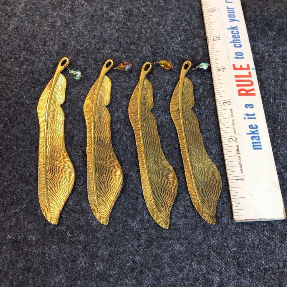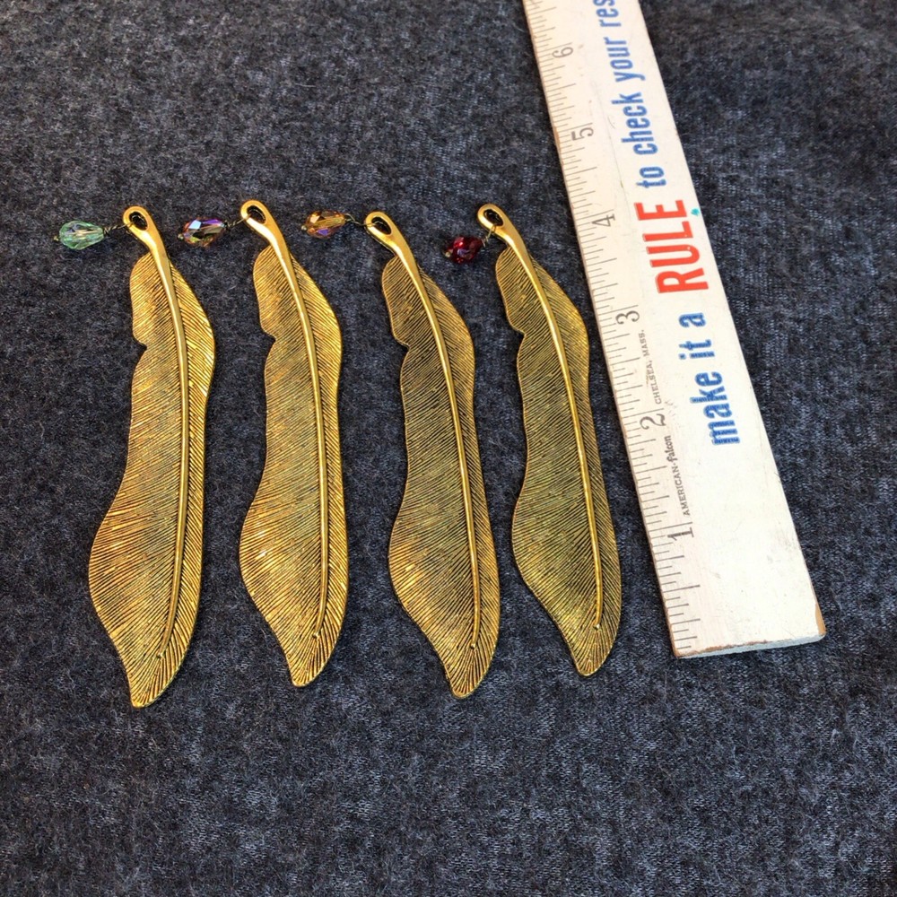 The "Feather Shaped Bookmarks Lot of 4" is a set of four gold metal bookmarks shaped like feathers. These bookmarks are designed to be extra durable, making them long-lasting and perfect for frequent use. Each bookmark is two-sided, providing a stylish and practical way to mark your place in a book or magazine. Ideal for book lovers who appreciate unique and decorative accessories, these feather-shaped bookmarks add a touch of elegance to your reading experience. Each bookmark has a colored bead on the end.