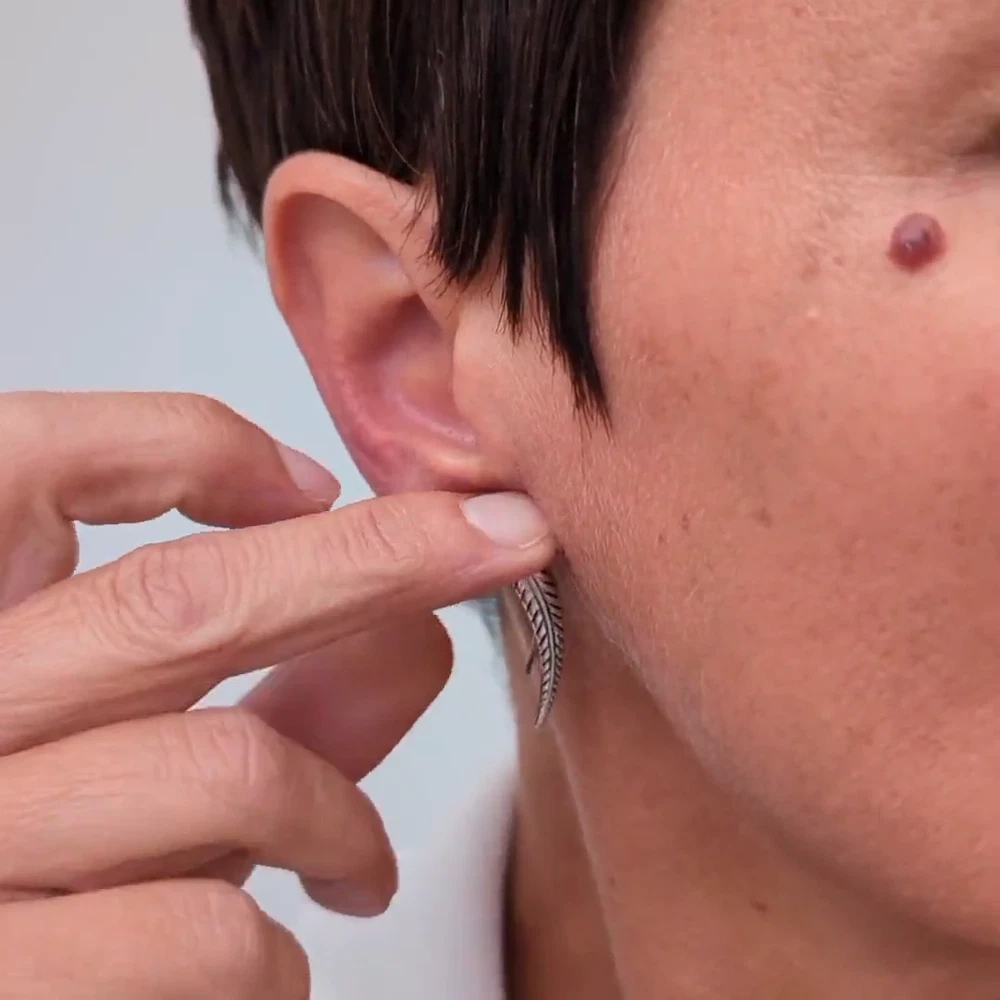 Long Feather climber earrings in sterling silver. Nickel Free. These Feather ear climbers have been carefully carved in oxidised sterling silver inspired by natural tree leaves. If you love Boho alternative style these unusual feather creepers are just for you! Lightweight, long tapered silver ear sweeps with flexible ear wire threader behind the lobe that follow the natural curved shape of the ear. Don't miss them out, Buy Now! ★ The ear climbers have a right and left side. The sweep (curve) should follow the shape of the ear. To wear, choose the correct side and thread it through a standard piercing as you would a normal dangle earrings. Then sweep the climber up along the ear and pinch it closed at the back. For best results pinch towards the end with care to avoid damaging the long pin. Dimensions Length: 3 cm Width: 0.6 cm Weight per pair: 1.09 grams SOLD ONLY IN PAIRS! Delivery Information All items dispatched from the UK. Item will be carefully packaged in eco-packaging to safeguard it during delivery. Standard Track48 Shipping with Royal Mail or Yodel included FREE . Tracking number details will be sent after dispatch (which is usually within 1 working day of purchase. Weekends/festivities excluded). Faster shipping options also available for the UK. Worldwide shipping available with Royal Mail Tracked & Signed. Returns accepted within 14 days of receipt. At customers’ expense.