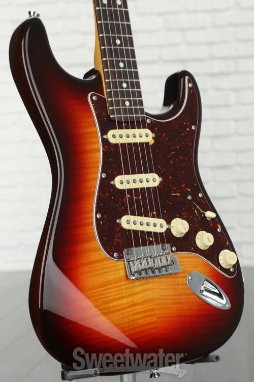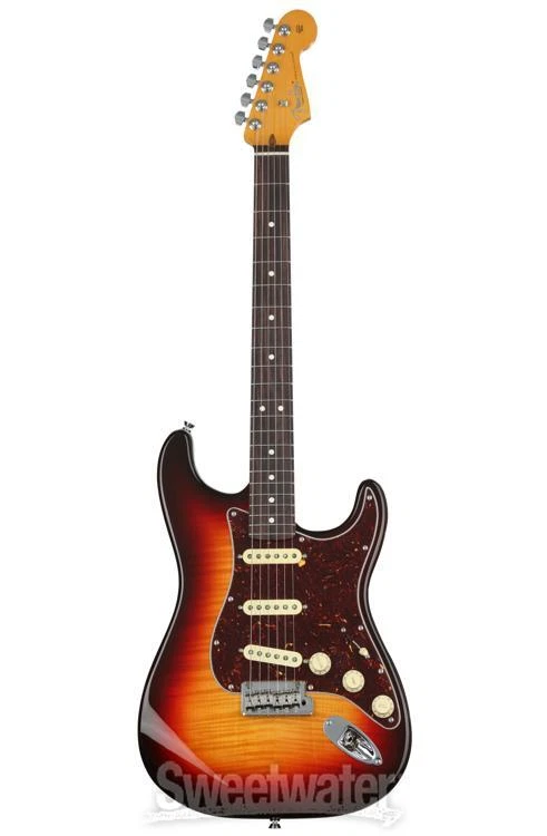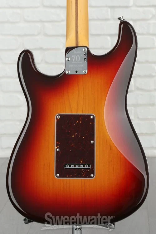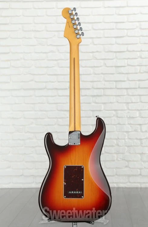 Saluting 70 Years of the Strat Fender’s American Professional II lineup has pulled out all the stops to celebrate the Stratocaster’s septuagenarian status with this gorgeous 70th-anniversary edition! You’ll find ample top-tier Strat features bob to the surface of this 6-string, including a trio of 70th-anniversary V-Mod II single-coil Strat pickups that supply an exquisite combination of vintage soul and modern performance. Plus, this guitar's American Professional II allegiance gains you some stellar appointments across the board, including a real bone nut, a 2-point tremolo bridge, and a set of Fender Deluxe tuning machines. The “Deep C” profile of its maple neck lets you wield the 70th-anniversary Strat with a more traditional feeling that only adds to the archetypal energy of the guitar. Seven decades of production perfection is a feat that few manufacturers can claim, and Fender’s 70th-anniversary American Professional II Stratocaster pays the ultimate tribute!Structured for certainty in Sweetwater is an Authorized Fender Dealer Genuine New Item Sweetwater's 2-year warranty and 55 point inspection Fender 70th-Anniversary American Professional II Stratocaster Electric Guitar Solidbody Electric Guitar with Alder Body, Maple Top, and Neck, Rosewood Fingerboard, and 3 Single-coil Pickups - Comet Burst Saluting 70 Years of the Strat Fender’s American Professional II lineup has pulled out all the stops to celebrate the Stratocaster’s septuagenarian status with this gorgeous 70th-anniversary edition! You’ll find ample top-tier Strat features bob to the surface of this 6-string, including a trio of 70th-anniversary V-Mod II single-coil Strat pickups that supply an exquisite combination of vintage soul and modern performance. Plus, this guitar's American Professional II allegiance gains you some stellar appointments across the board, including a real bone nut, a 2-point tremolo bridge, and a set of Fender Deluxe tuning machines. The “Deep C” profile of its maple neck lets you wield the 70th-anniversary Strat with a more traditional feeling that only adds to the archetypal energy of the guitar. Seven decades of production perfection is a feat that few manufacturers can claim, and Fender’s 70th-anniversary American Professional II Stratocaster pays the ultimate tribute! Structured for certainty in feel This 70th-anniversary Strat serves up a supreme Fender tonewood concoction, boasting a body of alder that hangs comfortably and well-balanced over your shoulder. Its accompanying flame maple top is guaranteed to turn some heads, too! A light and maneuverable maple neck carved to Fender’s “Deep C” profile not only delivers that slightly thicker vintage feel, but also provides an exceptional complement to the guitar’s 22-fret rosewood fingerboard. Radiused to a commanding 9.5 inches, creatives of all classes will find that the 70th-anniversary Strat plays with a true Fender feel that holds up under any circumstance, from the practice room and high-stakes stage shows to the nuanced meticulousness of studio work. Voiced by 70th-anniversary V-Mod II single-coils Not just any set of single-coils will get the job done for Fender’s 70th-anniversary Strat. This particular guitar features three 70th-anniversary V-Mod II single-coil Strat pickups, expressing that timeless Stratocaster tone we know and love with the high-performance playability of modern single-coils. Whether you're feeling the vintage vibes or looking for more contemporary tones, these single-coils deliver the palette to accommodate it all. Outfitted with classic controls like a 5-way pickup selector, dual Tone knobs, and a master Volume control, you’ve got full say over the exact tonal sculpture of your sound. Professional-grade response True Stratocaster fans will appreciate how hard the 70th-anniversary American Professional II Strat works to provide reliable and flawlessly functional playability every time you pick it up. Hit hard, wail, and bend the strings with full confidence in a set of Fender’s Deluxe in-line tuning machines backing up your intonation. Similarly, an upgraded 2-point tremolo bridge enables all access to stress-free pitch dipping, from subtle wobbles to huge drops — whatever your sound requires! All six strings pass over a real bone nut that aids in providing that true and snappy original Stratocaster string response. Classic vibes meet contemporary dependability — after all, this striking instrument is 70 years in the making! Fender 70th-anniversary American Professional II Stratocaster Electric Guitar Features: Tributing 70 years of Fender's revolutionary Stratocaster! Alder body provides a wonderfully balanced feel "Deep C"-carved maple neck delivers a lightweight and traditional feel 22-fret rosewood fingerboard with a 9.5-inch radius accommodates every playing style 3 x 70th-anniversary V-Mod II single-coil Strat pickups come armed for both classic and contemporary tones alike 5-way pickup selector, dual Tone controls, and a master Volume knob make tone sculpting a cinch Fender Deluxe in-line tuning machines anchor-down intonation with professional dependability Real bone nut permits traditional Stratocaster string response 2-point tremolo bridge with a cold-rolled steel block enables tone dips to your heart's content Specification Detail Number of Strings 6 Left-/Right-handed Right-handed Body Type Solidbody Body Shape 70th Anniversary American Professional II Stratocaster Body Material Alder Top Material Flamed Maple Color Comet Burst Body Finish Gloss Urethane Neck Material Maple Neck Shape Deep C Neck Joint Bolt-on Radius 9.5" Fingerboard Material Rosewood Fingerboard Inlay Dots Number of Frets 22 Scale Length 25.5" Nut Width 1.685" Nut Material Bone Bridge/Tailpiece upgraded 2-point tremolo with a cold-rolled steel block Tuners Fender Locking Neck Pickup Fender 70th Anniversary V-Mod II Strat Single-coil Middle Pickup Fender 70th Anniversary V-Mod II Strat Single-c