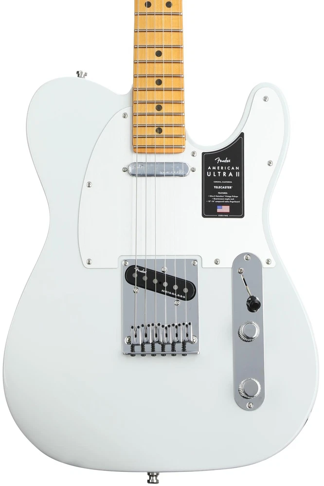 A Tele for Today’s Performers Imagine a classic Corona-built Tele in all its glory, tastefully refined for the modern performer — that’s the Fender American Ultra II Telecaster! This alder-bodied 6-string boasts updated backside contouring and a sculpted neck heel, making this legendary design extremely comfortable to wield. Fitted with a quartersawn maple neck that’s been carved to a speedy Modern D profile, the American Ultra II’s comfortably classic appeal only strengthens as your chording hand falls into place. Expect that cherished Telecaster shimmer without the pesky hum when you warm up these Ultra II Noiseless Vintage Tele single-coils, providing professional-grade results in live settings and studio-standard tones when recording. Finally, sealed locking tuners and a 6-saddle hardtail bridge maintain peace of mind during every performance and round out the American Ultra II Telecaster’s outstanding union of tradition and innovation.The Tele feel we’ve always wanted Fashioned with a body of Sweetwater is an Authorized Fender Dealer Genuine Open Box Item Sweetwater's 2-year warranty and 55 point inspection Fender American Ultra II Telecaster Electric Guitar - Avalanche, Maple Solidbody Electric Guitar with Alder Body, Maple Neck, Maple Fingerboard, and 2 Single-coil Pickups - Avalanche A Tele for Today’s Performers Imagine a classic Corona-built Tele in all its glory, tastefully refined for the modern performer — that’s the Fender American Ultra II Telecaster! This alder-bodied 6-string boasts updated backside contouring and a sculpted neck heel, making this legendary design extremely comfortable to wield. Fitted with a quartersawn maple neck that’s been carved to a speedy Modern D profile, the American Ultra II’s comfortably classic appeal only strengthens as your chording hand falls into place. Expect that cherished Telecaster shimmer without the pesky hum when you warm up these Ultra II Noiseless Vintage Tele single-coils, providing professional-grade results in live settings and studio-standard tones when recording. Finally, sealed locking tuners and a 6-saddle hardtail bridge maintain peace of mind during every performance and round out the American Ultra II Telecaster’s outstanding union of tradition and innovation. The Tele feel we’ve always wanted Fashioned with a body of alder wood, the American Ultra II Telecaster sports a nice weight right out of the gate — but there’s a catch! Instead of the traditional flat body design typically associated with Telecasters, the American Ultra II comes comfortably shaped with long contouring at the upper waist, subtle contouring at the back of the cutaway, and convenient top shaping at the lower bout. This trifecta of attention ensures a greater connection to the instrument as you play, keeping discomfort out of the equation. Joining the revelry, a sculpted neck heel and Modern D neck profile further streamline maneuverability and speed across the American Ultra II, delivering a truly commanding grasp never before felt on a Telecaster. Buzz-free Ultra II single-coils What’s your Tele tone poison? From the twang and punch of country and blues to the grace and growl of soul and folk rock, these Ultra II Noiseless Vintage Tele pickups will do the trick and then some. Infused with those iconic single-coil sounds that we’ve known and loved for so many years, this pickup pairing can travel the musical timeline better than most. Both pickups come engineered for stunningly noise-free operation, meaning that the age-old irritations of single-coil buzz and hum are now simply stresses of the past. Polish your sonic vibe with master Tone and Volume controls, and totally transform the signal quality of your live rig or studio sound. Dashingly dutiful hardware Being so performer friendly, it only makes sense that the American Ultra II Telecaster comes fortified with the proper hardware to hold its own. This starts at the headstock, where Fender’s Deluxe Cast sealed locking tuning machines keep a solid watch on your intonation, while a Graph Tech TUSQ nut purifies your strings’ every nuance. Down at the body, a 6-saddle string-through-body hardtail bridge hosts chrome-plated brass saddles to aid in delivering that legendary Tele snappiness with total dependability. To top it all off, the American Ultra II Telecaster dons a sharp-looking anodized aluminum pickguard that emphasizes the modern edge this 6-string so boldly struts. Fender American Ultra II Telecaster Features: Alder body features new contouring at the upper waist, cutaway, and top-side lower bout for maximum playing comfort and connection Quartersawn maple neck with sculpted heel and Modern D profile offers a vintage hold with speed for today’s players Ultra II Noiseless Vintage Tele single-coil pickups permit iconic Tele twang and shimmer without the pesky humming Master Tone and Volume controls give players the simple yet effective sound-shaping tools to suit any Tele vibe Deluxe Cast sealed locking tuners promise fantastic intonation Graph Tech TUSQ nut keeps string response pure and even 6-saddle string-through-body hardtail bridge hosts chrome-plated brass saddles to double up on sonic snap and dependability Anodized aluminum pickguard looks incredible and adds a modern edge to this timeless classic Specification Detail Model American Ultra II Number of Strings 6 Left-/Right-handed Right-handed Body Type Solidbody Body Shape Telecaster Body Material Select Alder Color Avalanche Body Finish Gloss Urethane Neck Material Quartersawn Maple Neck Shape Modern D Neck Joint Bolt-on Radius 10"-14" Compound Fingerboard Material Quartersawn Maple Fingerboard Inlay Dots Number of Frets 22, Medium Jumbo Scale Length 25.5" Nut Width 1.685" Nut Material Tusq Bridge/Tailpiece 6-Saddle String-Through-Body Hardtail, Chromed Brass Saddles Tuners Deluxe Cast/Sealed Locking Neck Pickup Fender Ultra II Noiseless Vintage Tele Single-coil Bridge Pickup Fender Ultra I