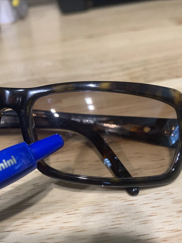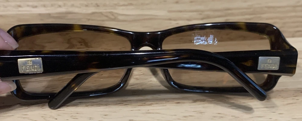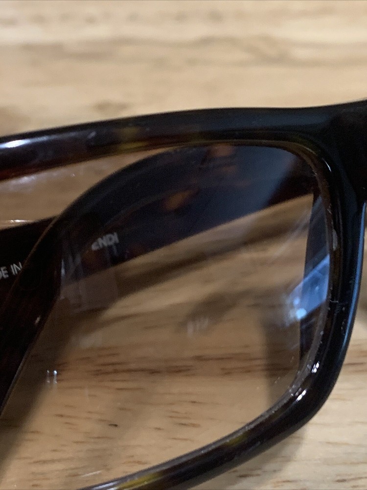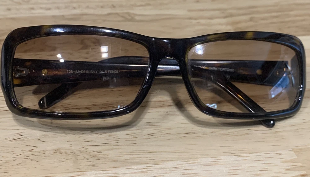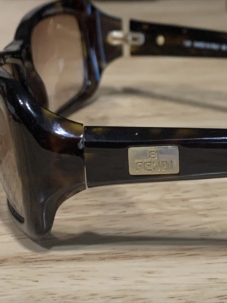 Has some scratches on the lens. Has three small clusters of scratches that you can see on the lenses. On the inside arm it says FS272. 58 15 Dark Tortoise 125. Made in Italy Fendi. The frame has some scratches also. Please review all pictures, they are part of the description.
