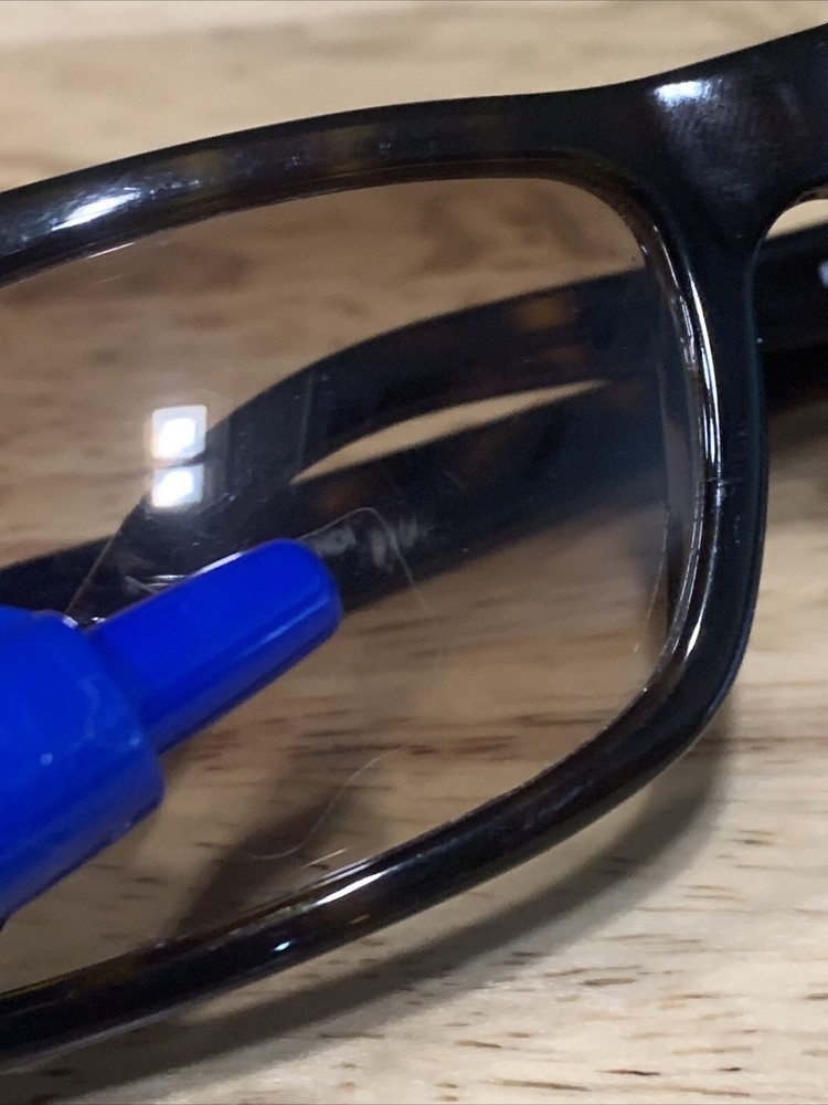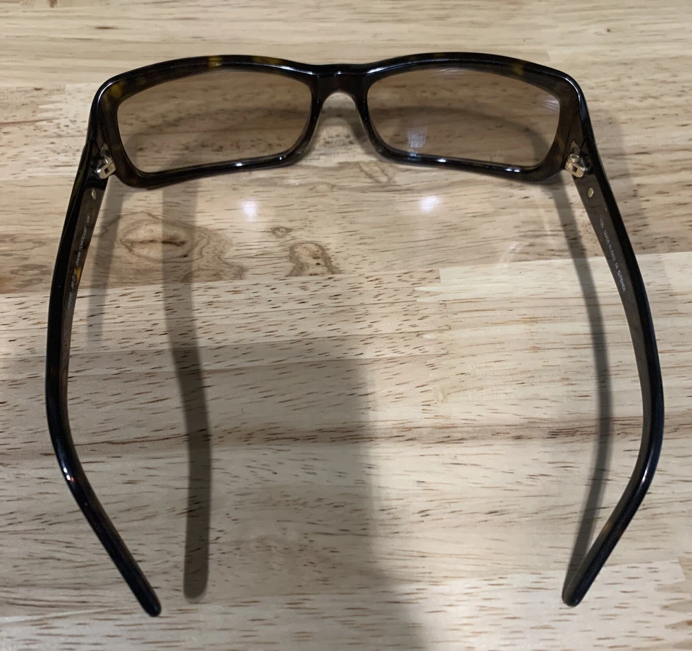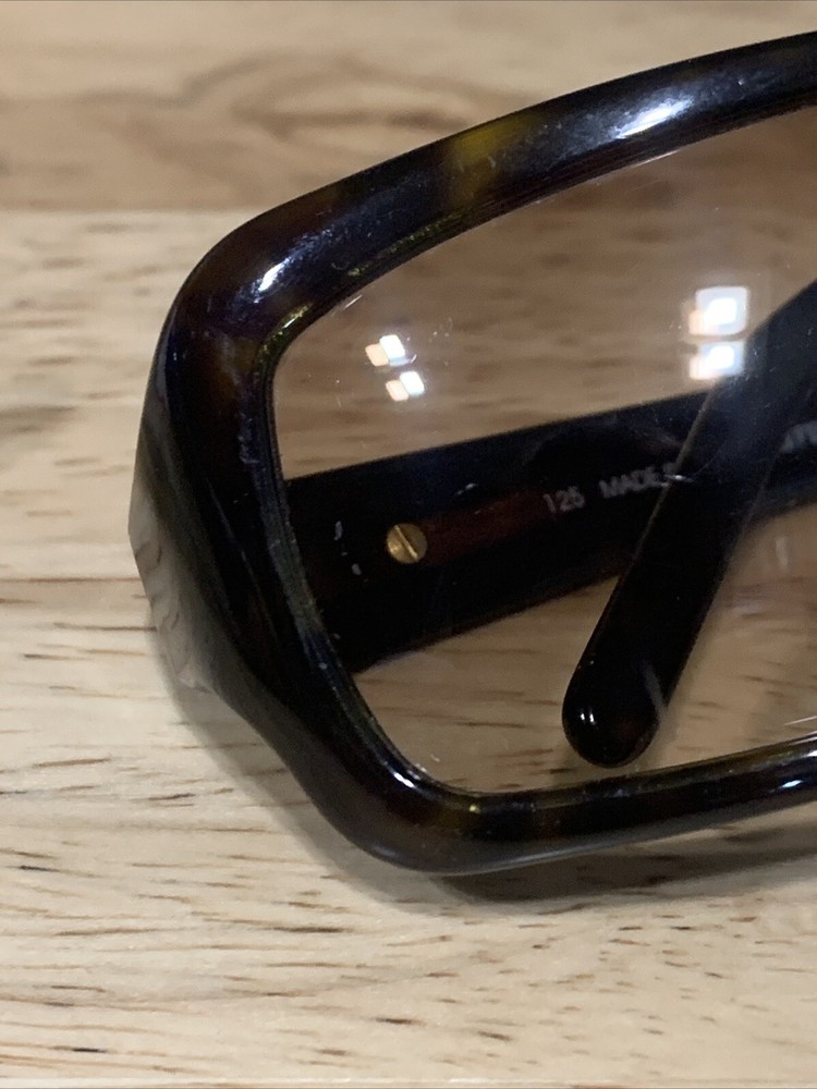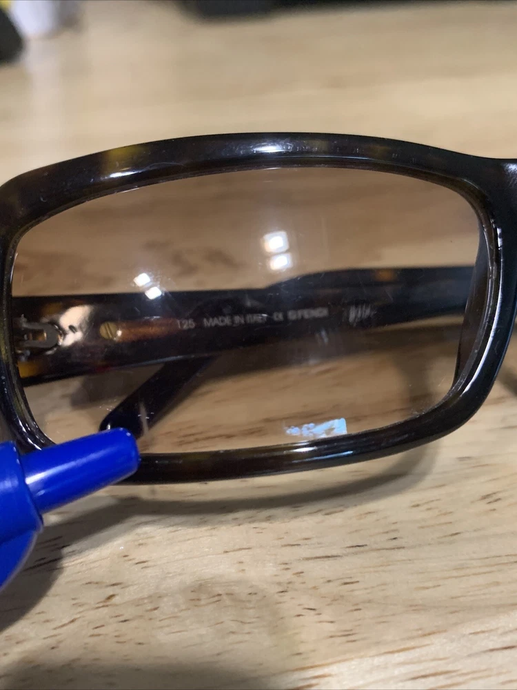 Has some scratches on the lens. Has three small clusters of scratches that you can see on the lenses. On the inside arm it says FS272. 58 15 Dark Tortoise 125. Made in Italy Fendi. The frame has some scratches also. Please review all pictures, they are part of the description.