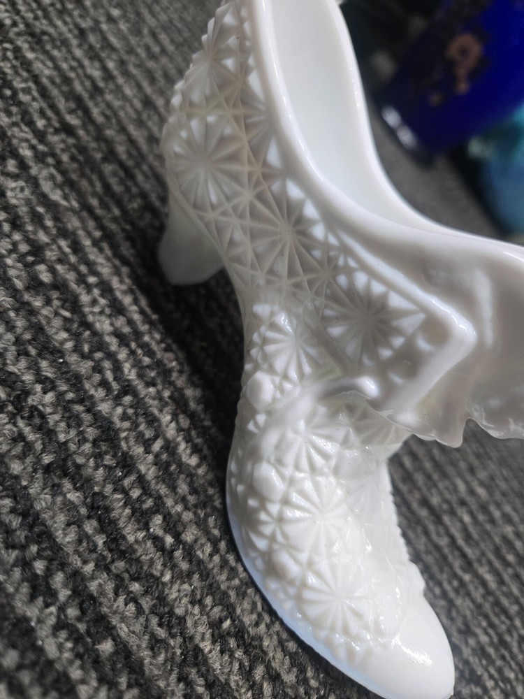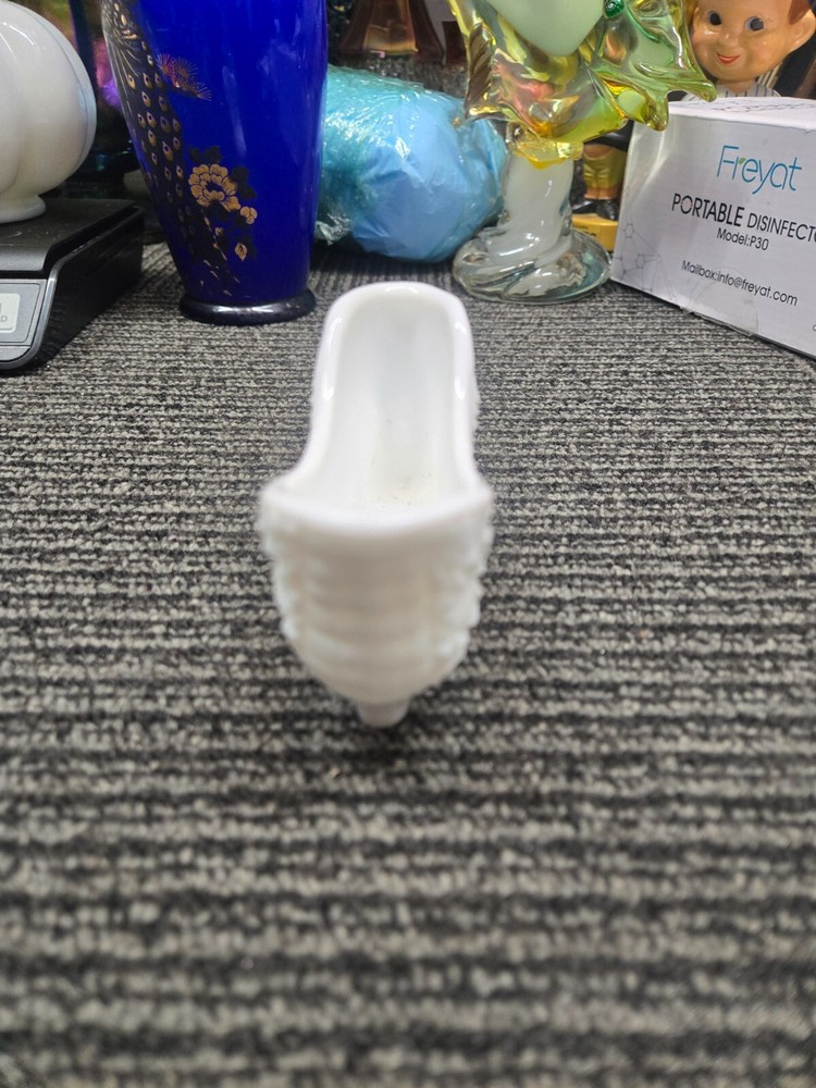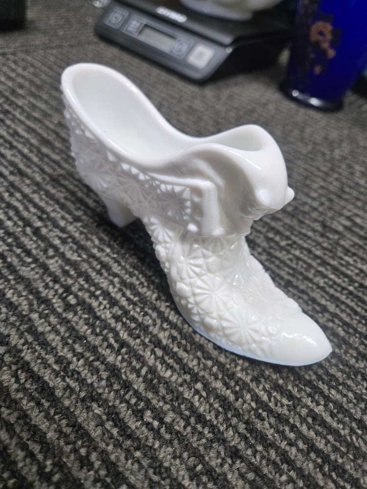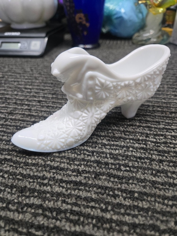 The product is a Fenton Art Glass White Milk Glass Cat Head Slipper featuring a daisy button design. This vintage slipper was manufactured in 1939 thru 2005 and is a part of the Fenton brand's production style of milk glass. The slipper is designed as a decorative piece with a cat head shape, ideal for collectors or fans of Fenton glassware and cat-themed decor.