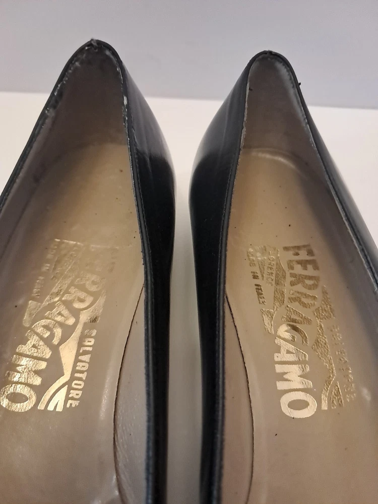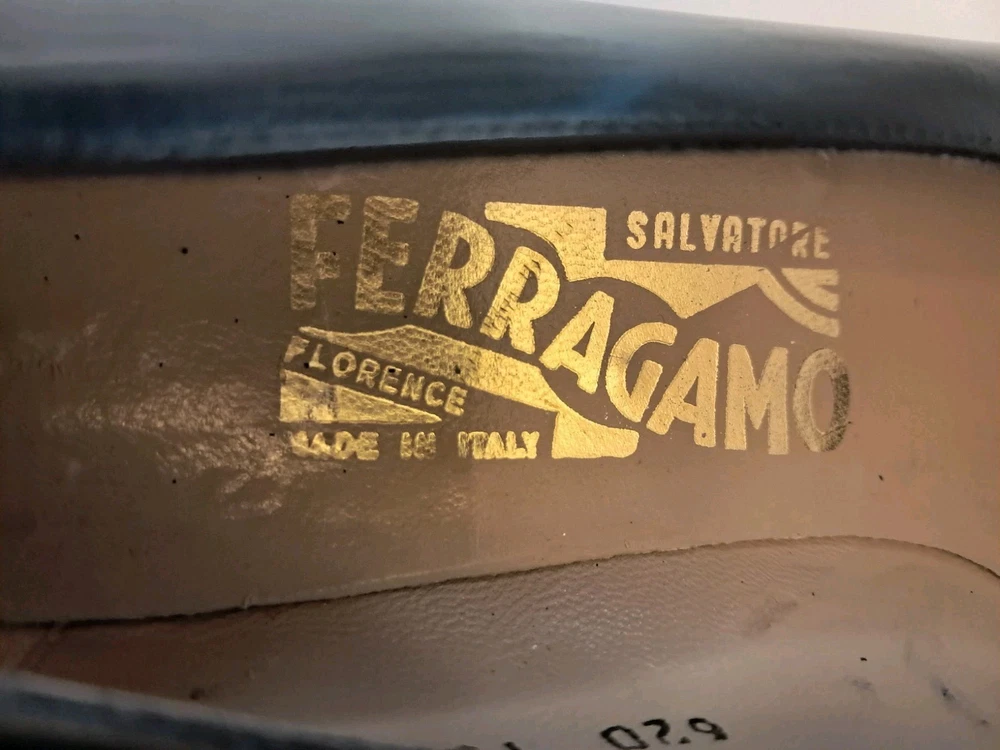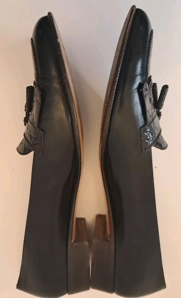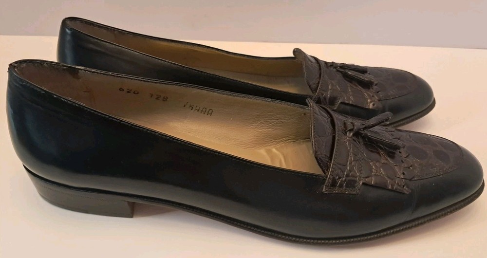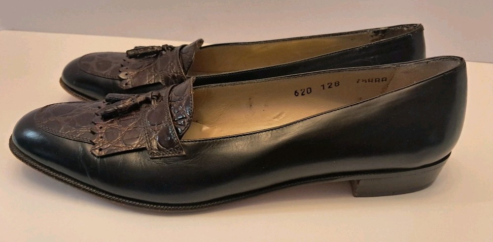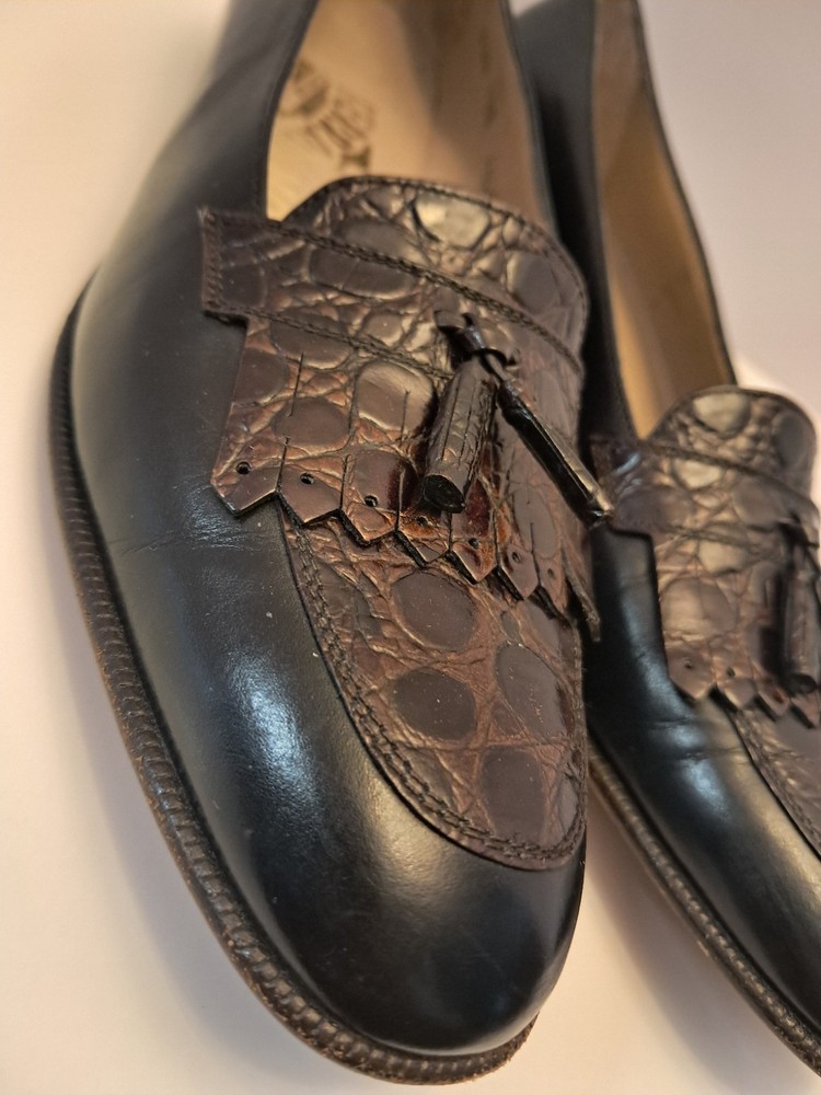 Ferragamo Diplomata Kiltie Tassel Black & Dark Brown Croc Print Embossed Size 7.5 AAA Smoke free pet free home Pre-owned condition but very nice
