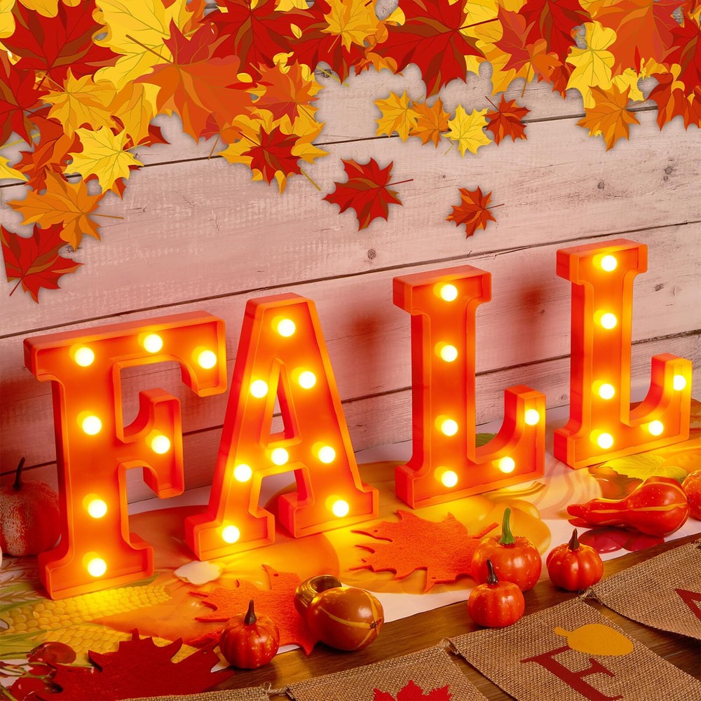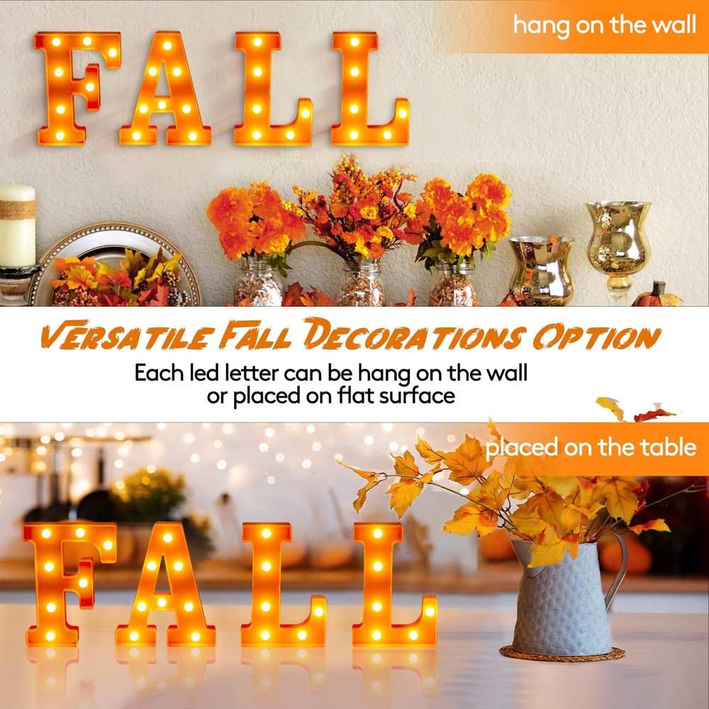 Perfect Fall and Christmas Decorations for Home: These lovely "FALL" Led letter lights are great for Fall And Thanksgiving Decorations, you will get 4 pieces of Thanksgiving light up letters. They can light up your fall house party and bring your family a stronger seasonal atmosphere, satisfy your multiple needs for Fall-themed decorations. Battery Operated Fall and Christmas Lights: These fall decorative light up letters powered by 3AA batteries (each letter need 2 batteries, not included). No need to plug in, no extra wire, low power consumption, will not overheat after prolonged usage, safe and reliable to use. It can be used indoor or outdoor. Dress up your home, tabletop, mantel, wall, porch, garden or yard. Easy To Use: These fall marquee light up letters have holes and an on/off switch on the back. You can place them directly on the table, or hang them on the wall with some nails (not included). Premium Material & Reusable: Made of premium plastic material, the "FALL" letter lights are non-toxic, odorless, stable and sturdy. The bulbs on the led letter lights are not easily broken or deformed, which can be reused for a long time. Widely Used Fall And Thanksgiving decorative Lights: These vivid light up letters can easily creates a warm, memorable atmosphere—perfect for everyday decor or social gatherings like fall, Thanksgiving party, indoor outdoor harvest celebration, winter evening party, or casual backyard barbecue. Very convenient to fix or place it anywhere you like, do it by yourself and enjoy the fun! Customer Satisfactions: Feel free to message us through “contact sellers” if products don't meet your expectations. Any problem, please contact us first, we will help you solve the problem within 24hours. Then celebrations start at our unique lighted fall letter lights!