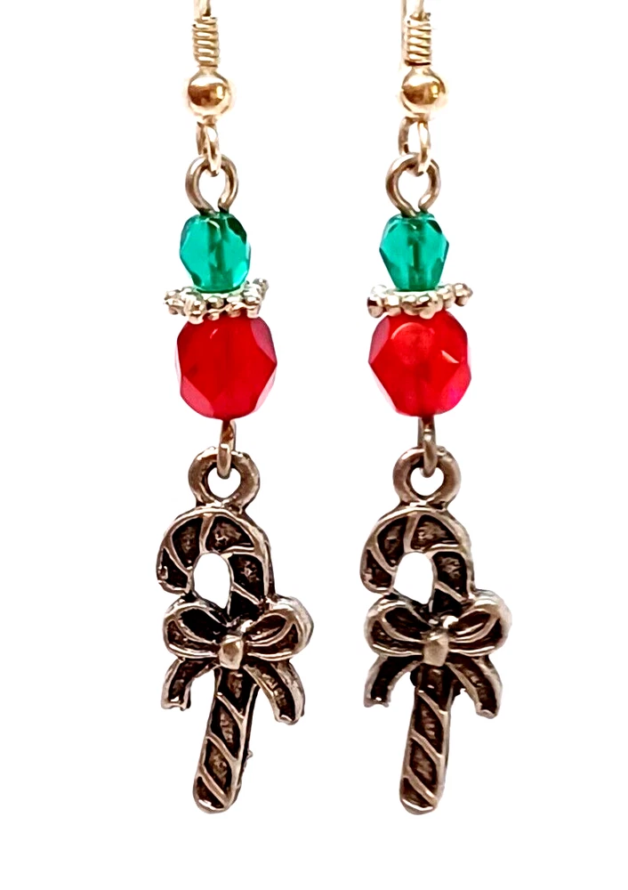 Add some festive flair to your holiday outfit with these fun and unique Candy Cane Earrings. The asymmetrical design features a silver bow and green and red acrylic beads in the shape of candy canes. The dangle/drop style and hook closure make them easy and comfortable to wear. These earrings are perfect for anyone looking to add a touch of holiday cheer to their outfit without being too over the top. They are also a great gift for a friend or loved one who loves holiday-themed jewelry.