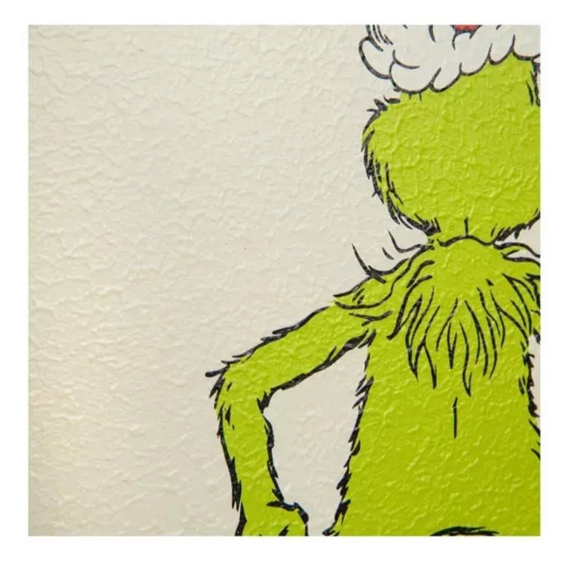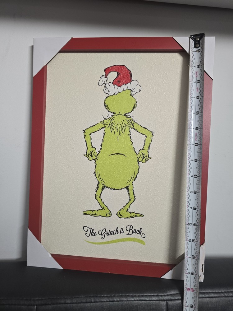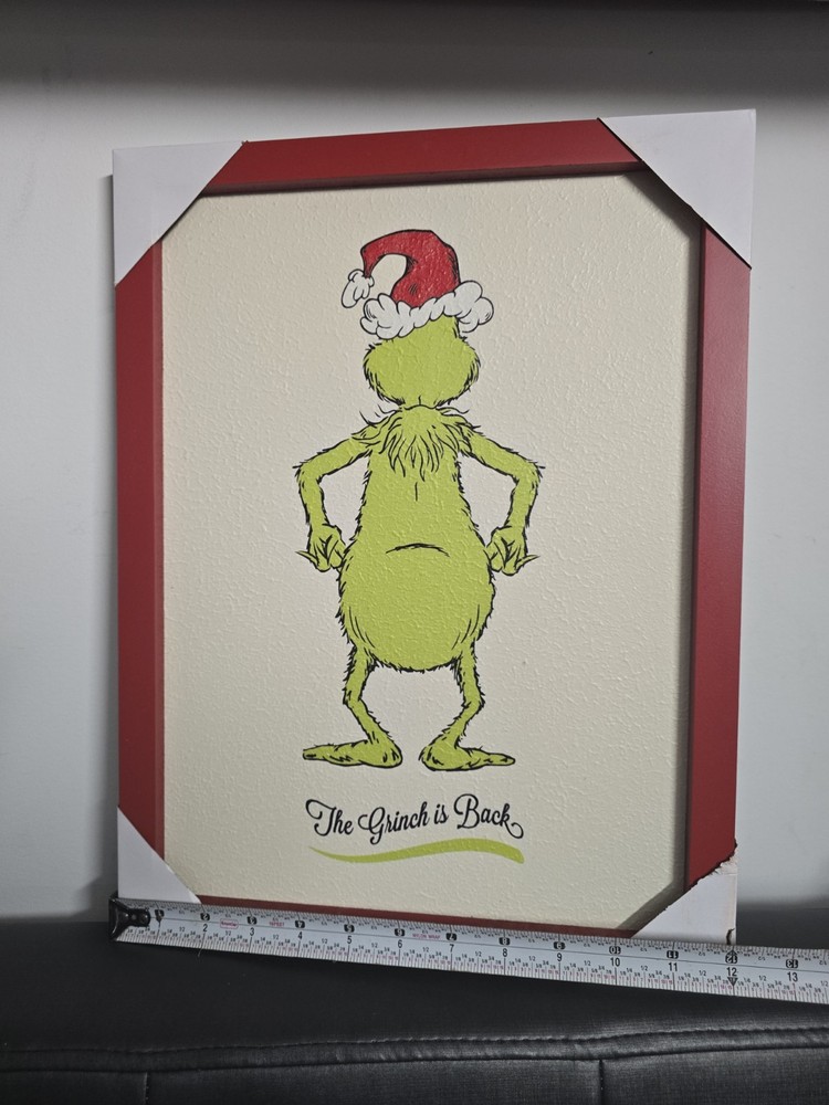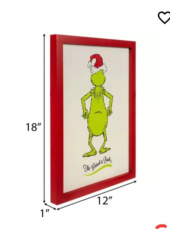 Guess who's back?! The Grinch Is Back Wall Decor features a textured image of your favorite holiday grump with his back turned. He has his hands on his hips and is wearing a red Santa hat that matches the red frame that it comes in. Under the character are the words "The Grinch Is Back" in black font. Pair this holiday decoration with other Grinch pieces for a whimsical display! Product Details ◦ Dimensions: 18" H x 12" W x 1" D ◦ Material: MDF ◦ Shape: Rectangle ◦ Color: Red, Green, Beige & Black Orientation: Vertical
