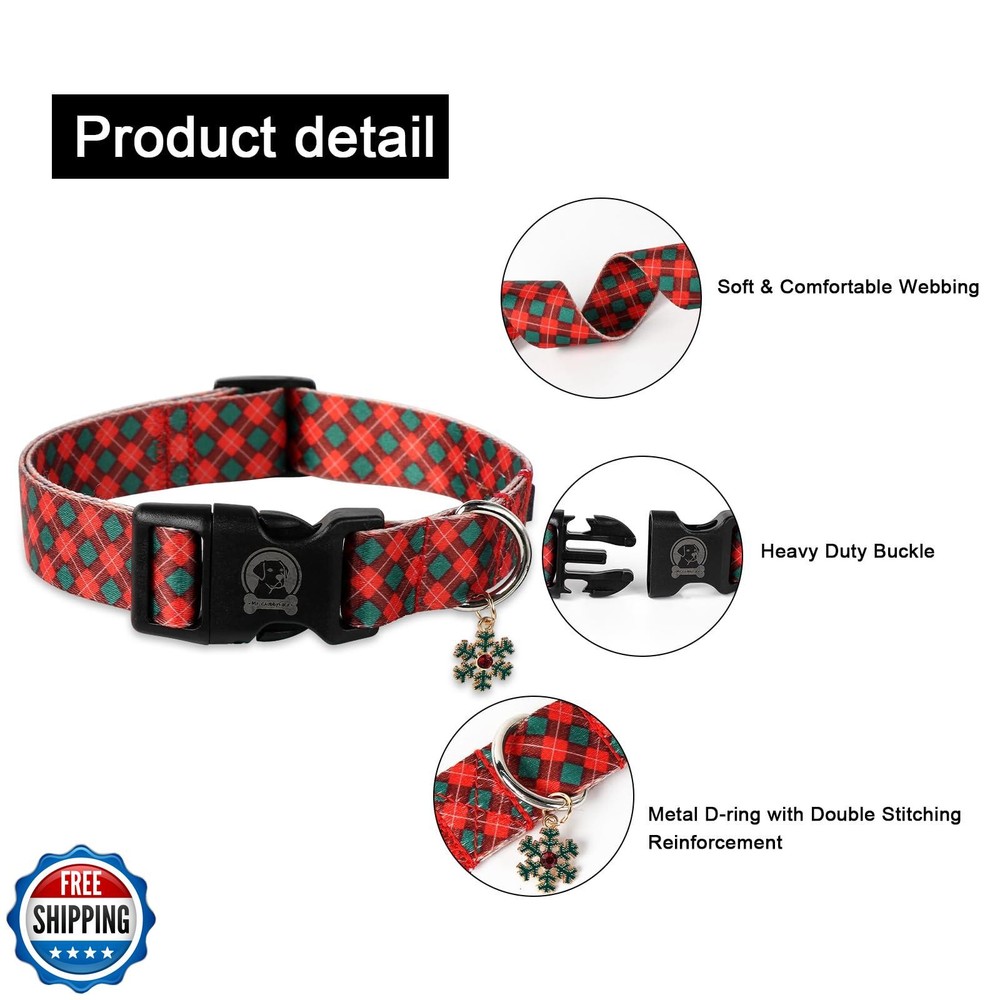 This festive plaid collar is perfect for the holidays! The adjustable fit works great for my medium-sized pup, and the durable polyester feels soft yet sturdy. The metal D-ring holds up well, even in wet weather. Love the classic red and black check—it’s stylish and cozy for winter walks. Highly recommend for a comfy, secure fit that looks adorable!