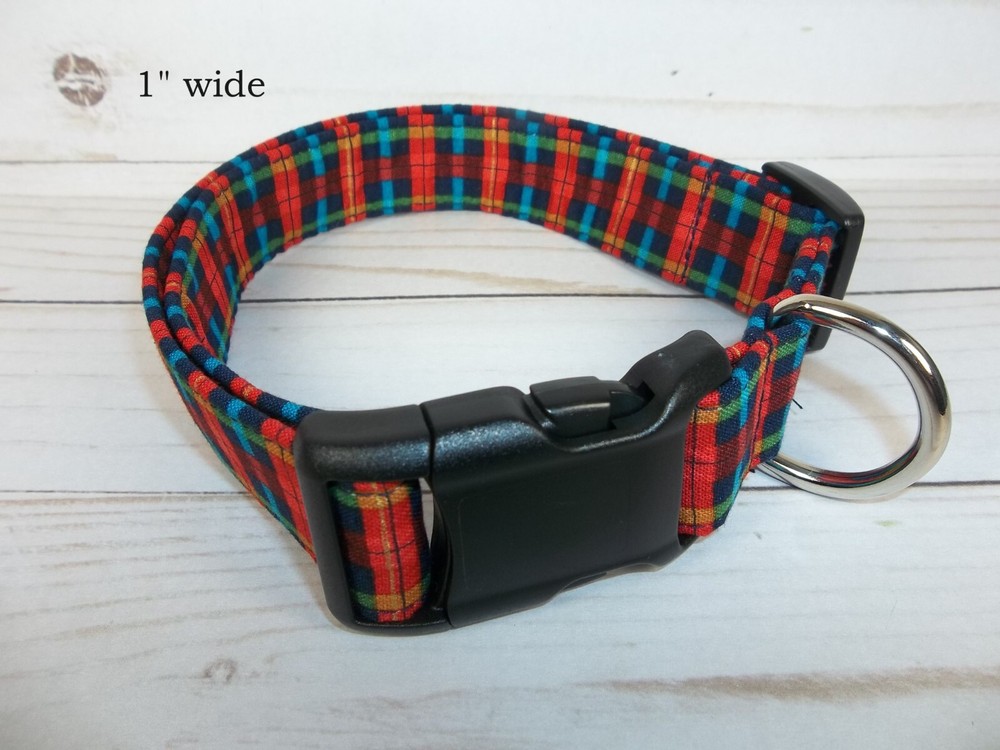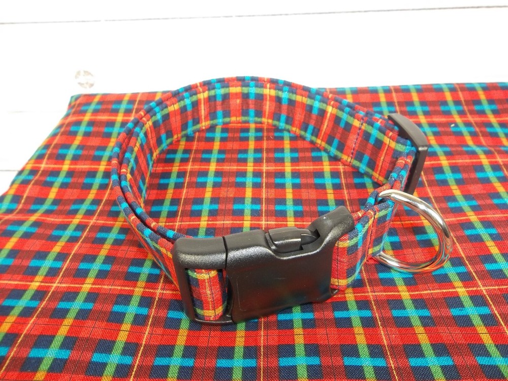 Christmas Plaid Dog Collar made by Terri's Dog Collars ♥ ♥ ♥ ♥ ♥ ♥ Each buy it now of this auction is for one handmade Terri's Dog Collar ~ size your choice Size: adjustable from 7 - 26" depending upon size chosen from the drop down menu Width: varies 5/8" wide 7 - 10" 5/8" wide 10 - 15 3/4" wide 10 - 15" 3/4" wide 12 - 17" 13 - 18" 1" wide 15 - 23" 1" wide 17 - 26" 1" wide 1.5" wide 15 - 23" 1.5" wide 17 - 26" Fabric: Red Navy Blue and Green plaid Webbing: Poly Pro Buckle: Heavy Duty Contoured Plastic side release We take great pride and care in making our dog collars. We sew high quality fabric over a Poly pro webbing for durability and strength and yet a great weight on your dog's neck. We also use a heavy duty welded D-ring so that your dog can pull as much as he / she wants when walking and you'll still be safe. We use a heavy duty contoured side release buckle. The contour feels great on your dogs neck and the heavy duty stands up to lots and lots of wear. Before you order, you need to measure your dog's neck and make sure it will fit. Please e-mail me with questions or special orders to be listed on ebay for you Other Details : You will receive a collar like in the pictures. The collar in the picture is 1" wide large but has been adjusted to the smallest size of 17". Your collar will be made when you order. We are smoke free / cigarette free work space. However, we do have dogs and love them very much. ♥ ♥ ♥ ♥ ♥ ♥ We accept eBay payments at this time. If you need to change your shipping address, please do so BEFORE you make your payment. Also, please attach any information that you think we will need, to your payment in the comments section. ♥ ♥ ♥ ♥ ♥ ♥ Shipping by first class mail with delivery confirmation: $4.75 We do combine shipping We ship Monday - Friday and will ship most orders within 2 business days (not calendar days) ♥ ♥ ♥ ♥ ♥ ♥ Thank you !!! Thank you for taking time to visit our auction and store. Happy eBaying !! Model NOT included: She just likes showing off her custom made collars !!!!