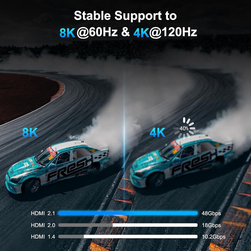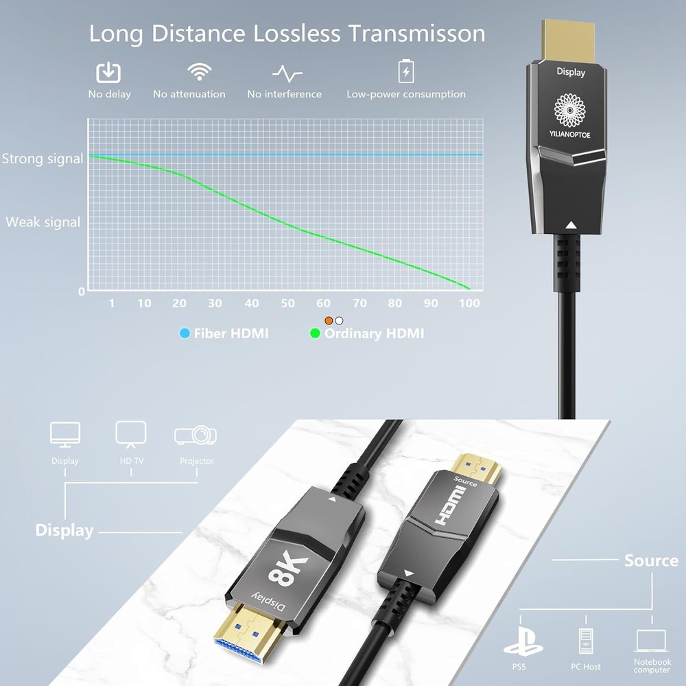 Fiber Optic HDMI Cable 50ft,8K Long 2.1 Cable,Ultra High Speed 50ft/15m Product Details Package Dimensions : 9 x 8 x 1.2 inches; 1 Pounds Manufacturer : YilianOptoe Brand: YilianOptoe Connector Type: HDMI Cable Type: HDMI Compatible Devices: Laptop, Monitor, PlayStation, Projector, Xbox Special Feature: Data Transfer, High Speed HDMI 2.1 Cable : YilianOptoe HDMI Cable made by German Chips.All of our Fiber HDMI Cables conforms to the standard HDMI 2.1 version. Backward compatible with HDMI 2.0/ 1.4/1.3/1.2/1.1. 8K HDMI Cable : HDMI cable 50ft supports high speed with 48 Gbps, 8K@60Hz, 4K@120Hz, Dynamic HDR, Dolby Vision, eARC, HDCP 2.2 and 2.3, 3D, 4:4:4 RGB, ALLM, QFT, QMS, VRR, DSC etc. Development direction of future cables. Excellent Construction : Active HDMI cable with 24K gold plated connectors and contains four fiber optic strands in an insulated pvc housing. Designed for long-distance transmission while maintaining high-speed, stable data transmission. Long Distance Lossless Transmission : Ultra-HD fiber optic hdmi cable can achieve lossless transmission. The longest transmission distance of up to 300m, reach 48Gbps. Withstands over 25,000+ bends, greatly extended use life. One-Way Transmission : The ultra high speed HDMI cable features a male-to-male connection, enabling unidirection transmission from the source to the display. The SOURCE port connects video devices such as TV boxes, PS5, PS4, Blu-ray players, Xbox Series, laptops, and more. The DISPLAY port connects display devices such as TVs, displays, projectors, monitors, and more. Ensure both ends are inserted correctly, otherwise no image will be received from the device. For Gamer Lovers : Compared to 4K HDMI cable, the 8K HDMI cable offers an improved Audio Return Channel (eARC), ensuring high-resolution sound and the highest audio quality. Our 8K HDMI cable achieves a super-smooth picture with 8K@60Hz and 4K@120Hz. The latest Game Mode supports a variable refresh rate and maximizes the performance of the graphics card and CPU for a smoother and more detailed picture.