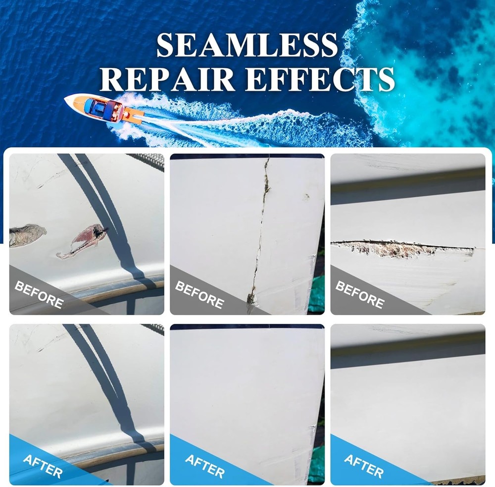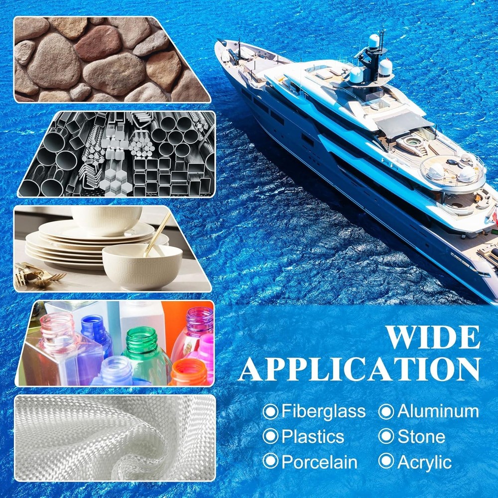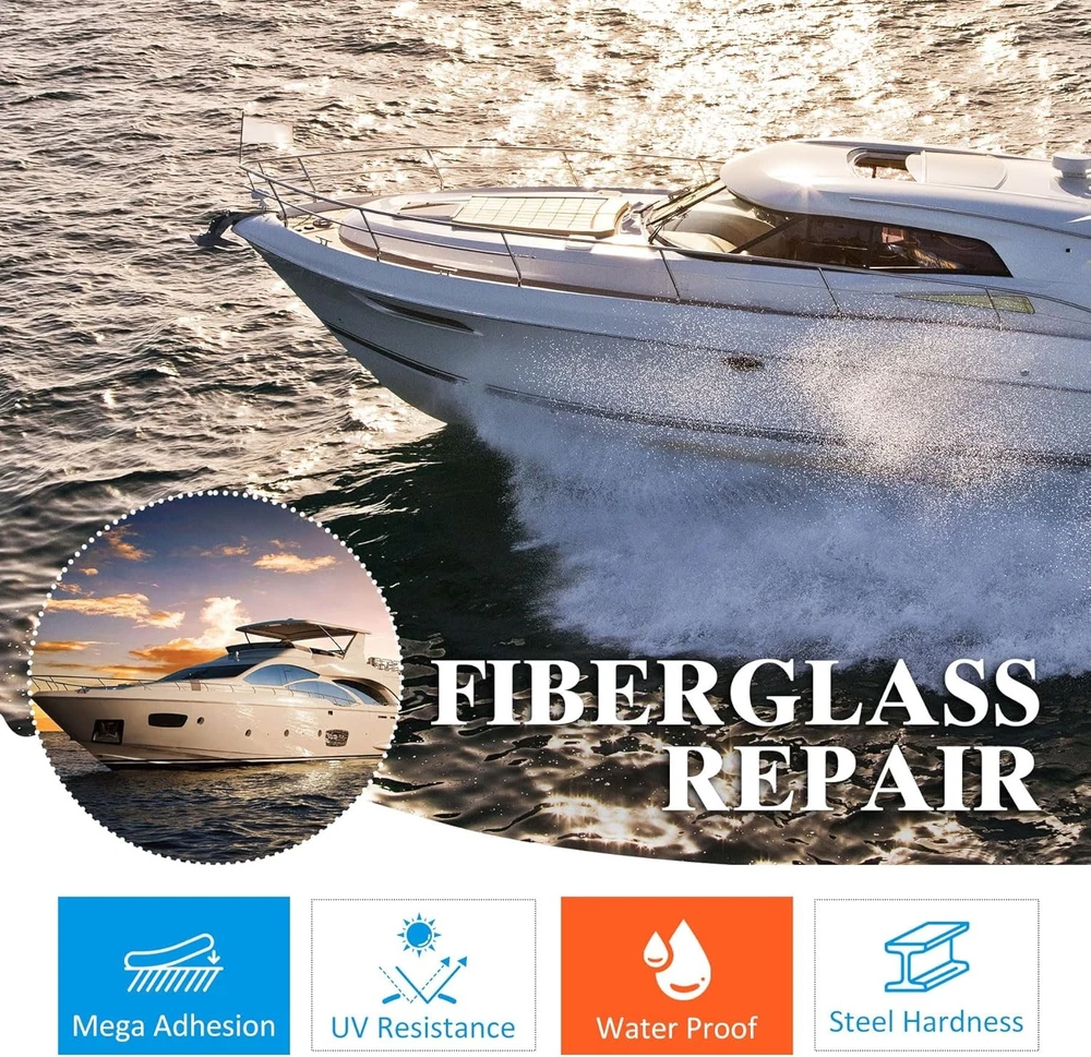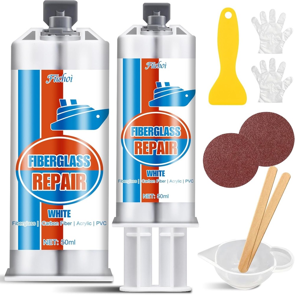 Restore your marine gear and more to like-new condition with our professional white epoxy fiberglass repair kit. Specially formulated for boats, surfboards, yachts, skis, and fishing rods, this high-performance adhesive delivers military-grade durability while remaining versatile enough to repair PVC, ceramic, wood, carbon fiber, and acrylic surfaces. Whether you're fixing cracks, holes, or deep scratches, our kit provides everything you need for long-lasting, waterproof, and UV-resistant repairs that withstand the harshest marine environments. Versatile Fiberglass Repair Kit: Our Marine Fiberglass Filler is designed to fix cracks, holes, and scratches on boats, surfboards, yachts, snowboards, and fishing rods. It also works wonders on PVC, ceramic, wood, carbon fiber, and acrylic surfaces, making it a must-have for any DIY enthusiast or professional repairer. Exceptional Durability & Protection: Made with premium materials, our Fiberglass Resin Kit is waterproof, heat-resistant, and ultraviolet, ensuring long-lasting repairs that withstand harsh conditions. It's also non-toxic and eco-friendly, prioritizing safety without compromising performance. All-Inclusive Repair Package: The White Gel Coat repair kit comes complete with 2x50ml Fiberglass Repair Glues, 4 stirrers, 1 silicone cup, 2 pairs of gloves, 1 scraper, 1 push rod and 2 sandpapers.This comprehensive set simplifies the repair process, eliminating the need for multiple purchases and ensuring you have all the necessary tools at your fingertips. Easy-to-Use: Clean the area, mix the A&B components in a 1:1 ratio with the included stirring sticks, apply, and smooth with the scraper. And let stand for 24 hours to cure. Sand the retimpaired area for a flawless finish. Satisfaction Guaranteed: We stand behind our Fiberglass Tub Repair Kit and offer exceptional after-sales service. If you have any questions or concerns during or after the repair process, our dedicated customer support team is here to help.