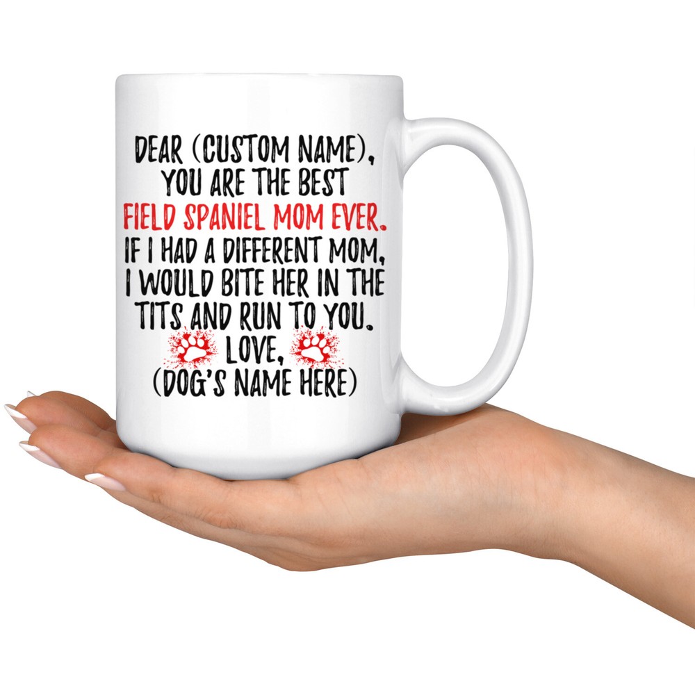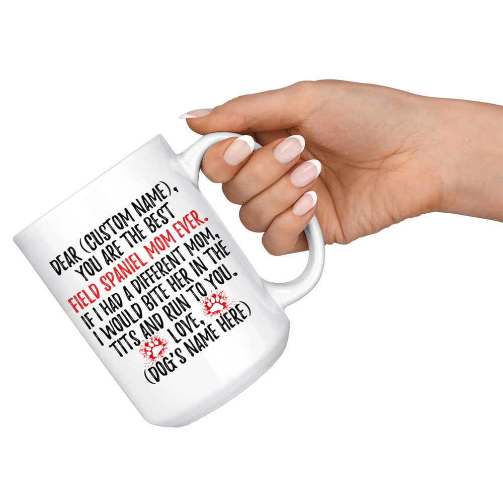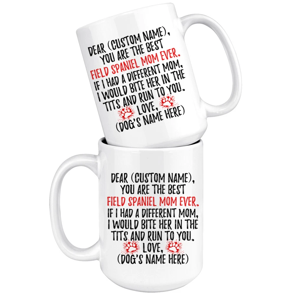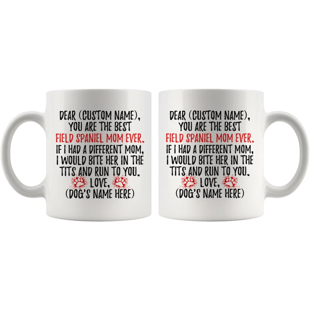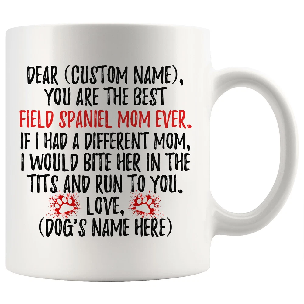personalized field spaniel mug, field dog coffee mug, field spaniel dog gifts, field spaniel mom present gift, field spaniel mommy mug, field spaniel owner mug, i love field spaniel, custom field spaniel gift, dog coffee cup, mothers day gift This is the perfect coffee mug with content "DEAR 'CUSTOM NAME', YOU ARE THE BEST FIELD SPANIEL MOM EVER. IF I HAD A DIFFERENT MOM, I WOULD BITE HER IN THE TITS AND RUN TO YOU. LOVE, 'DOG'S NAME HERE' ". CUSTOM MOM'S NAME AND DOG'S NAME Please put the mom's name and dog's name in the notes at the checkout or send us a message. By not doing this, it will delay your order. Example: Mom's Name: Mary; Dog's name: Charlie PERFECT FUNNY GIFT FOR A FIELD SPANIEL DOG MOM! This special coffee cup can be a great gift for every Field Spaniel mom. DISHWASHER AND MICROWAVE SAFE! This version of ceramic mug shows it's true colors with quality assurance to withstand heat in the microwave and put it in the dishwasher as many times as you like, the quality will not be Altered. THE MUG DESIGN IS PRINTED ON BOTH SIDES! No matter if you hold your teacup in your right or left hand, you and everyone else will be able to see this unique design. Looking at this cute coffee mug will put a smile on everyone's face! We want you to be 100% satisfied, so please let us know if there is anything wrong with your order so we can fix it right away.