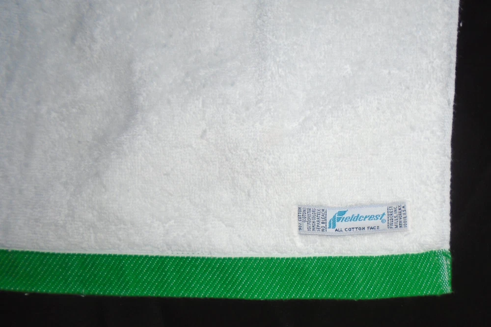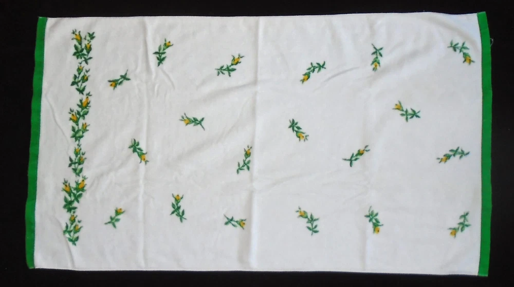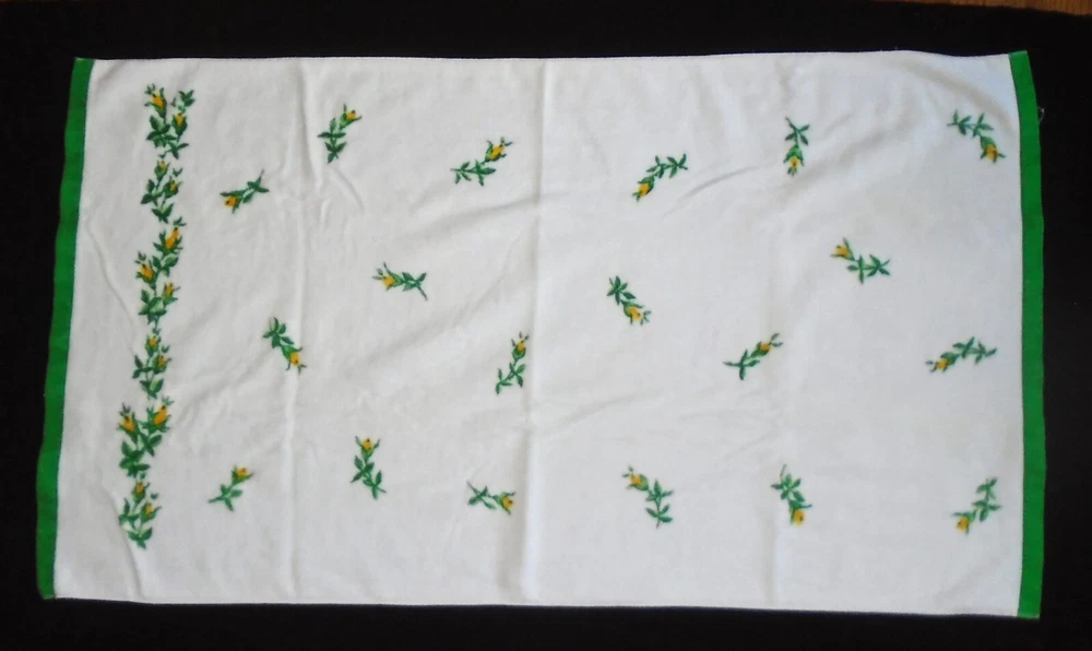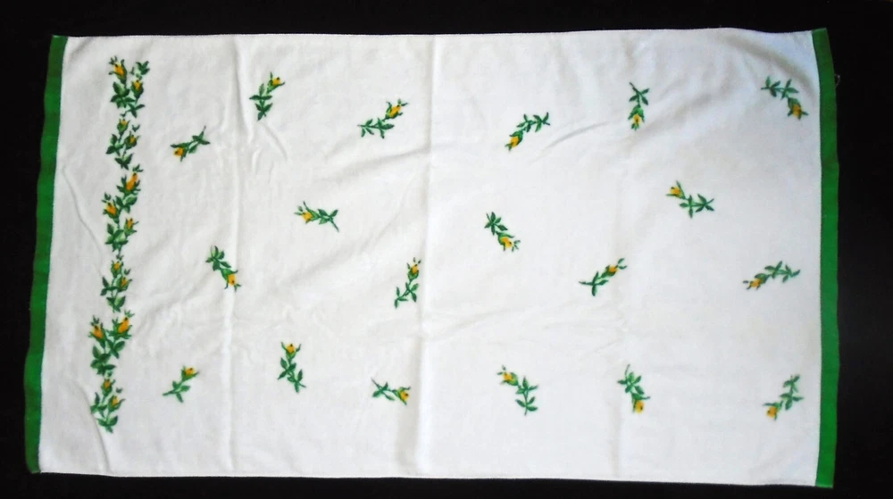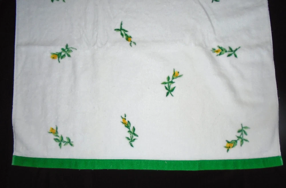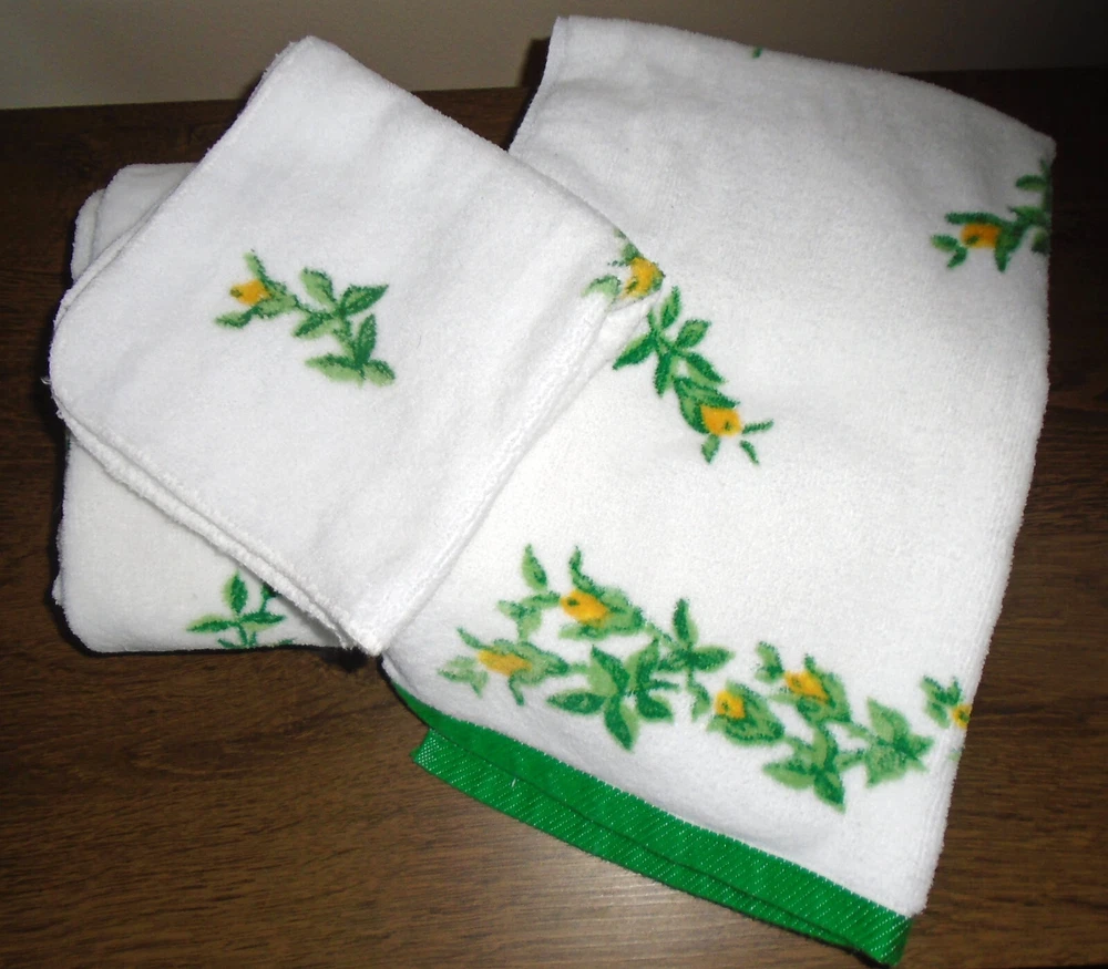 Add a touch of vintage charm to your bathroom with this Fieldcrest towel set. The set includes a washcloth, hand towel, and two bath towels, all made from a cozy cotton blend material. The yellow flower buds design on a white background adds a cheerful touch to your bathroom decor. Perfect for collectors or anyone looking to add a vintage touch to their home. White with green bands on the ends. Beautiful yellow budding flowers. The bath towels measure 46" x 26", the hand towel measures 25 1/2" x 15 1/2" and the washcloth is standard. Includes 2 bath towels, one hand towel and one washcloth. Some very light wear. Colors are bright. We Ship within 24 hours of payment IMPORTANT: If you need an item shipped at a later date please contact me before paying