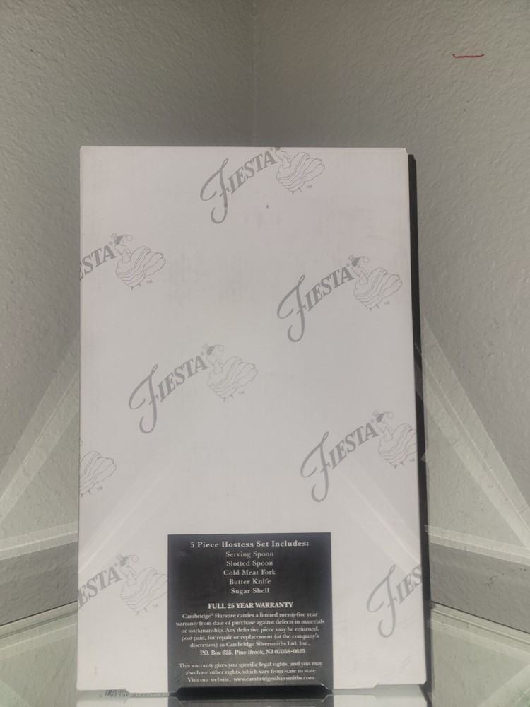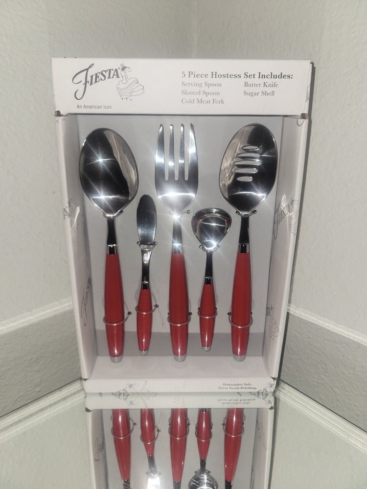 The Fiesta Fatware 5-Piece Hostess Set is a stylish and versatile flatware collection, ideal for any dining occasion. This set includes a serving spoon, slotted spoon, cold meat fork, butter knife, and sugar shell, providing all the essential utensils for hosting. Each piece features a red design, adding a vibrant touch to your table setting. Brand new and crafted with durable materials, this hostess set combines functionality with a modern aesthetic, making it a perfect addition to any kitchen or dining experience.